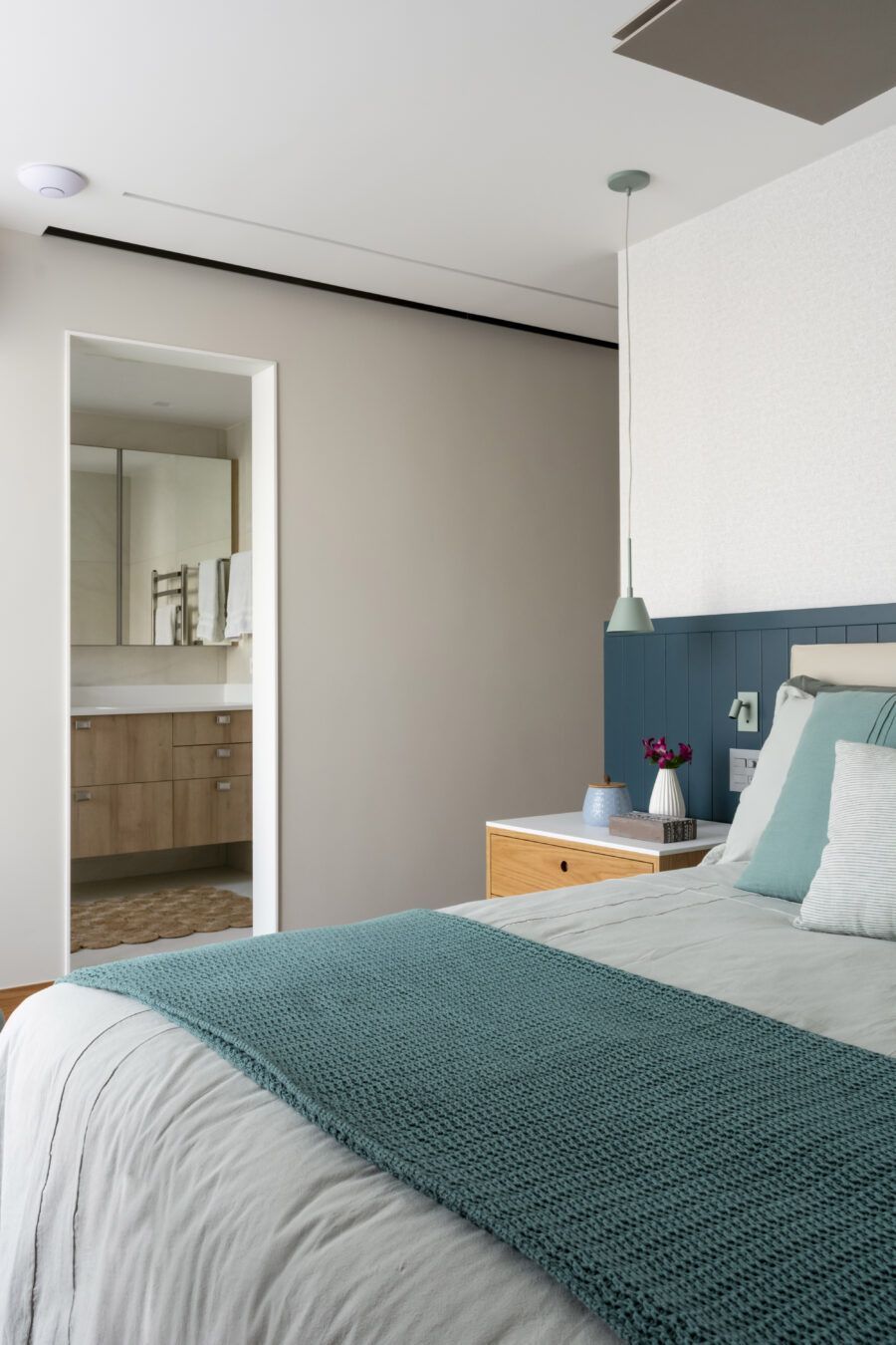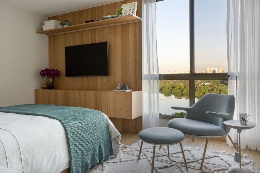 “Eles queriam eliminar o banheiro de uma das suítes para ampliar a suíte deles, integrar a sala com a cozinha e instalar uma ilha nela. Também pediram para usar azul na decoração, um escritório para ele e um escritório menor para ela, que pudesse ser usado também como quarto de hóspedes.”