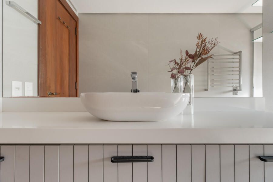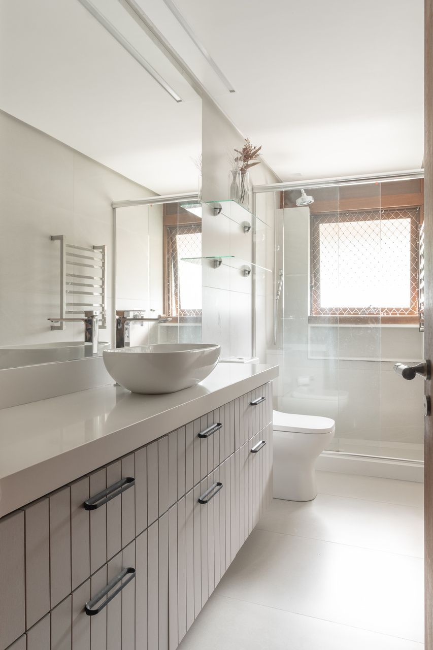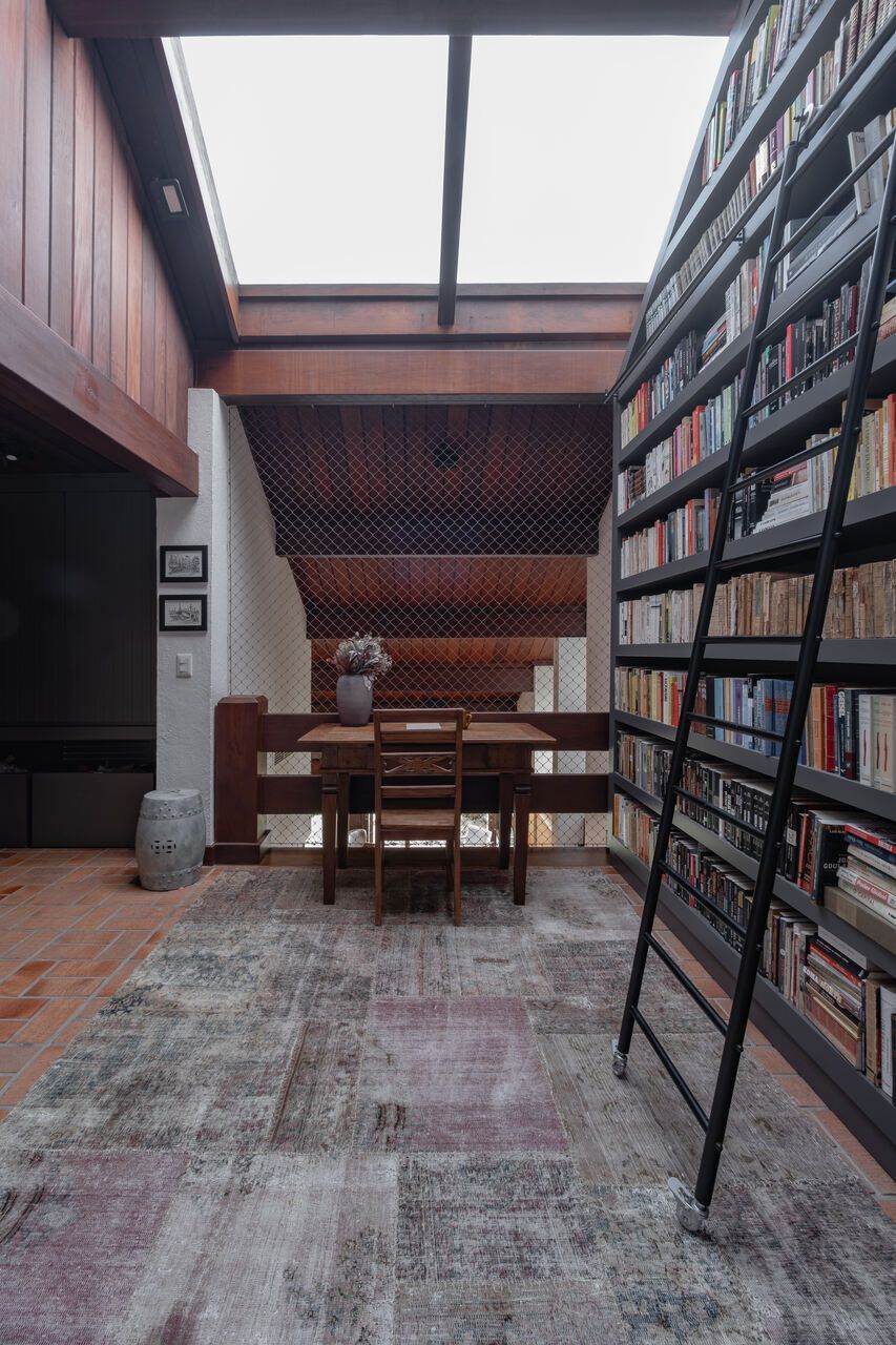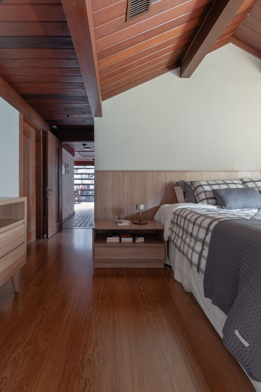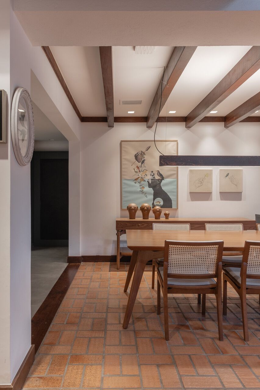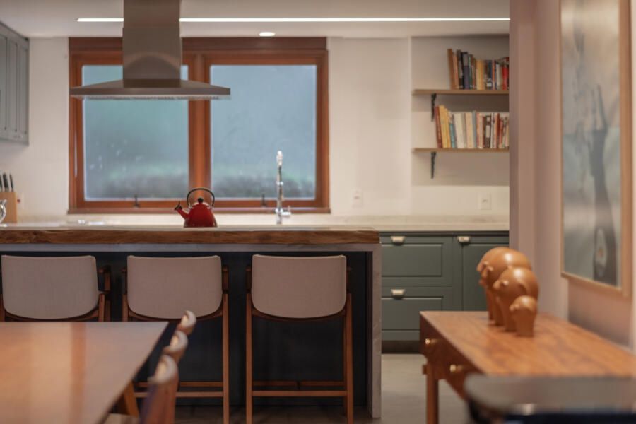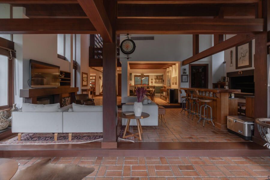Além da renovação da cozinha, todos os banheiros passaram por atualizações para oferecer mais conforto e praticidade. Pequenos ajustes na marcenaria foram realizados para otimizar os espaços. Um dos destaques do projeto foi a reformulação do projeto luminotécnico, que teve um papel fundamental na valorização da arquitetura existente. A nova iluminação realçou elementos como o forro de madeira e o piso de plaquetas de tijolo na área social, preservando e destacando a essência original da construção.