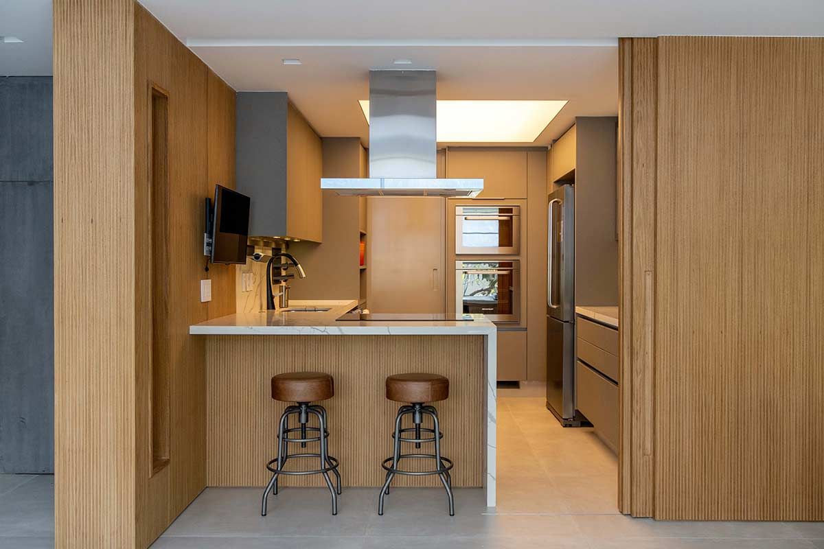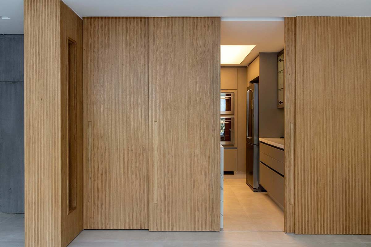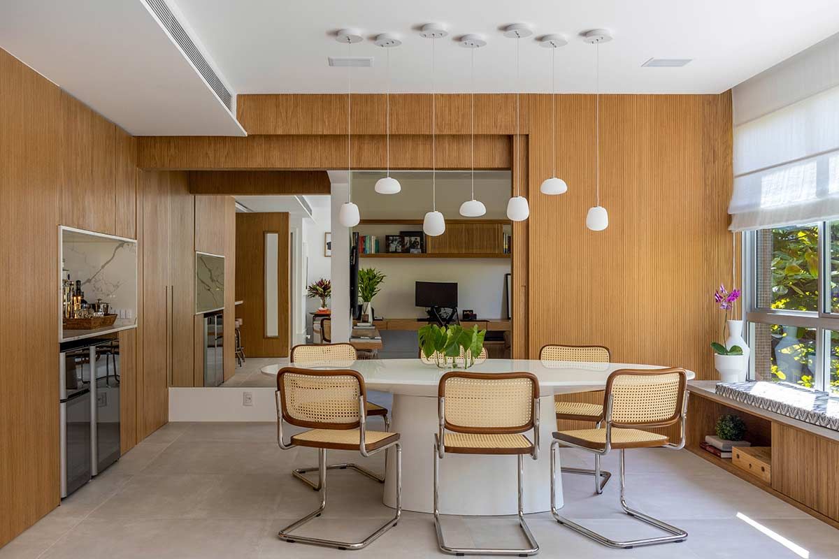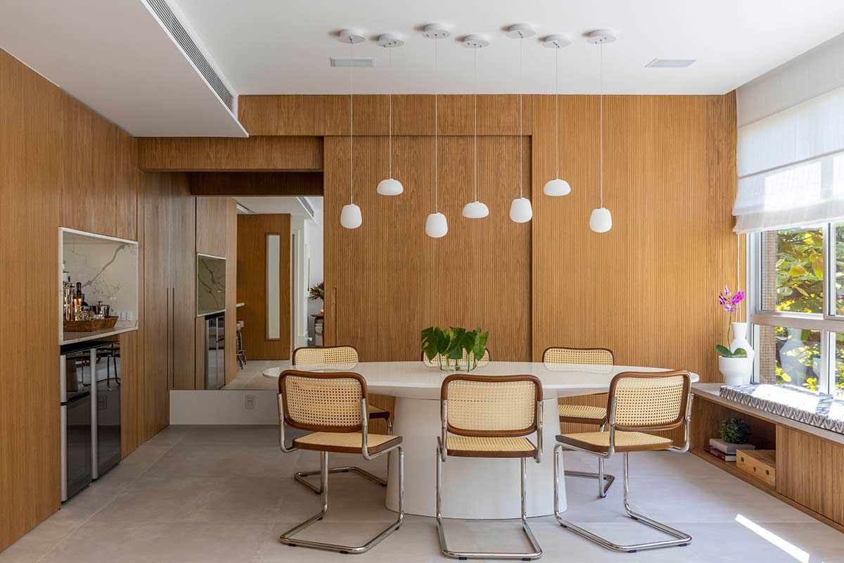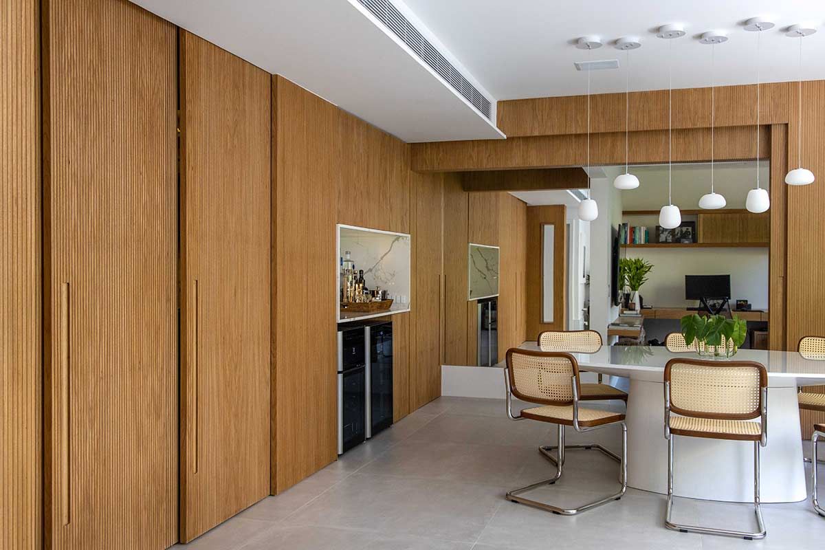 Desenhamos portas e painéis que servem tanto para integrar, quanto para separar os espaços, de acordo com o uso. A madeira freijó, escolhida para revestir esses elementos, foi a responsável por aquecer e unificar o décor.