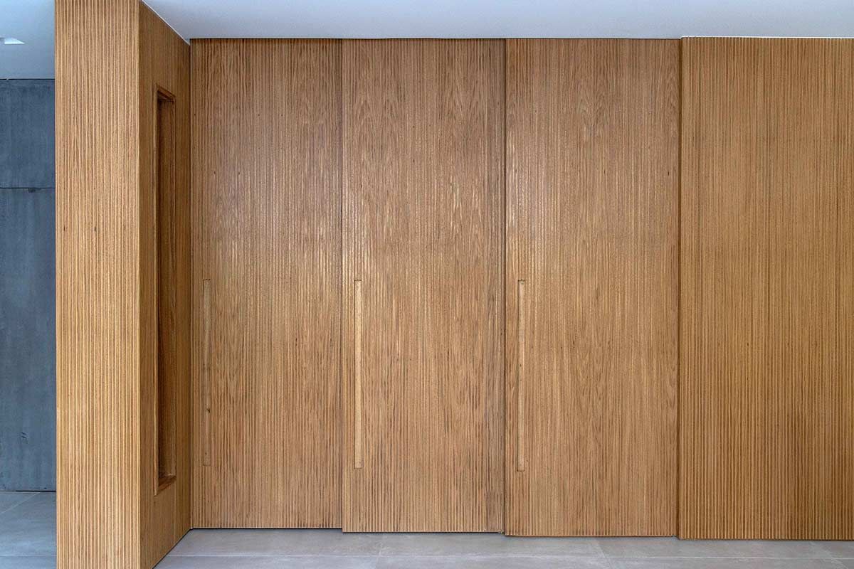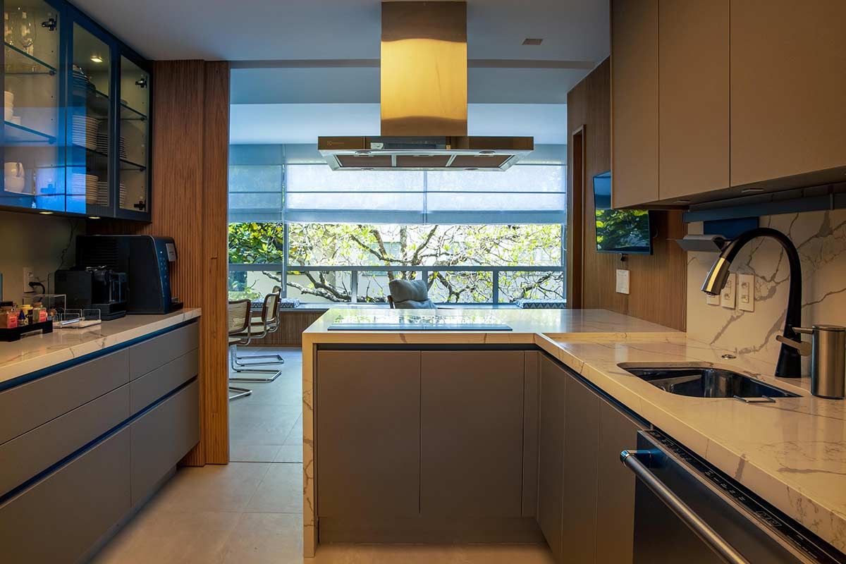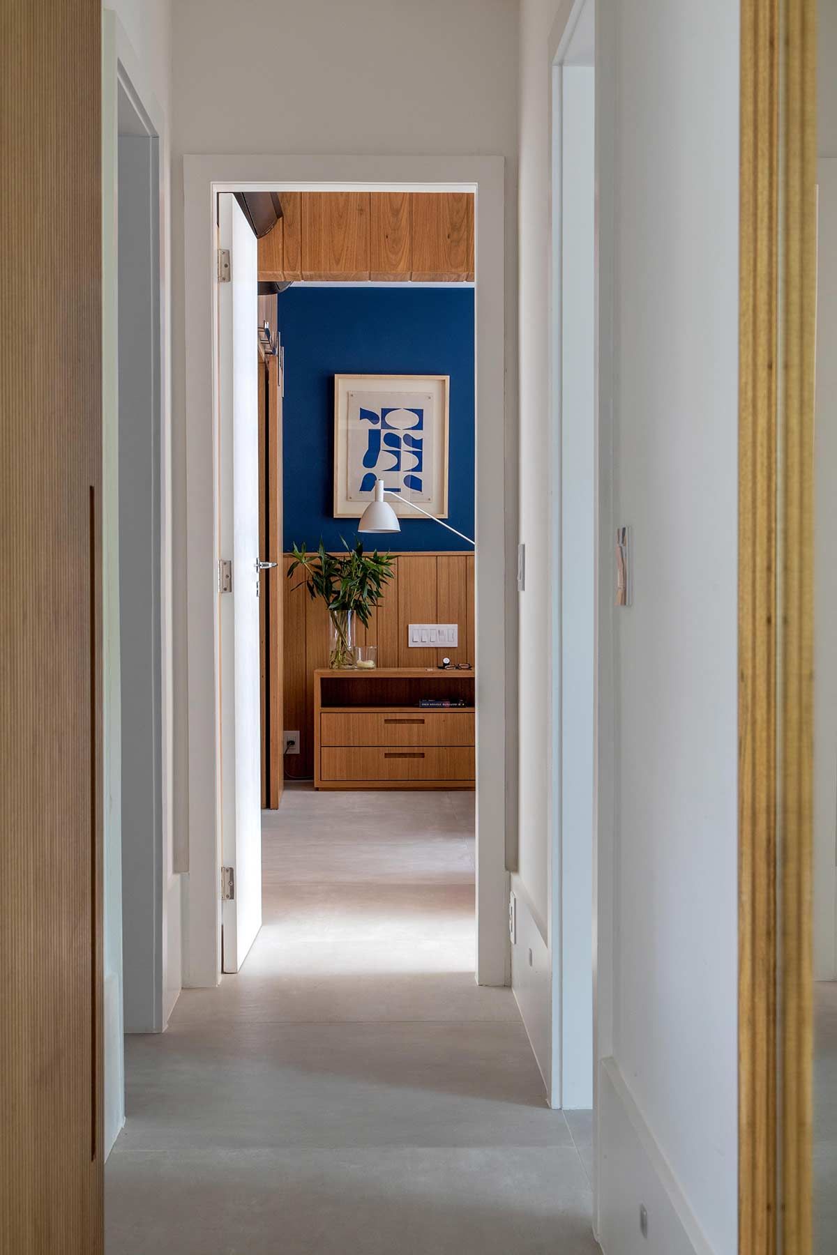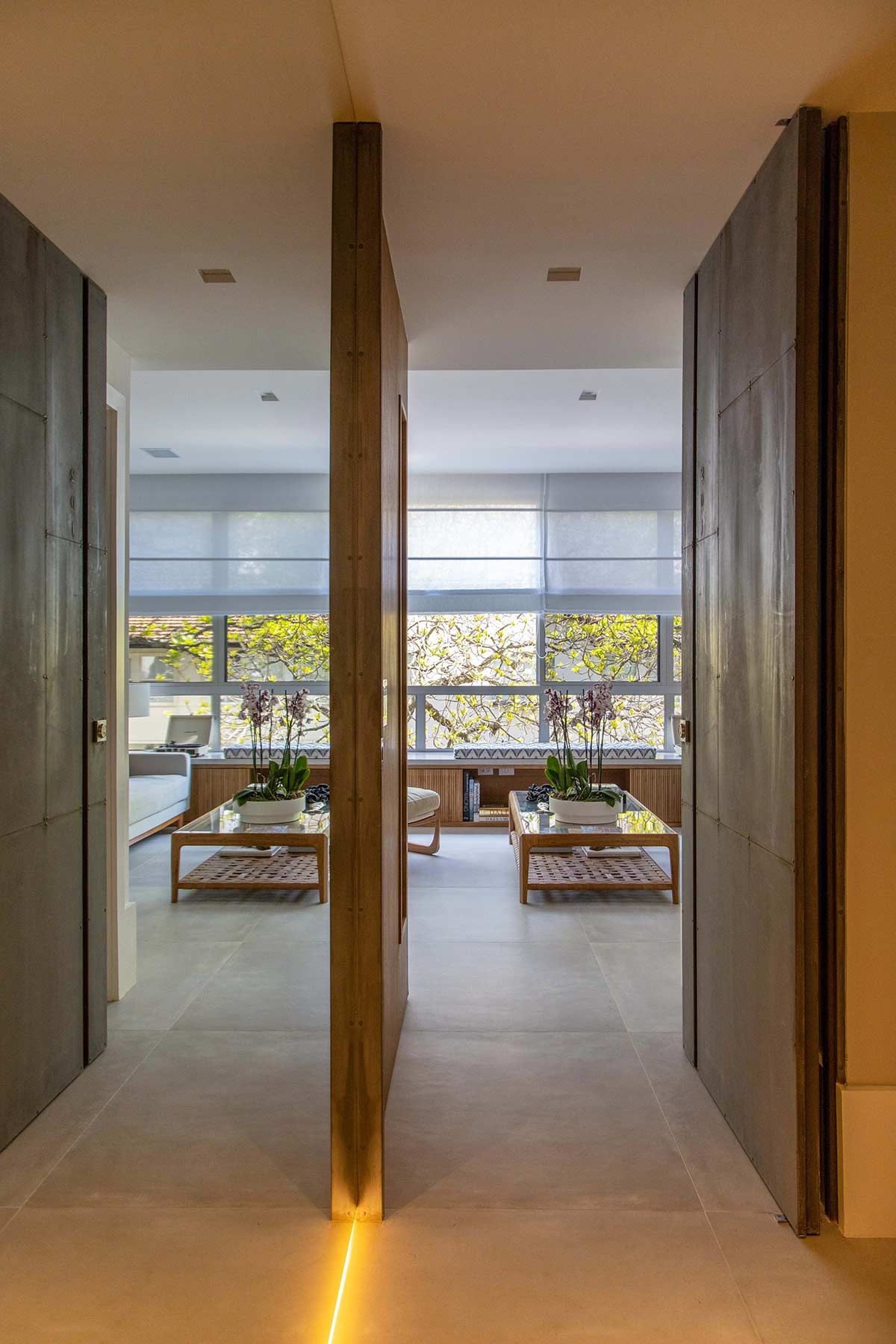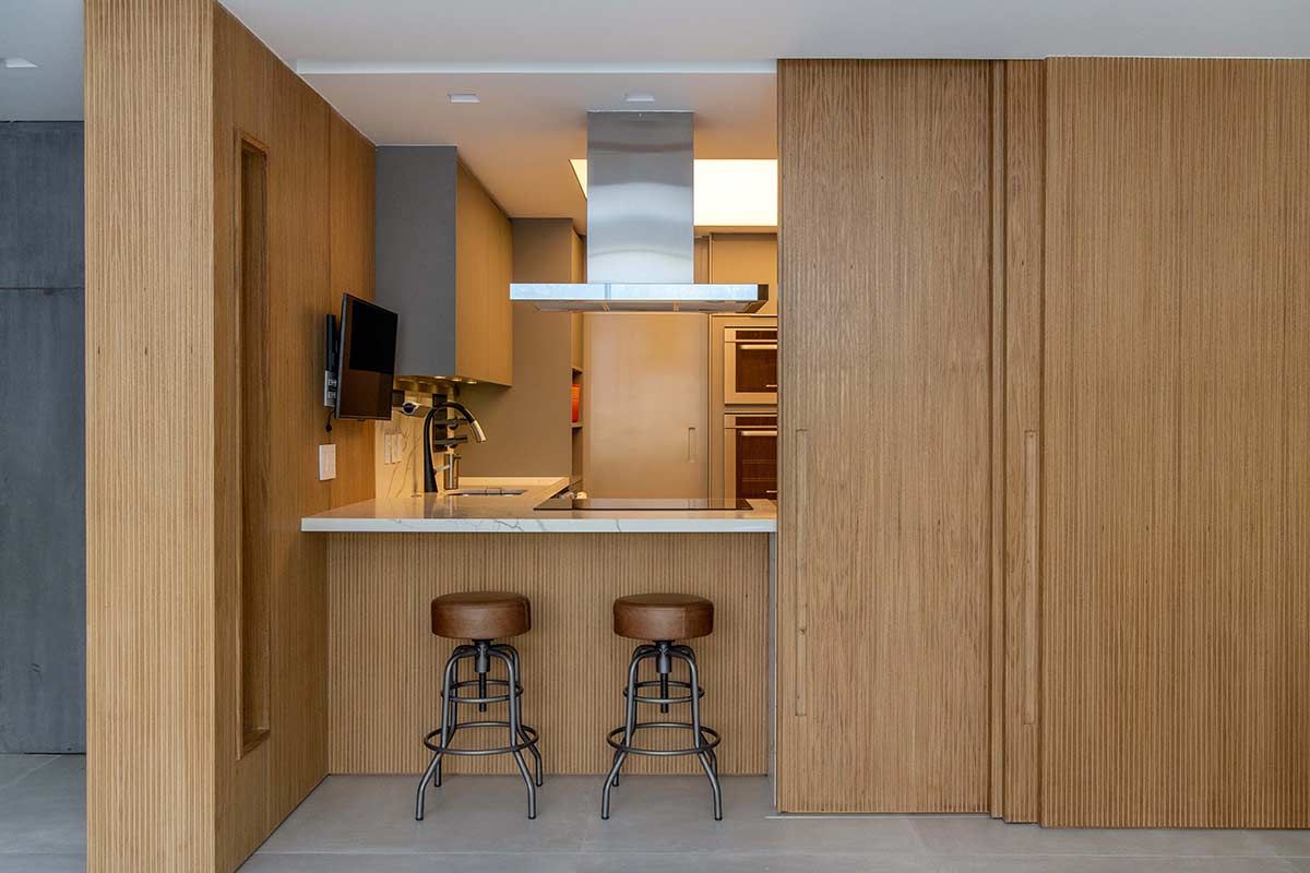 Desenhamos portas e painéis que servem tanto para integrar, quanto para separar os espaços, de acordo com o uso. A madeira freijó, escolhida para revestir esses elementos, foi a responsável por aquecer e unificar o décor.