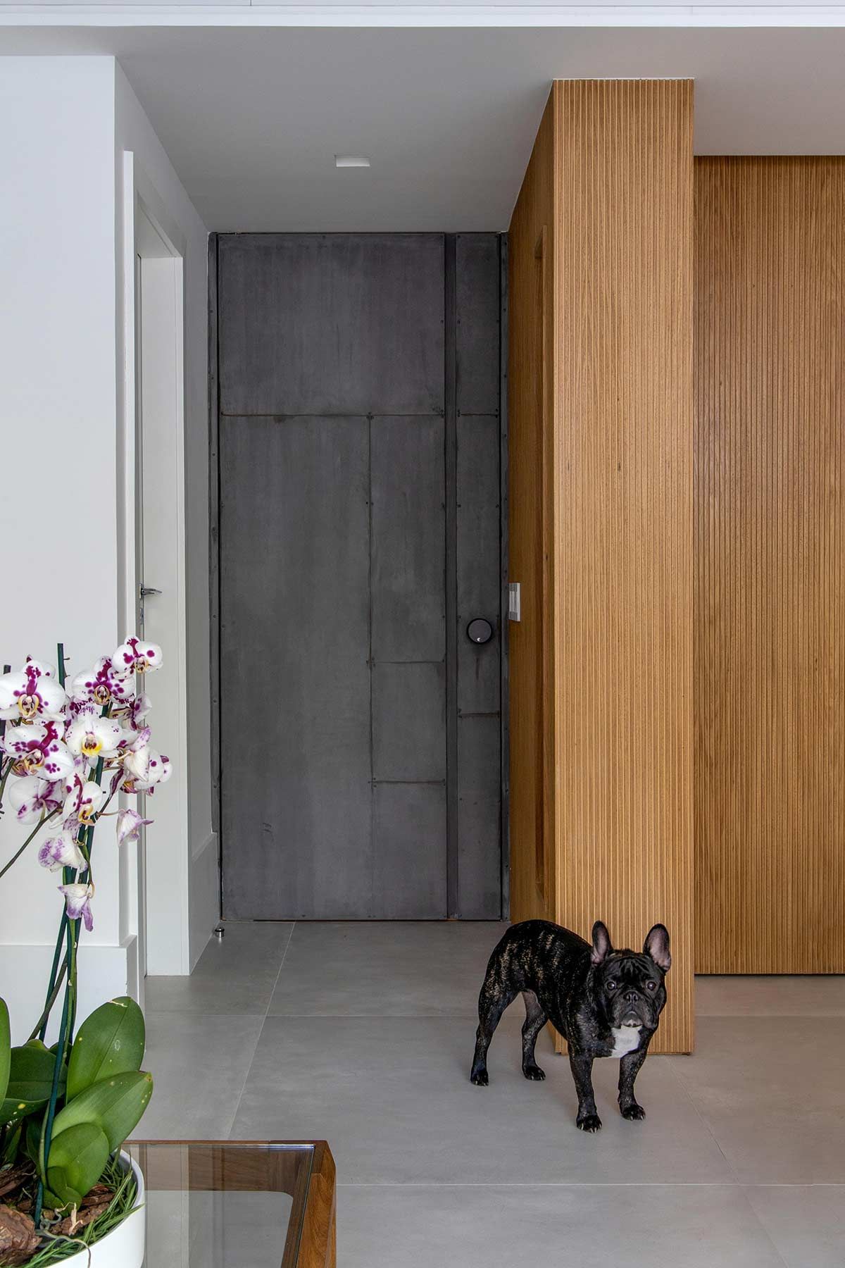 O apê ganhou uma área social com estar, sala de TV, escritório, jantar e cozinha integrados, além de uma suíte máster com closet e quarto de hóspedes. A porta de entrada recebeu uma pintura especial que remete ao aço, com ares contemporâneos e bem convidativos. Pensando em recepcionar os convidados com conforto e descontração, um grande banco aparece no estar, fazendo as vezes de assentos extras, além de funcionar como mais um lugar para expor objetos.
