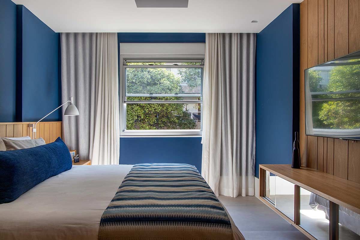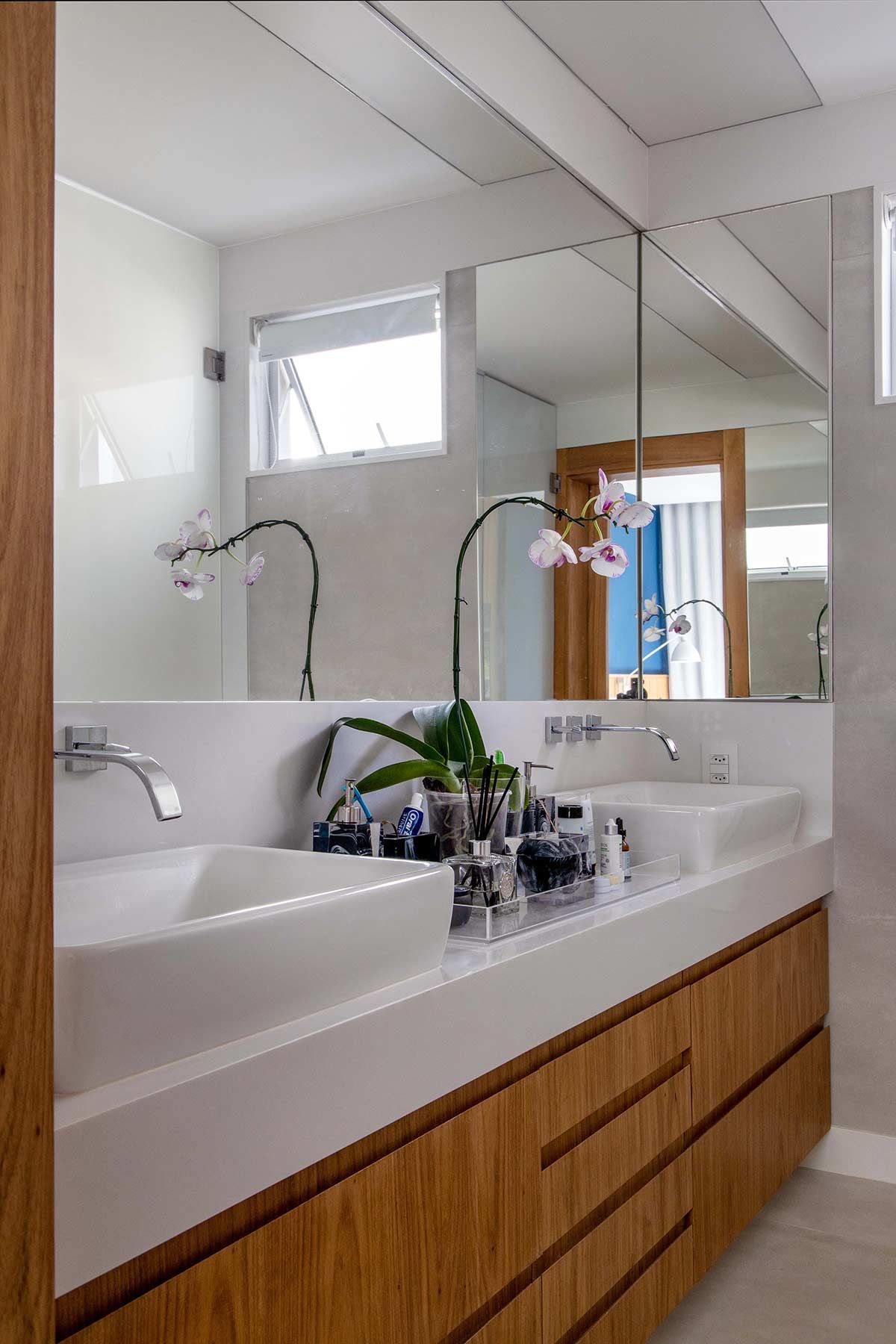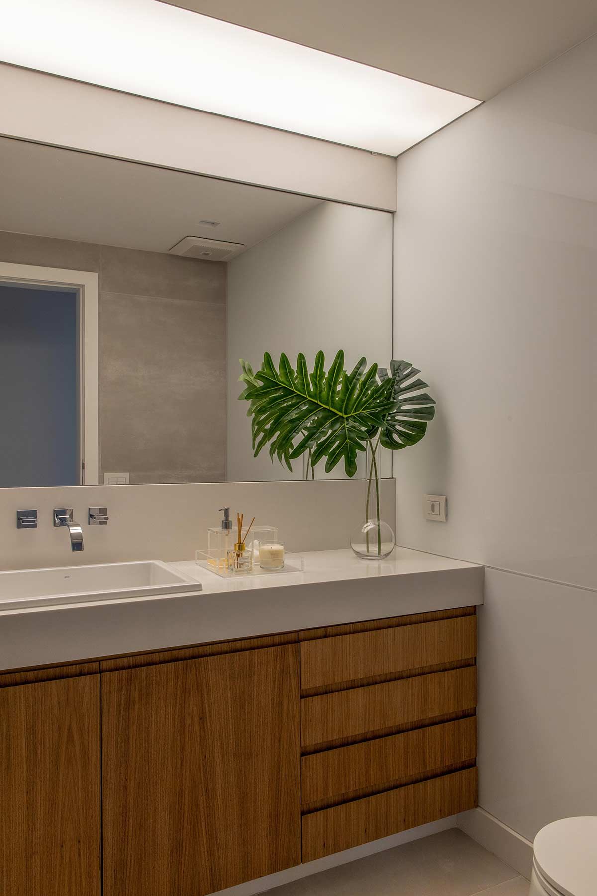 Na suíte máster, algumas intervenções também aconteceram. Criou-se um banheiro espaçoso para o casal com uso simultâneo, onde o compartimento do vaso sanitário é separado da área do banho, que é separada da parte de bancada; e um dos quatro dormitórios virou o closet, desenvolvido em marcenaria. Por fim, o quarto de hóspedes foi mantido, prevendo a chegada de um filho no futuro, e a decoração nasceu de móveis e peças que os moradores já possuíam antes da mudança para o novo lar.