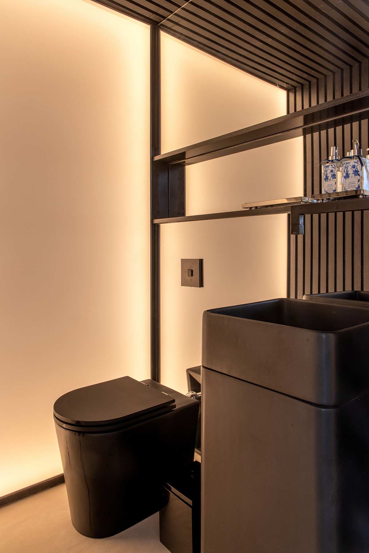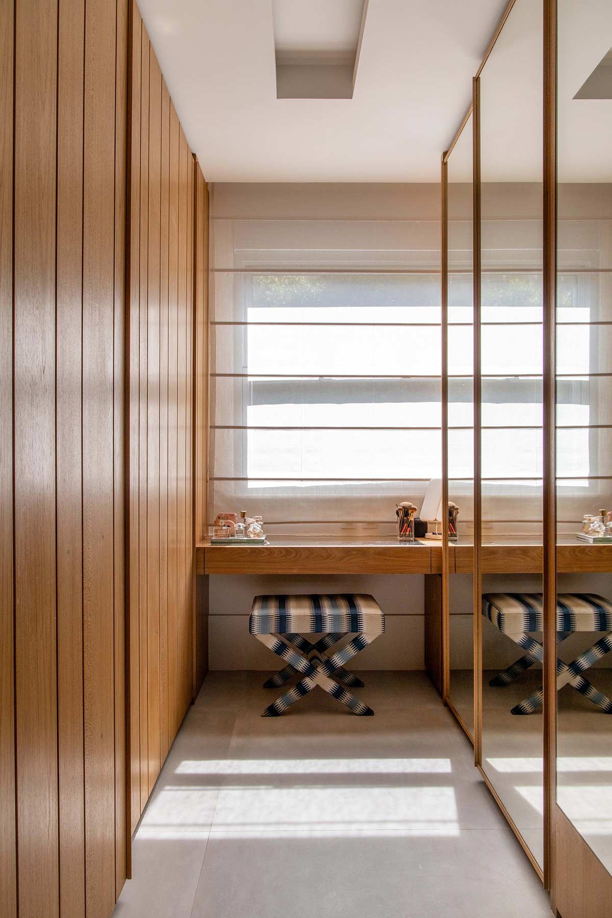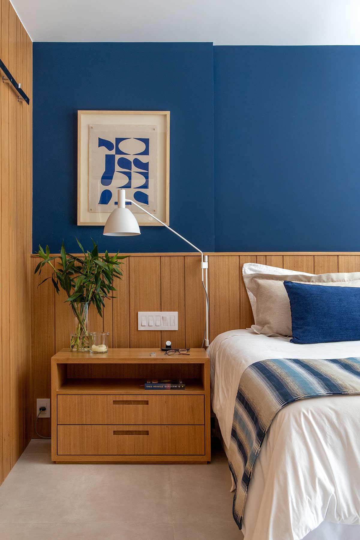 Na suíte máster, algumas intervenções também aconteceram. Criou-se um banheiro espaçoso para o casal com uso simultâneo, onde o compartimento do vaso sanitário é separado da área do banho, que é separada da parte de bancada; e um dos quatro dormitórios virou o closet, desenvolvido em marcenaria. Por fim, o quarto de hóspedes foi mantido, prevendo a chegada de um filho no futuro, e a decoração nasceu de móveis e peças que os moradores já possuíam antes da mudança para o novo lar.