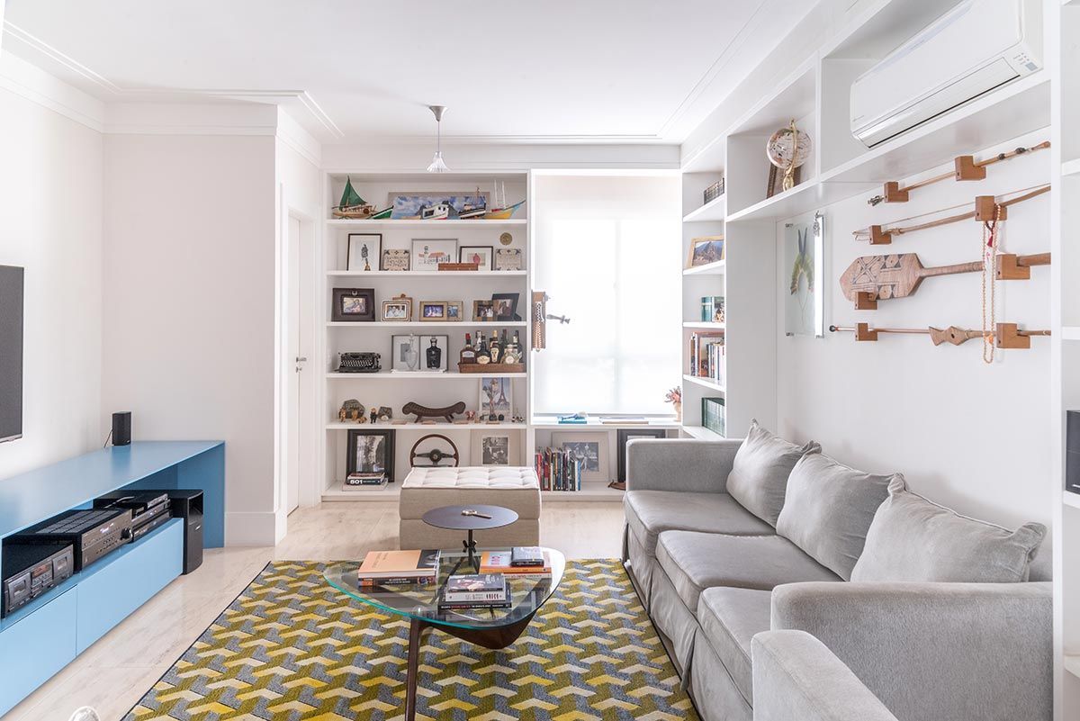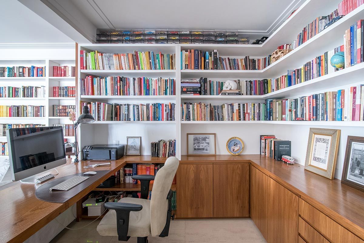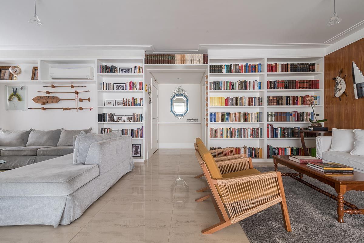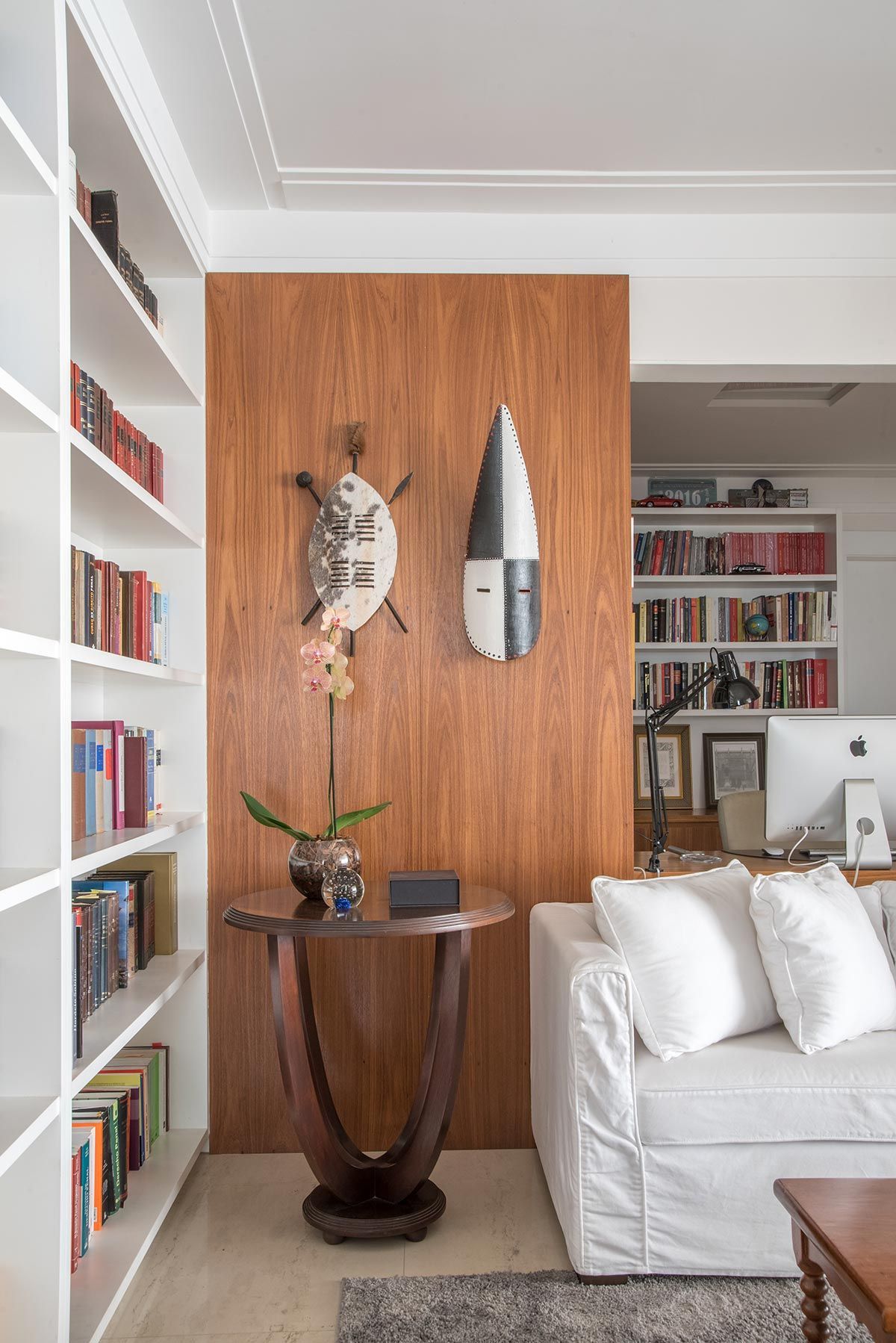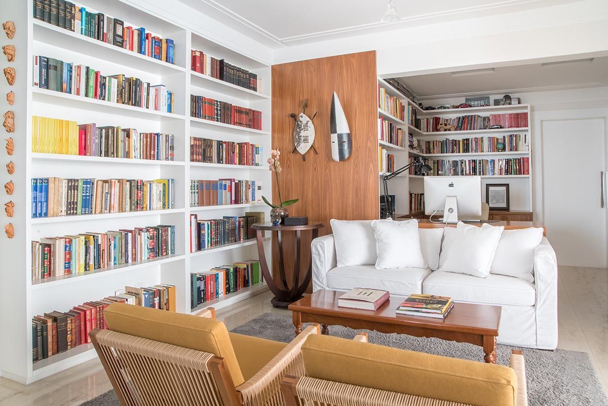 Tudo começou pelo pedido principal do morador, um advogado de 40 anos: abrigar seus dois mil livros e coleções. Quando ele chegou à arquiteta Isabella Nalon, sua intenção era transformar uma das três suítes do apartamento no Morumbi em escritório, para armazenar os exemplares. Ao invés disso, a profissional sugeriu que o home office fosse integrado com a sala, para que os livros fizessem parte da decoração de todos os ambientes, e ele pudesse sempre estar em contato com seus objetos prediletos. Essa inclusive, foi uma premissa deste projeto: desfrutar do apê vislumbrando aquilo que mais gosta, com prazer e qualidade de vida.