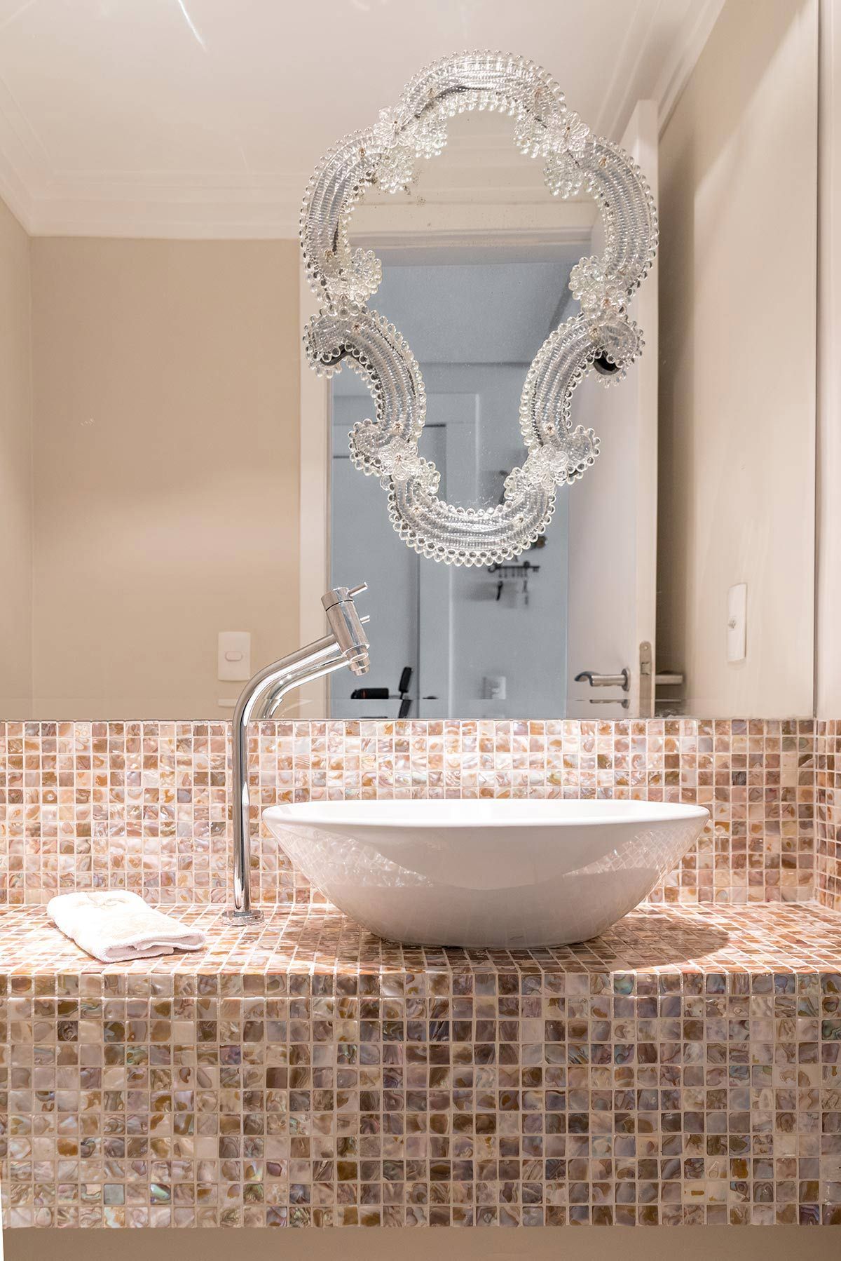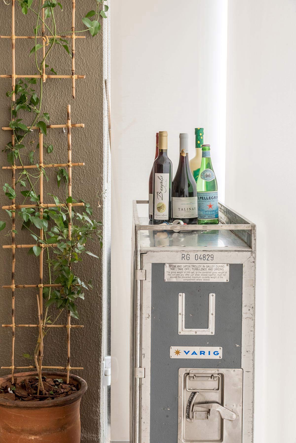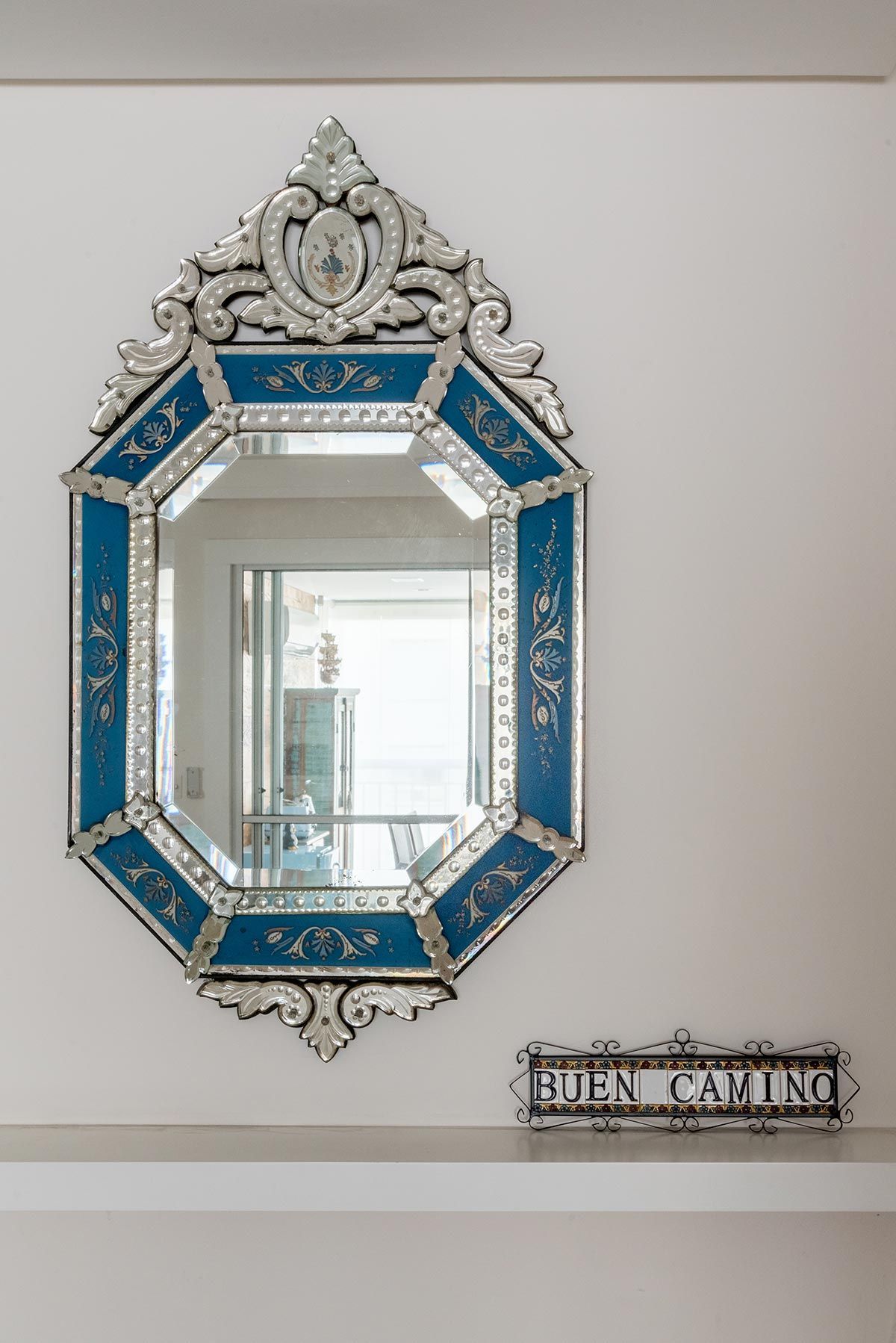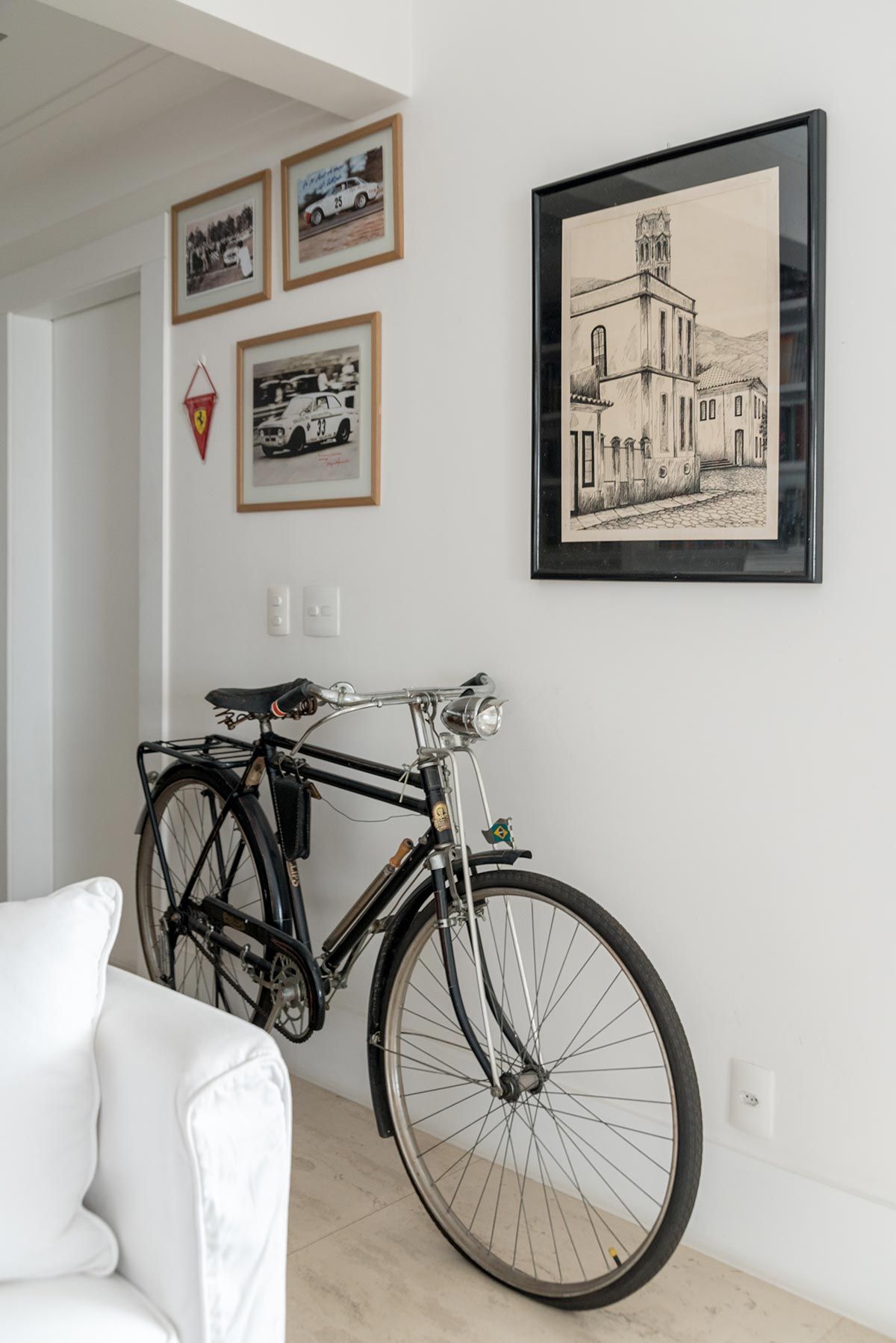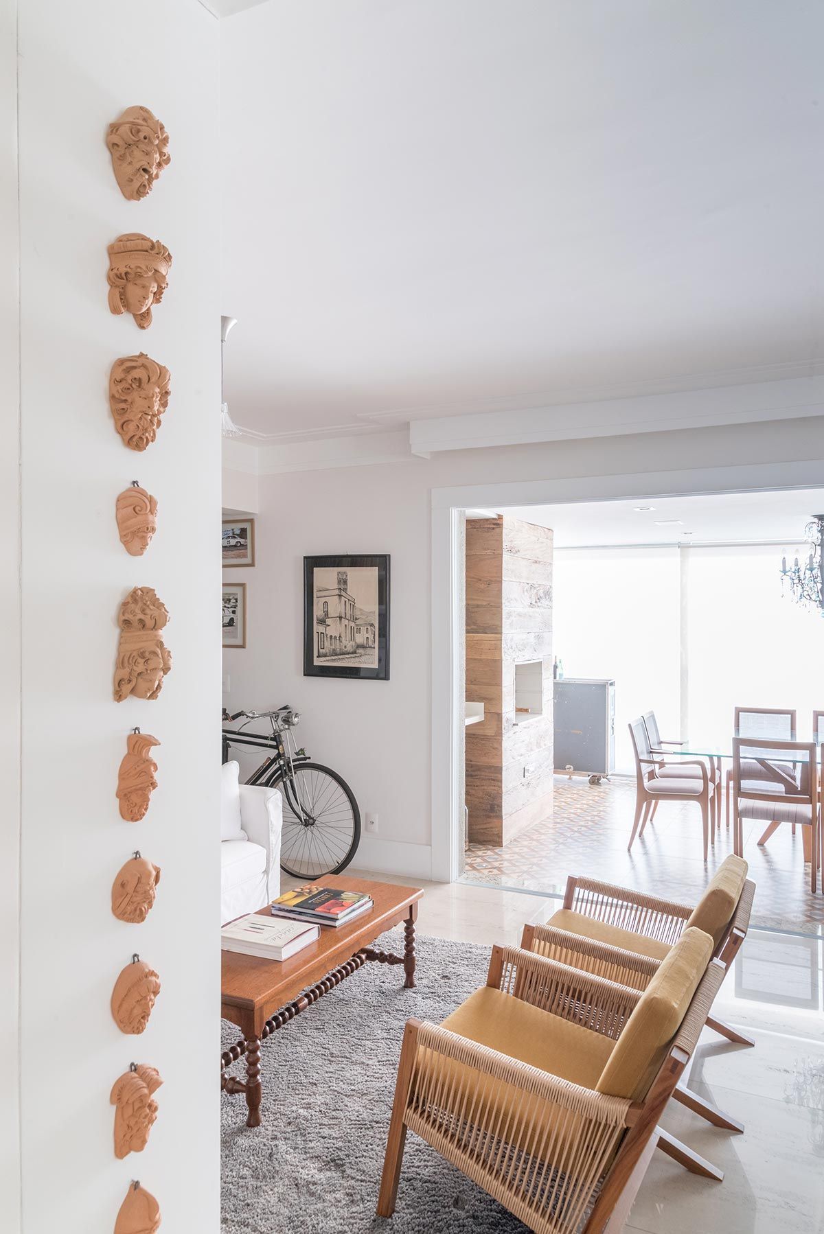 Além dos livros, a ambientação afetiva traz outras coleções do proprietário. Nas paredes do hall de entrada, foram posicionadas carrancas de deuses gregos e romanos que foram trazidas da Sicília, um espelho francês e uma plaquinha com os dizeres “Buen Camino” (bom caminho), conquistada durante o caminho de Santiago de Compostela percorrido de bicicleta.
