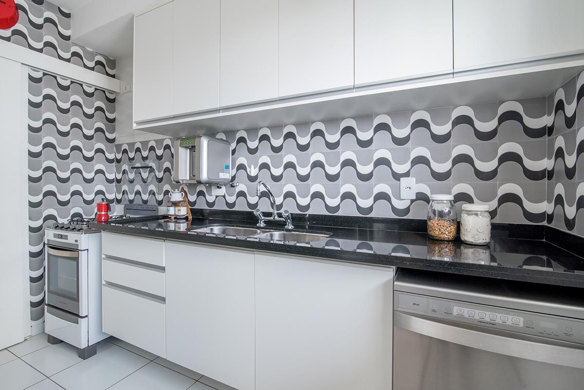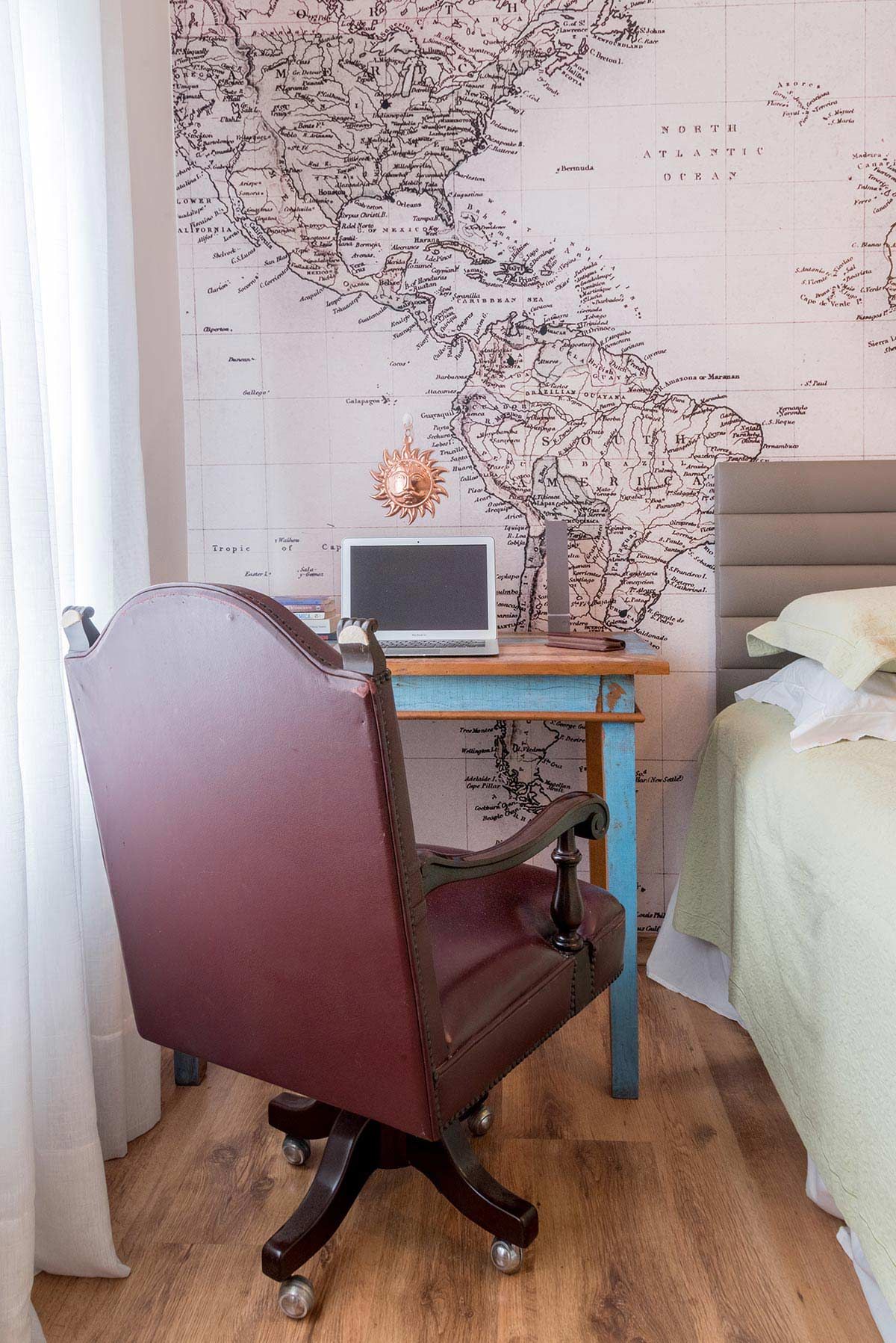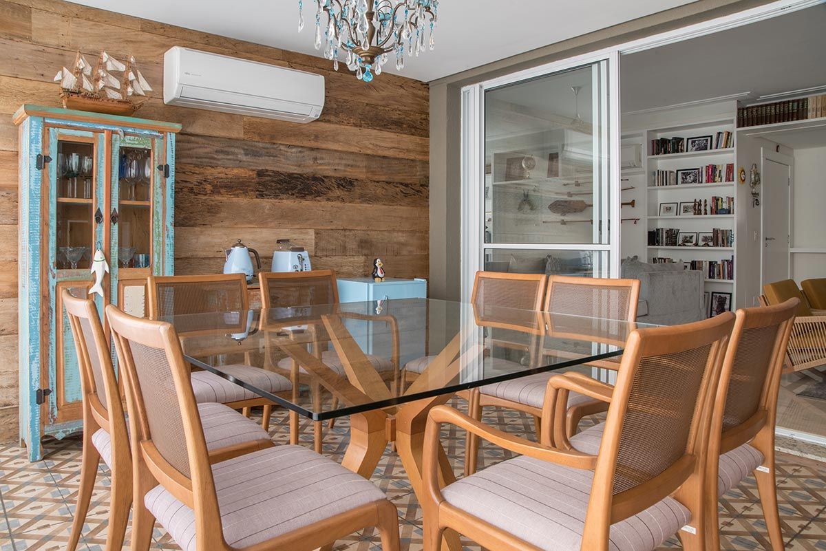 O mobiliário da casa segue um estilo contemporâneo, como o tapete geométrico, rack azul da sala de estar e a mesa de jantar, que ficou na varanda. Como essa é a única mesa de refeições, para criar um mix entre área externa e interna, a varanda recebeu revestimento em madeira de demolição, piso de porcelanato que remete ao ladrilho hidráulico e, ao mesmo tempo, um lustre de cristal. Na cozinha, uma brincadeira na parede com azulejos que remetem ao calçadão da praia de Copacabana foi a única intervenção, e na parte íntima do apartamento, os elementos mais presentes são o piso vinílico, décor vintage e o adesivo de parede com mapa antigo, para o advogado visualizar diariamente os países já visitou.