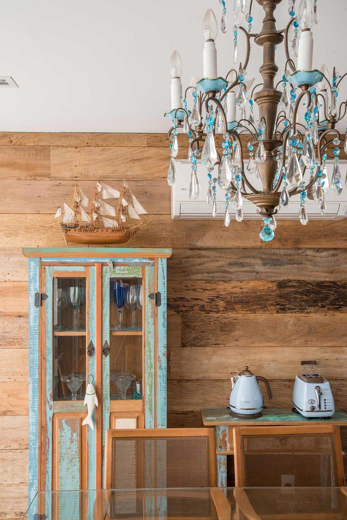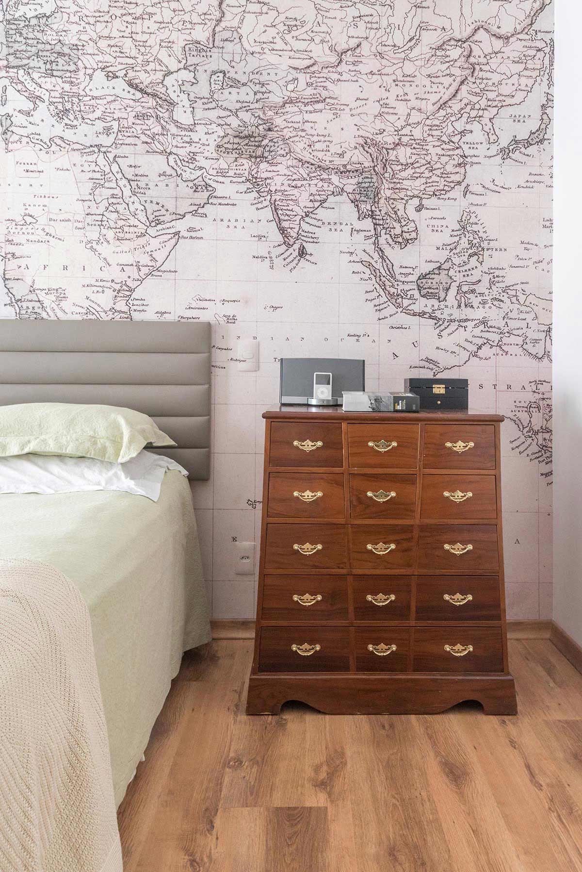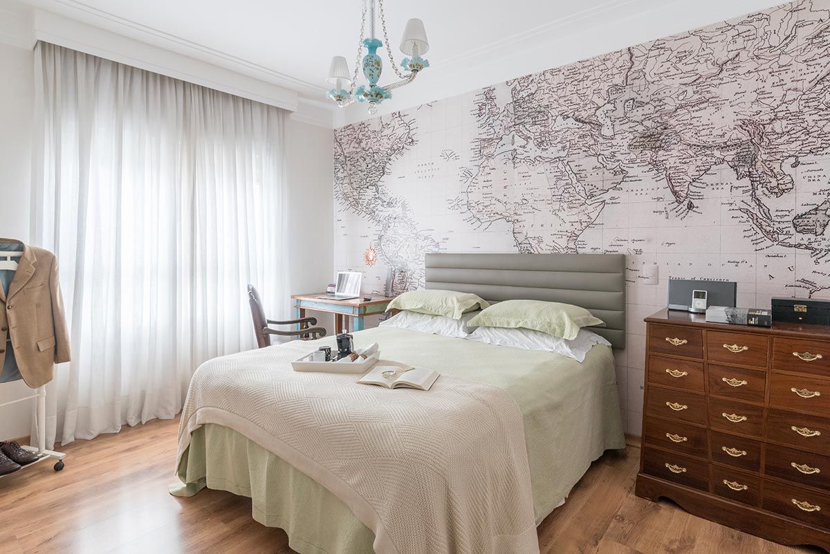 O mobiliário da casa segue um estilo contemporâneo, como o tapete geométrico, rack azul da sala de estar e a mesa de jantar, que ficou na varanda. Como essa é a única mesa de refeições, para criar um mix entre área externa e interna, a varanda recebeu revestimento em madeira de demolição, piso de porcelanato que remete ao ladrilho hidráulico e, ao mesmo tempo, um lustre de cristal. Na cozinha, uma brincadeira na parede com azulejos que remetem ao calçadão da praia de Copacabana foi a única intervenção, e na parte íntima do apartamento, os elementos mais presentes são o piso vinílico, décor vintage e o adesivo de parede com mapa antigo, para o advogado visualizar diariamente os países já visitou.
