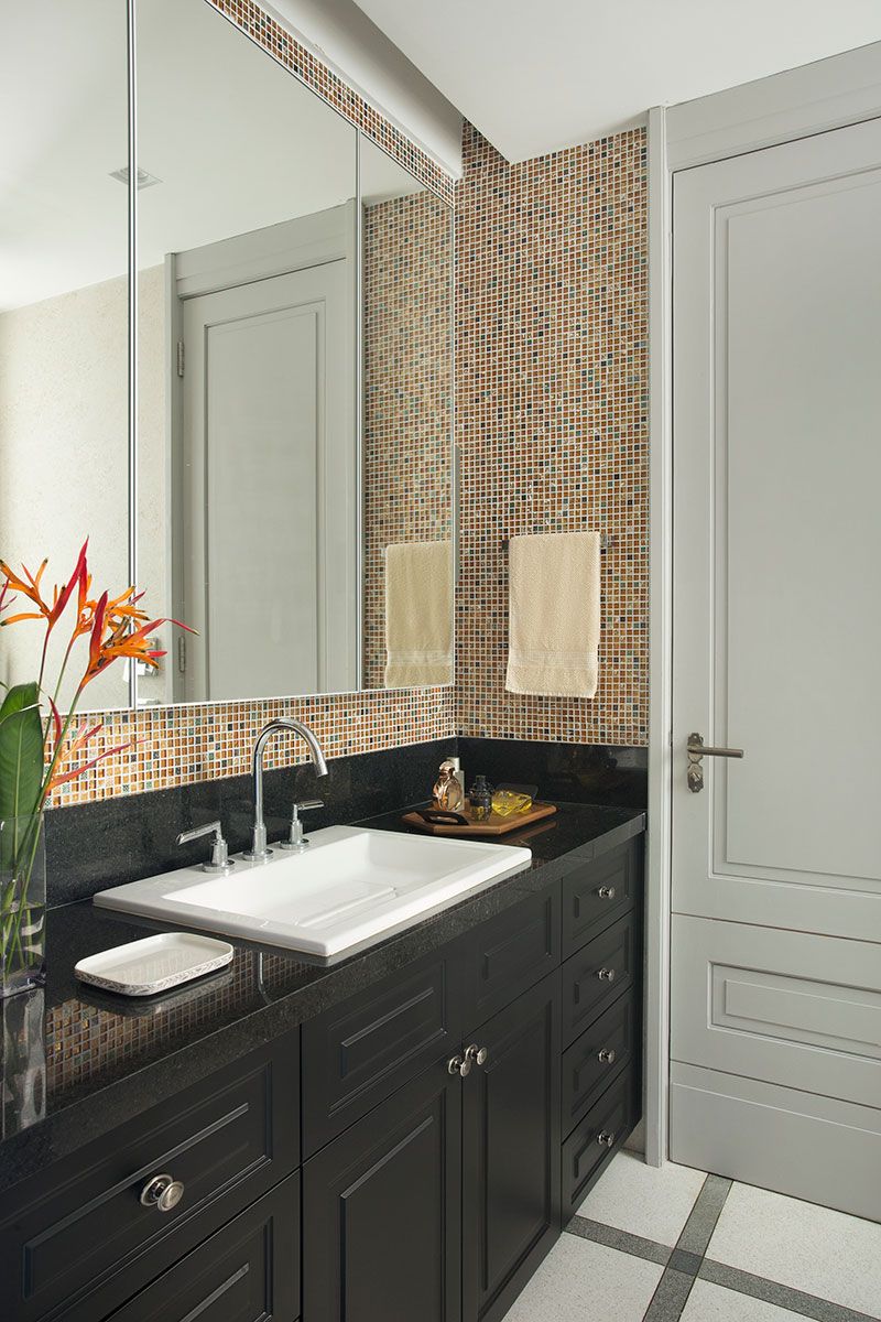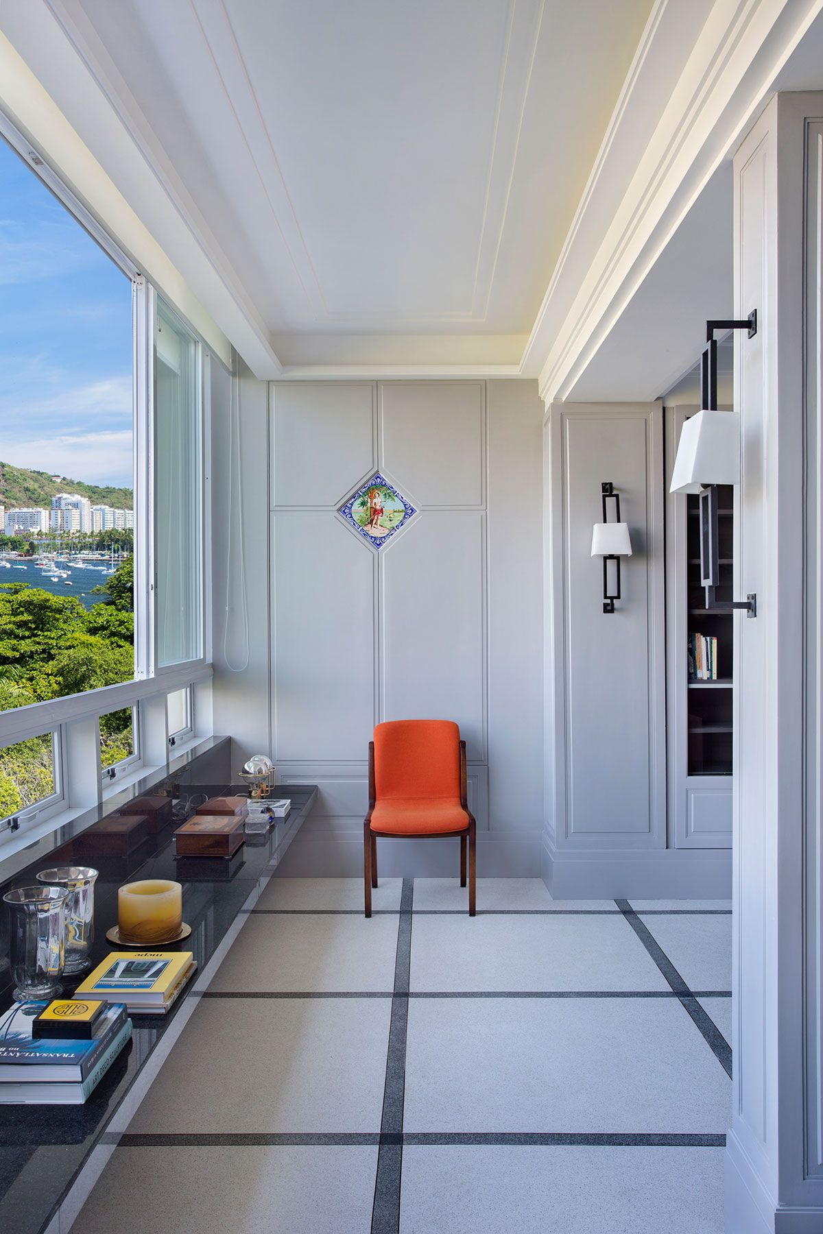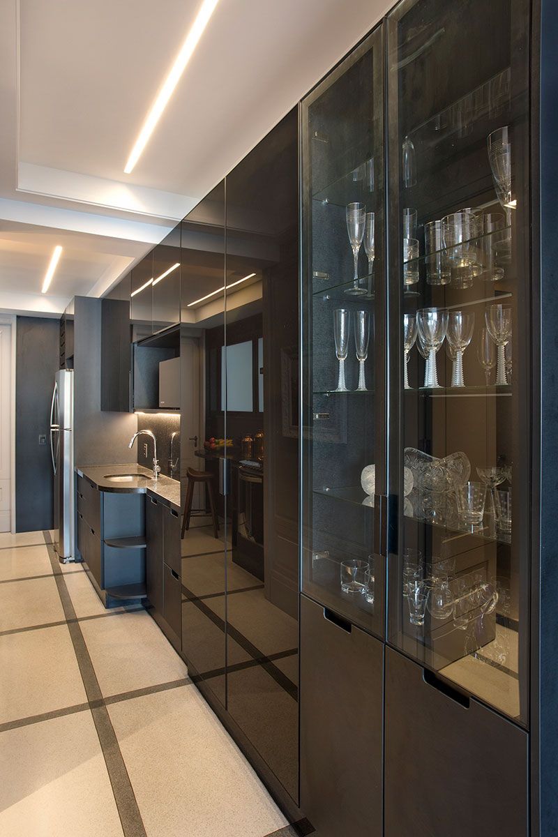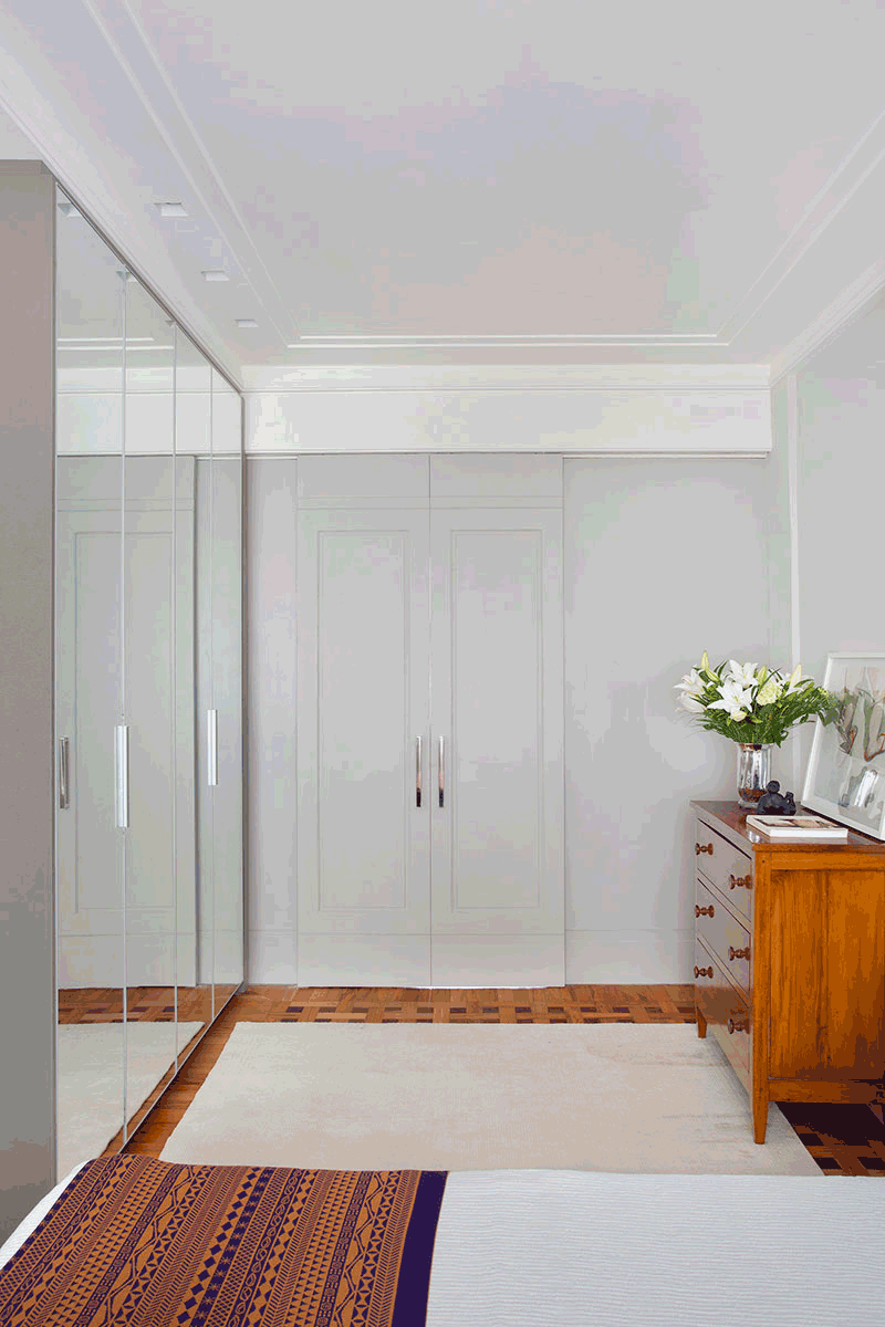 Um dos desafios do projeto foi acomodar a extensa biblioteca do morador, que exigiu cada centímetro possível de espaço aproveitável. Para isso o arquiteto criou estantes com portas de vidro e desenho que da continuidade visual a forração das paredes do living e jantar, cobertas por painéis de boiseries. Outra premissa solicitada pelo proprietário foi conservar um painel de azulejos com a imagem de São Sebastião, para o qual Viana criou um desenho geométrico no painel de boiserie, formando uma moldura e integrando a imagem em novo contexto visual.