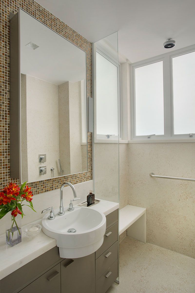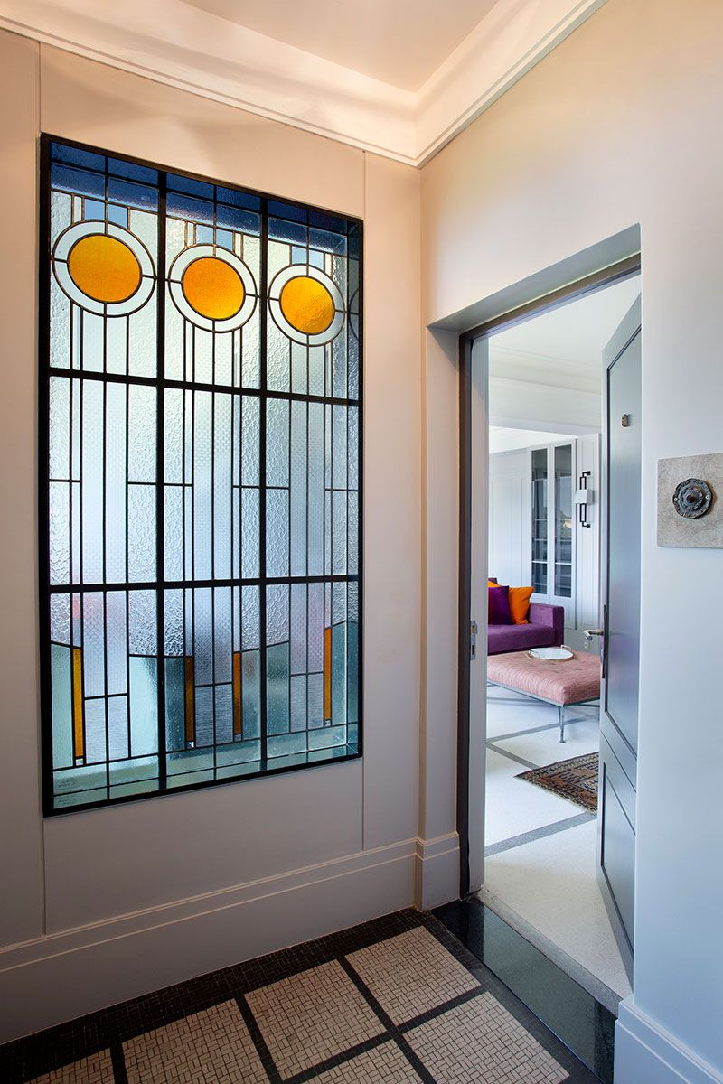 Outros elementos que fazem referência a estética art déco são as arandelas em metal escuro, desenhadas pelo arquiteto, e o vitral que da para o hall do elevador social, com desenho geométrico e vidros com diferentes texturas e graus de transparência. Já o mobiliário contemporâneo ecoa o geometrismo da época e traz o toque tropical através das cores vibrantes, como o sofá com tecido em algodão na cor uva e almofadas com degradê do tom berinjela ao laranja. Nas suítes, mantas e almofadas em padrão étnico conferem pontos de cor .