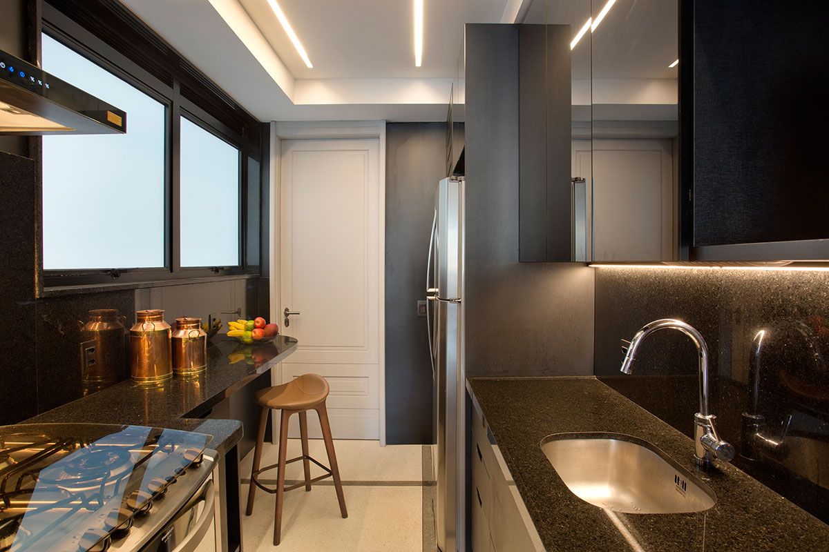 O novo layout apresenta um amplo living, com espaços integrados para trabalho e refeições que se estende até a cozinha. A cozinha estreita, tipo corredor, agora da acesso a suíte de hóspedes. Já a decoração ganhou um toque tropical em estilo art déco aprovado pelos moradores, porém permeado de um colorido menos intenso.