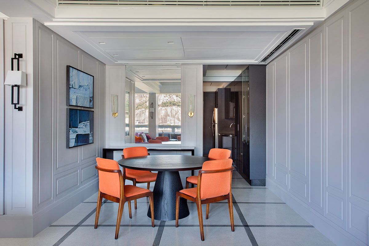 Optei por um suspiro art déco tropical, como se fosse observado à sombra de palmeiras e frondosas árvores. Nos interiores a meia-sombra predomina, com paredes revestidas em tons de cinza quente, próximo do tradicional tom francês eau-de-Nil.