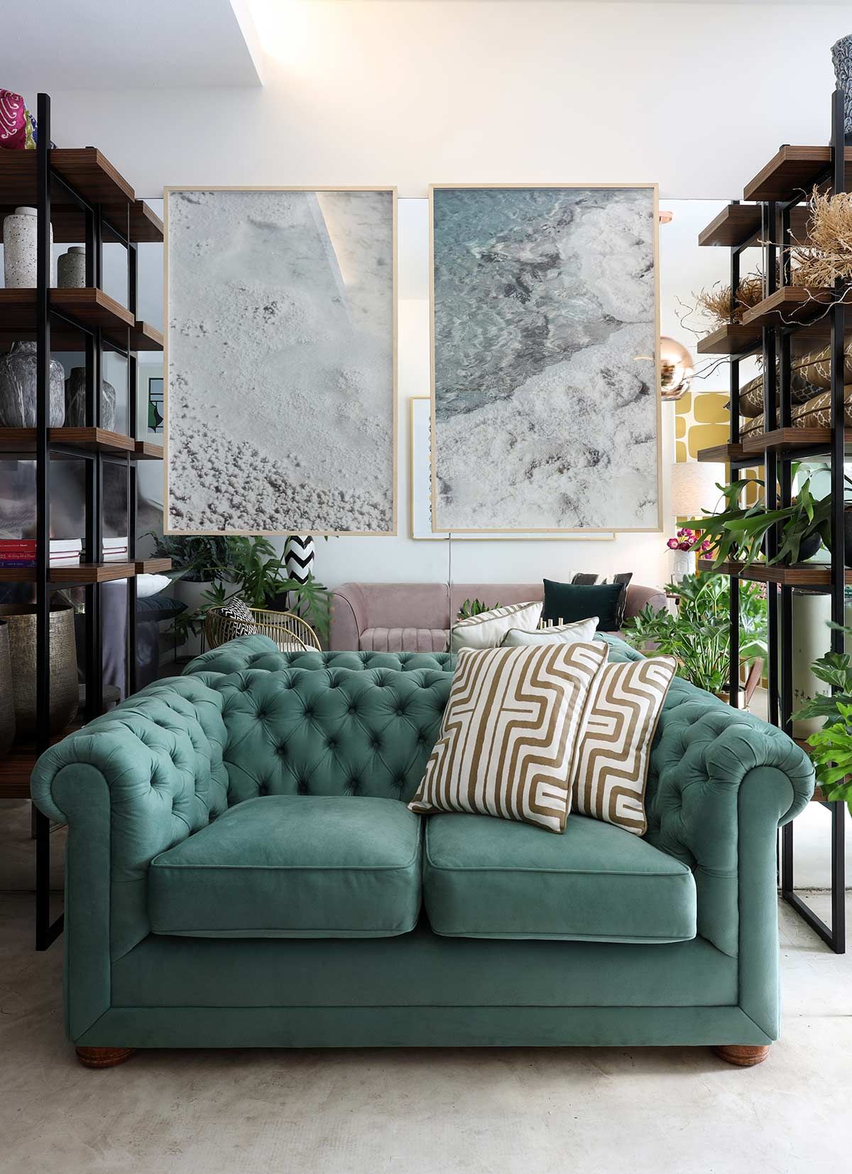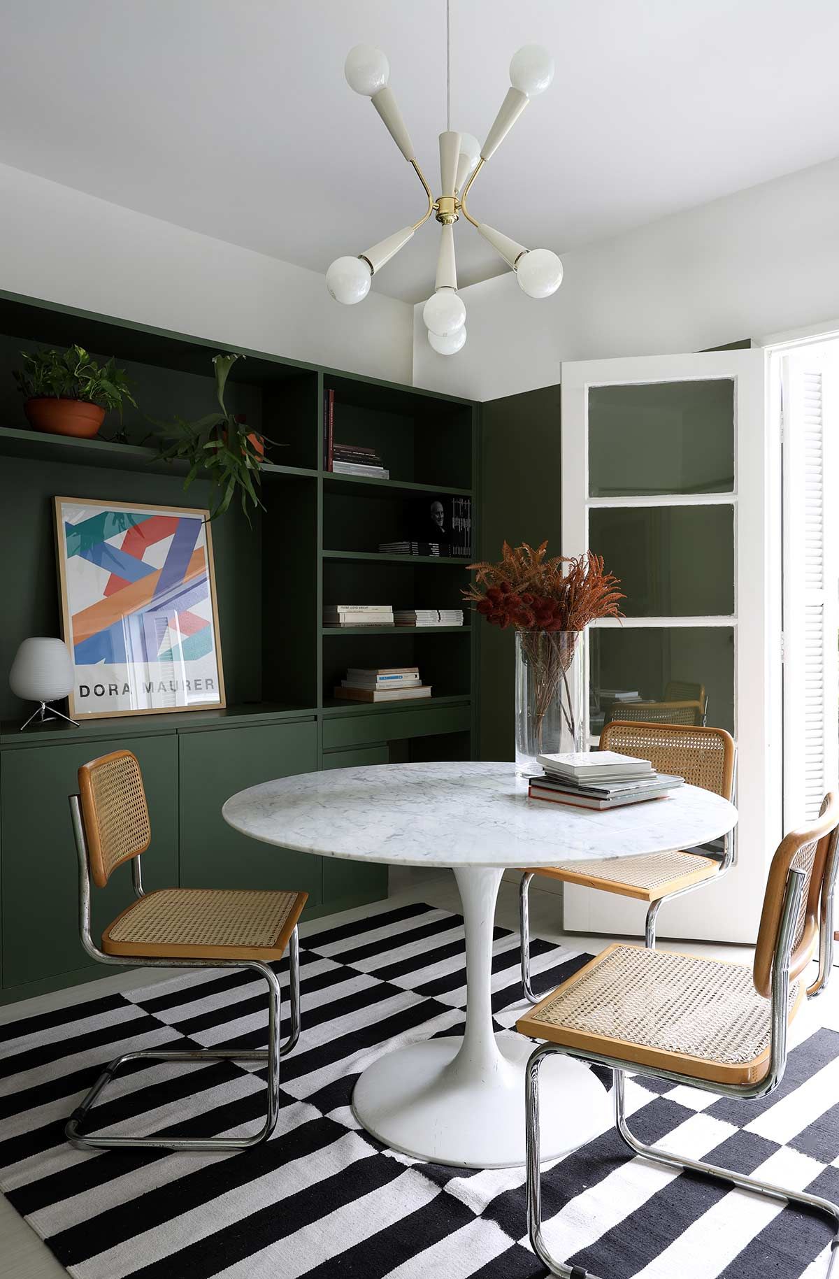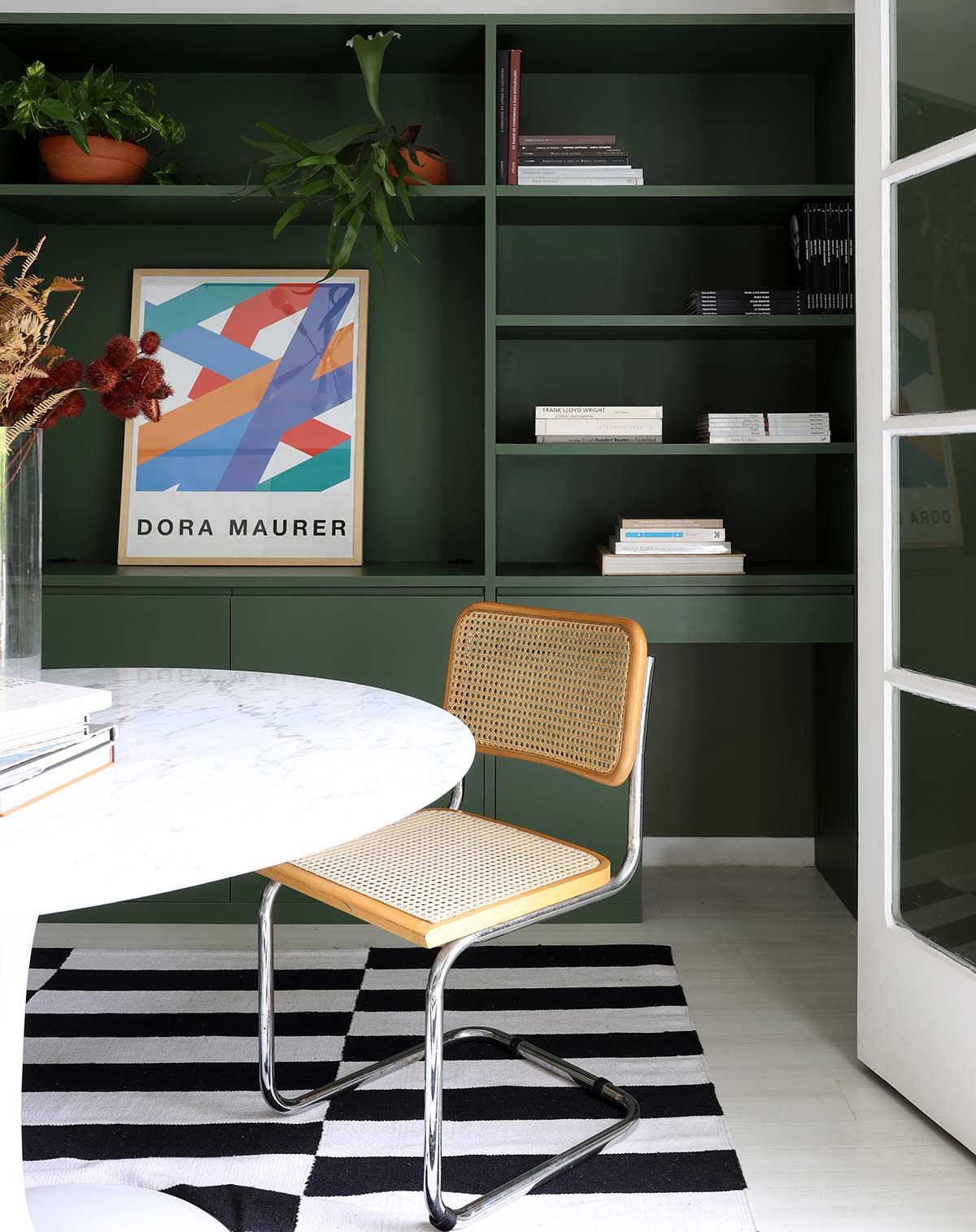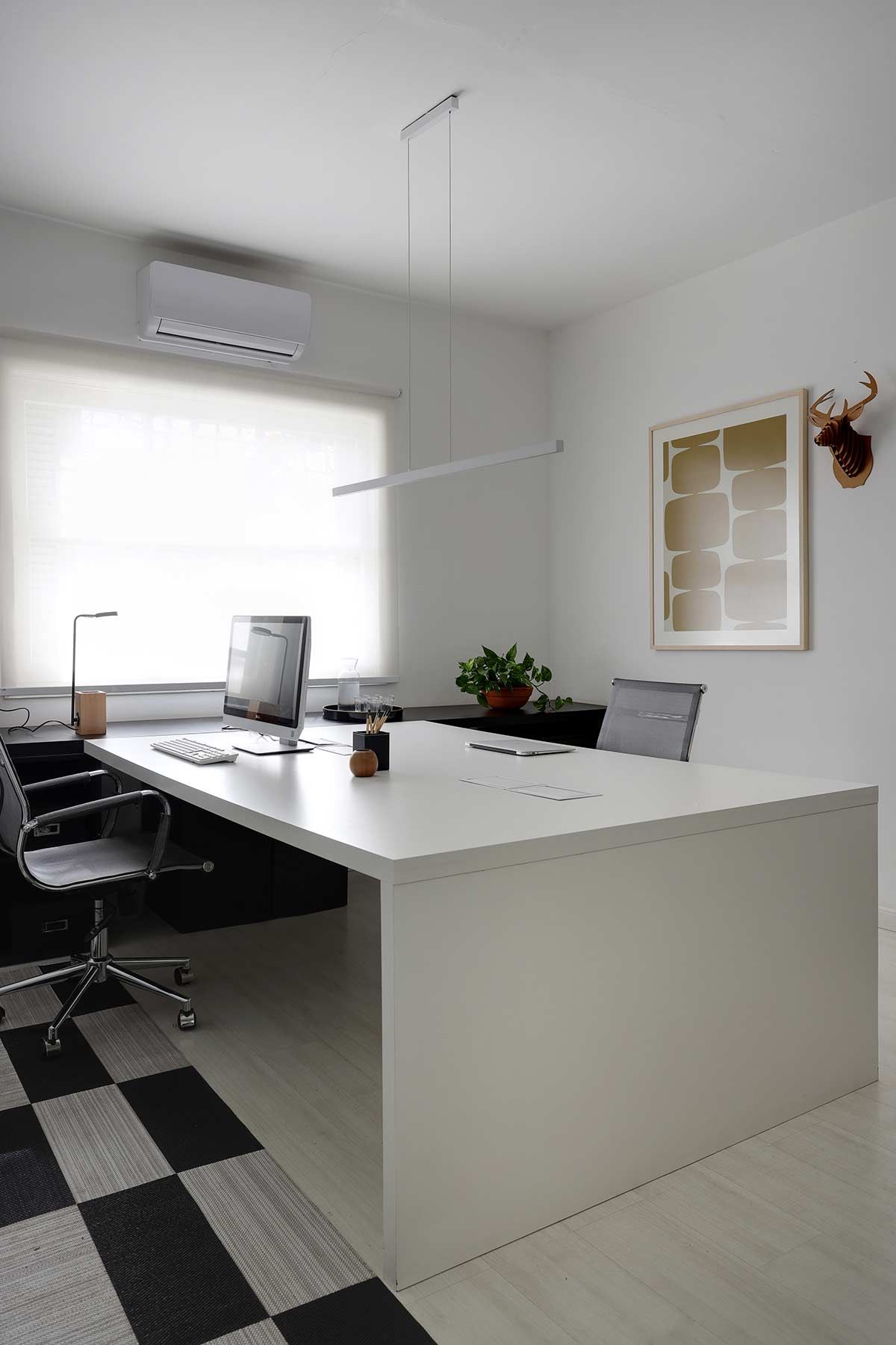 Apesar de uma das áreas ser um showroom, Robert quis uma atmosfera de residência mesmo, com sofás, cadeiras, poltronas e estantes que expõem seus objetos de decoração. No andar superior ficou a sala de reuniões, em que uma das paredes foi pintada de verde e a estande foi executada em MDF da mesma cor; além de uma sala de projetos, que o profissional optou por deixar tudo branco.