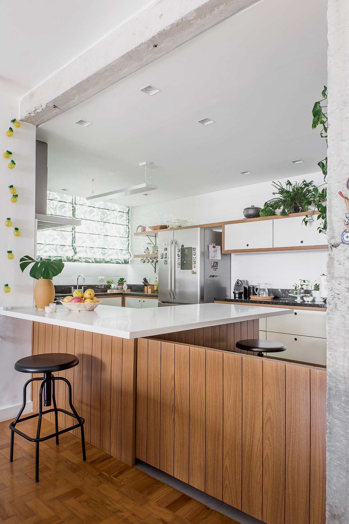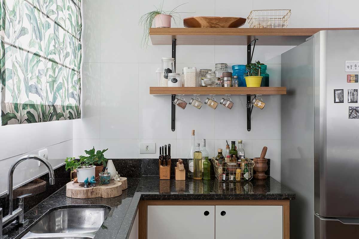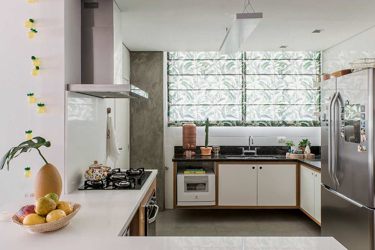 Após a demolição da parede que dividia a cozinha da sala, o desafio foi coordenar a transição entre os acabamentos novos e os existentes. Para isso, o piso, revestimento da parede e a bancada em granito preto foram mantidos, e o ambiente recebeu nova marcenaria e outras duas estações de apoio, além de uma grande ilha com cooktop – ótima para atender os convidados.