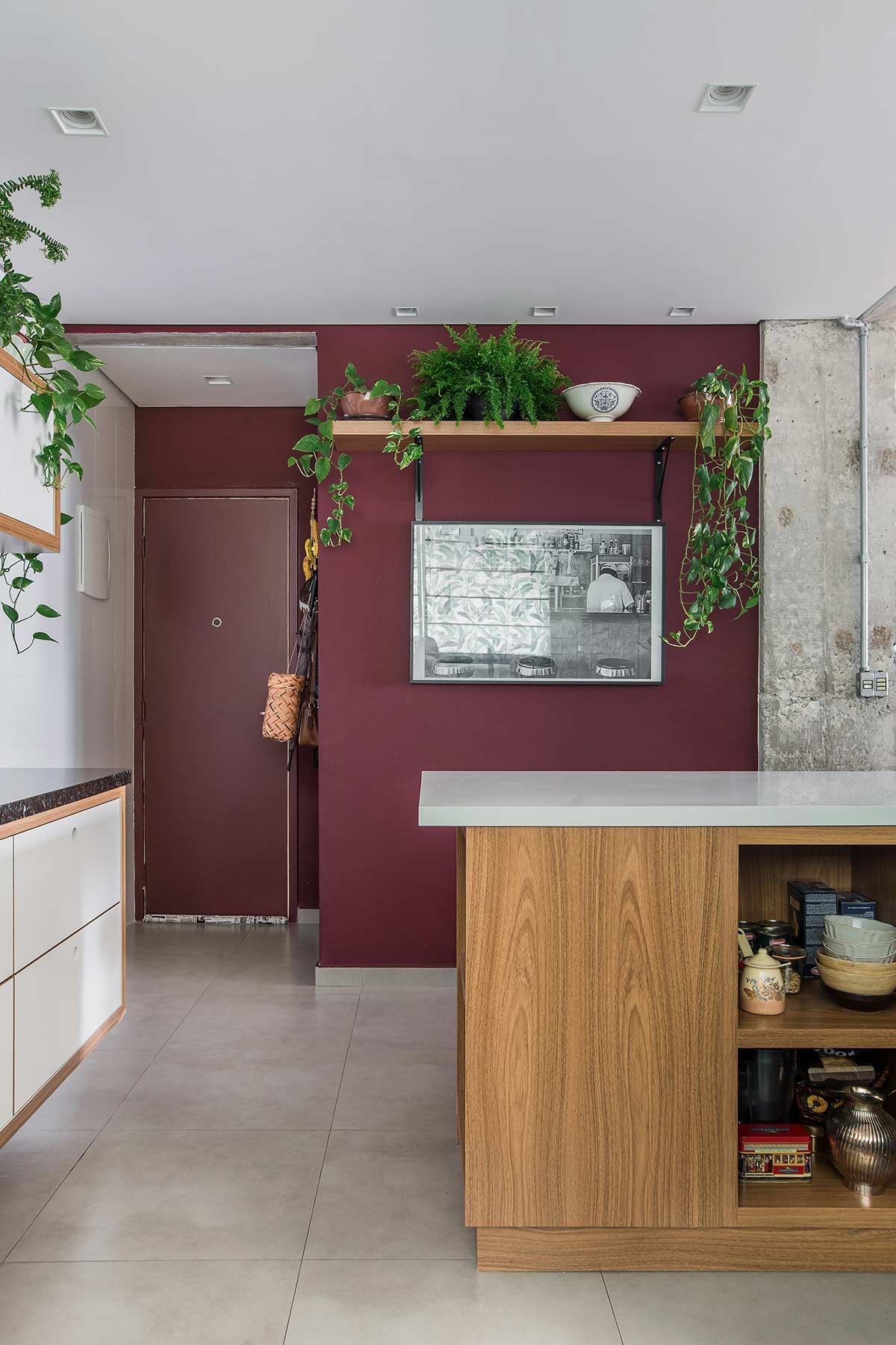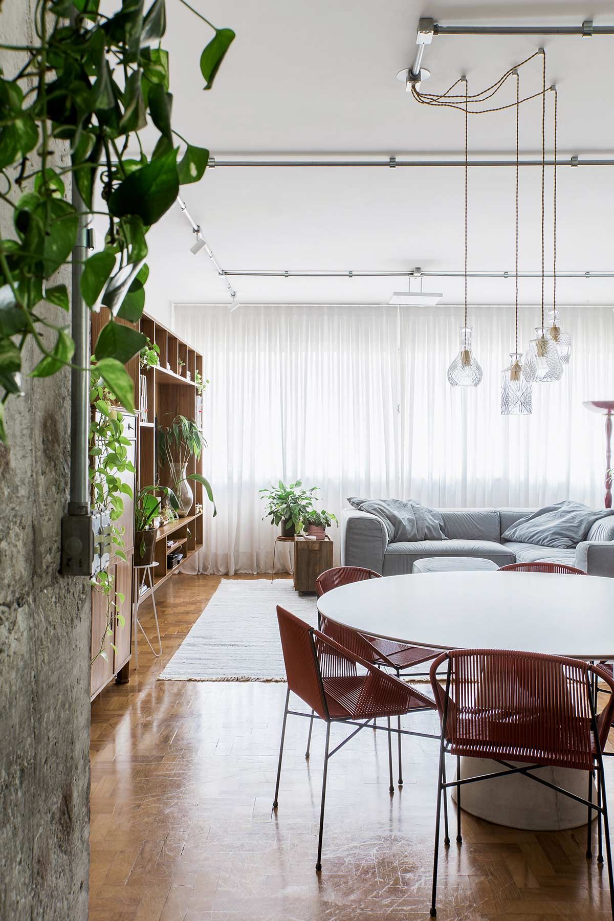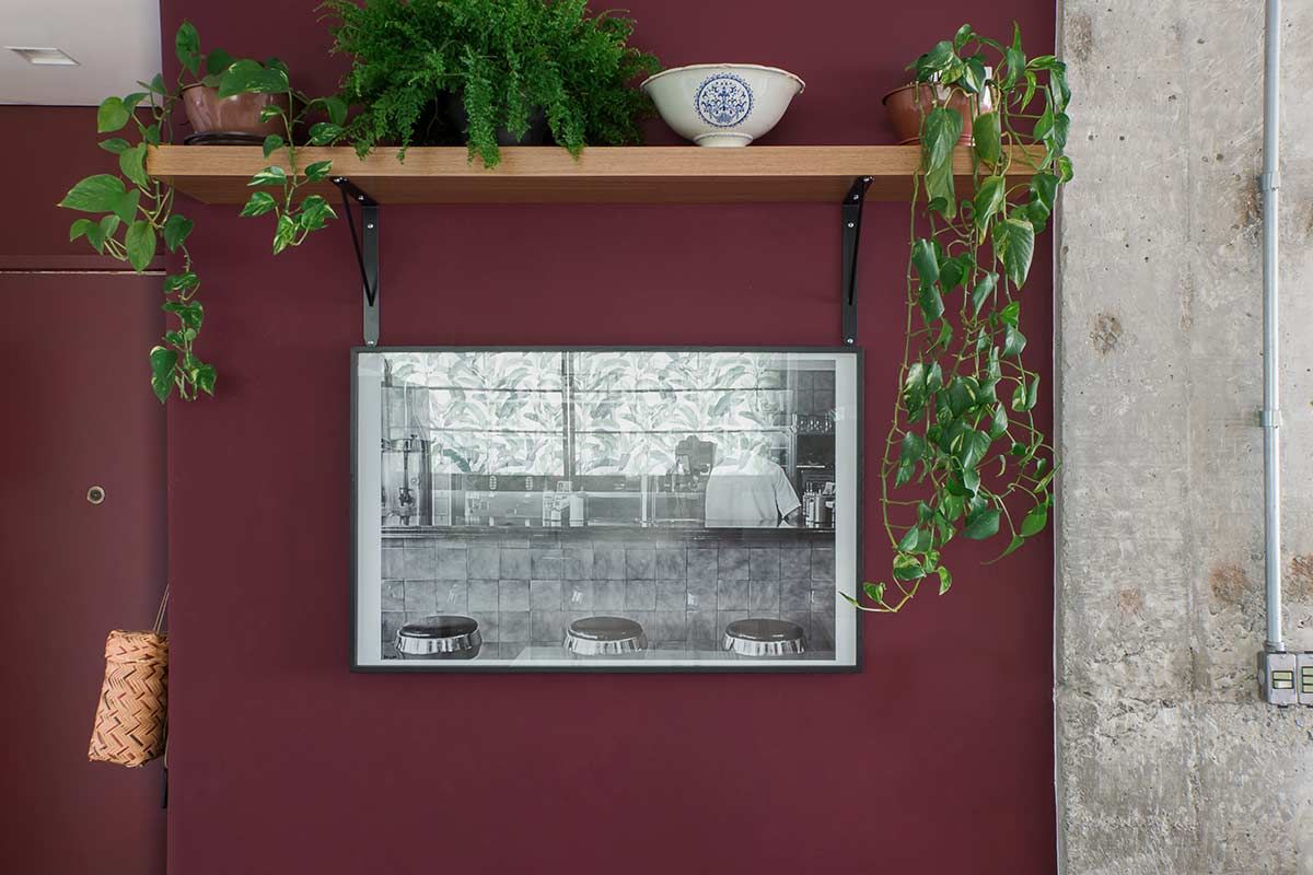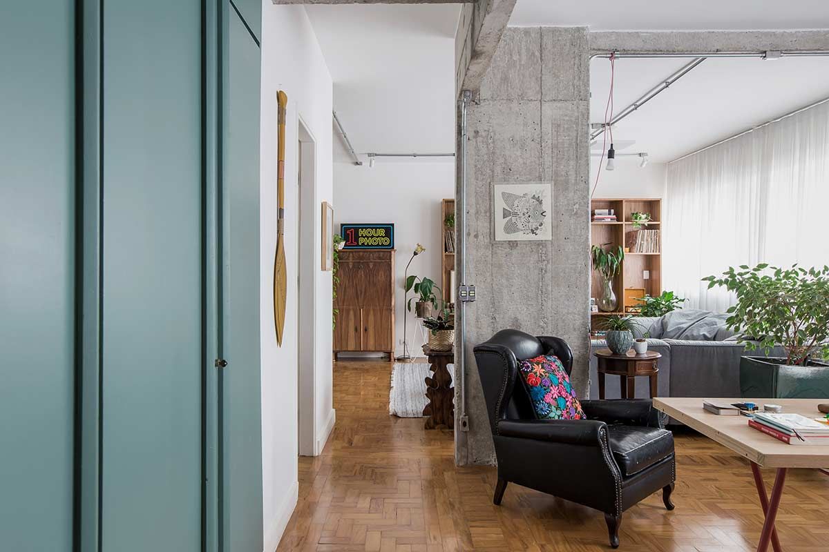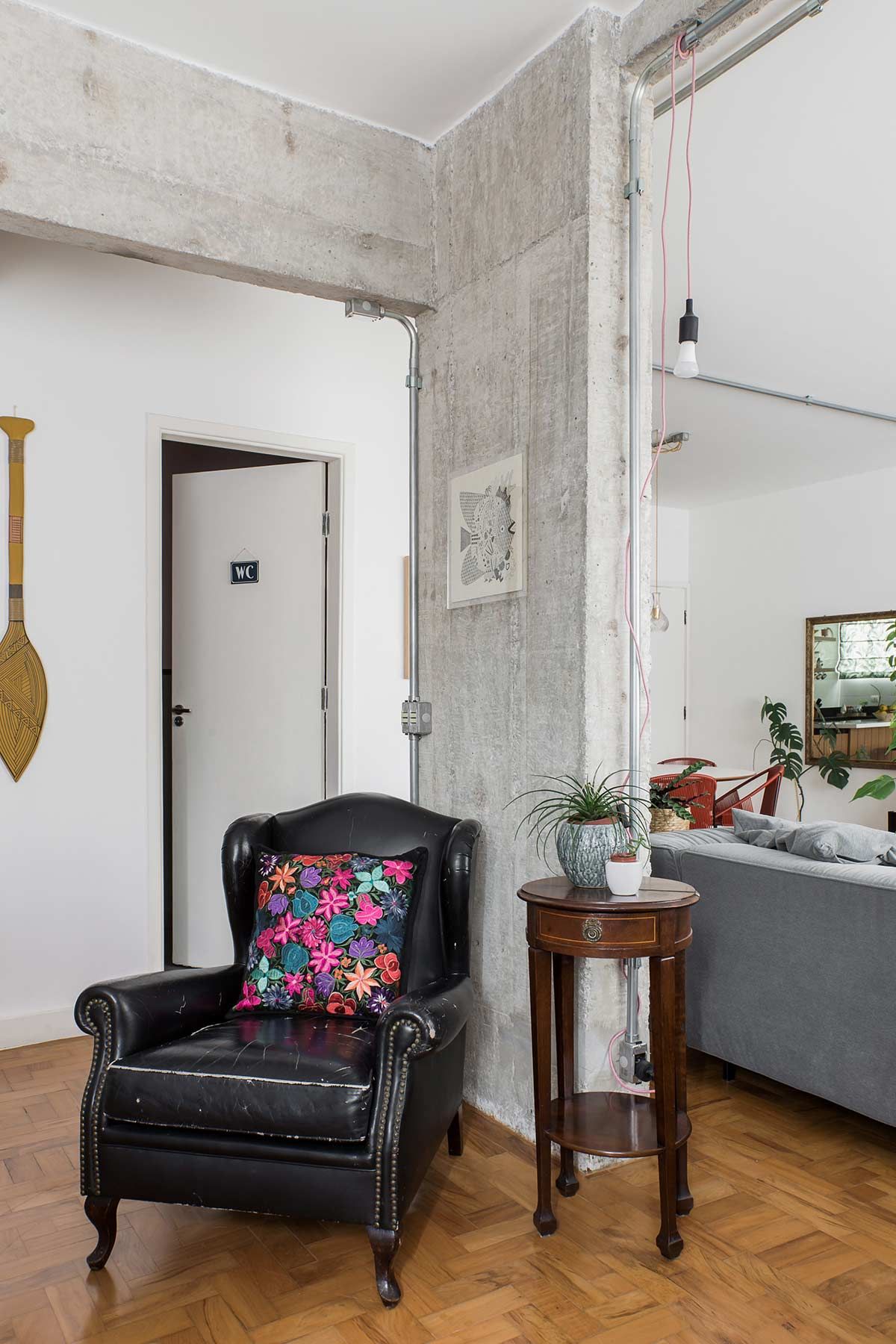 Desde a obra, os ares da decoração foram sendo construídos a partir de situações como a abertura de um dos dormitórios para o estar, em que vigas e pilares estruturais ficaram expostos, optando-se por assumir sua estética natural. Como os armários originais do apartamento estavam em boas condições, um opção boa e barata foi banhá-los de tinta verde menta e magenta, cores delicadas que, com as peças antigas, agregaram uma atmosfera vintage à casa. Nos banheiros essa linguagem aparece nos azulejos e na banheira estilo vitoriana, escolhida para a suíte. Q frescor do cenário foi arrematado pelas plantas, um dos xodós da moradora.