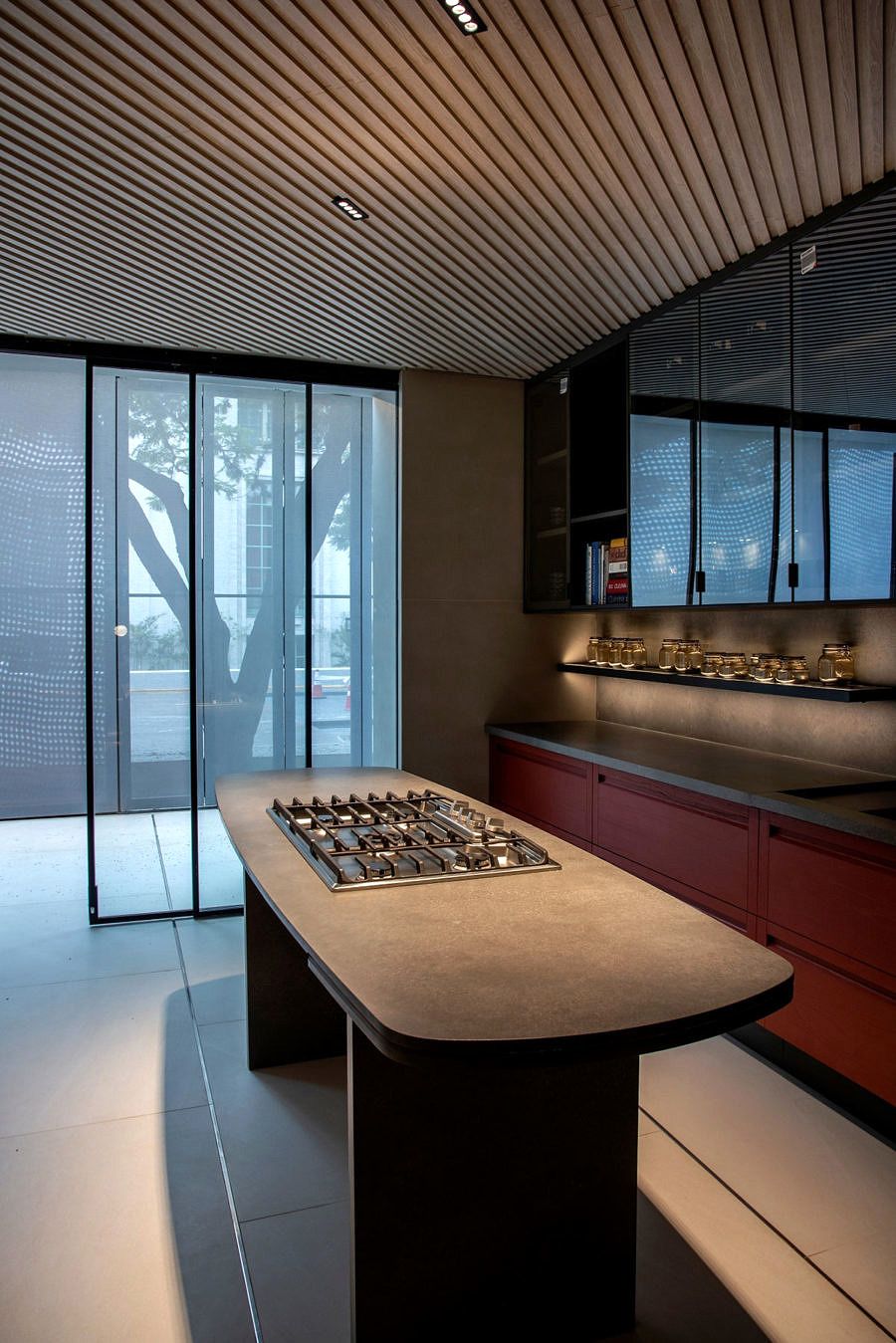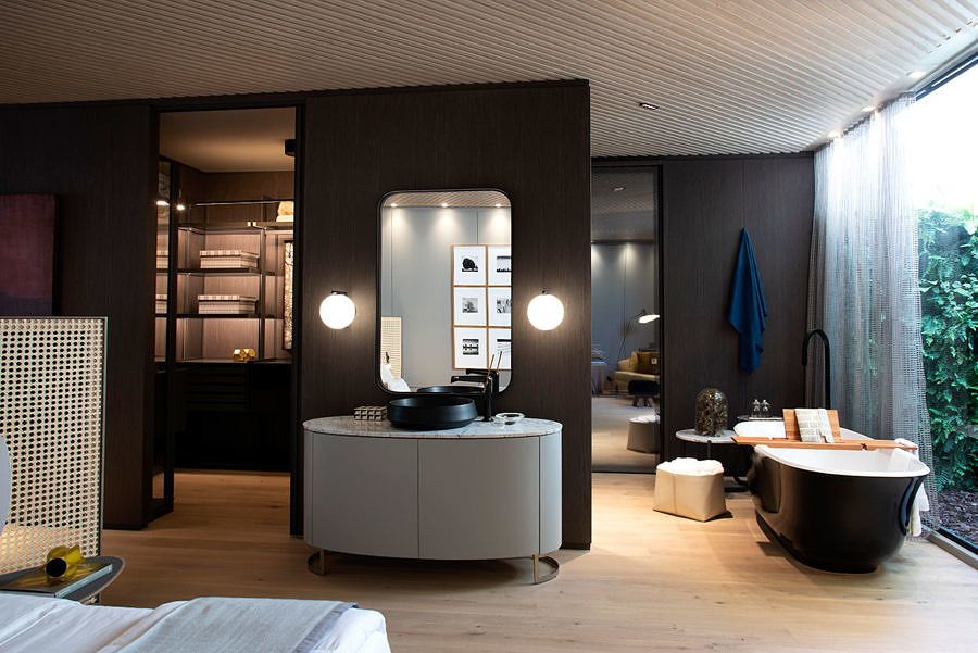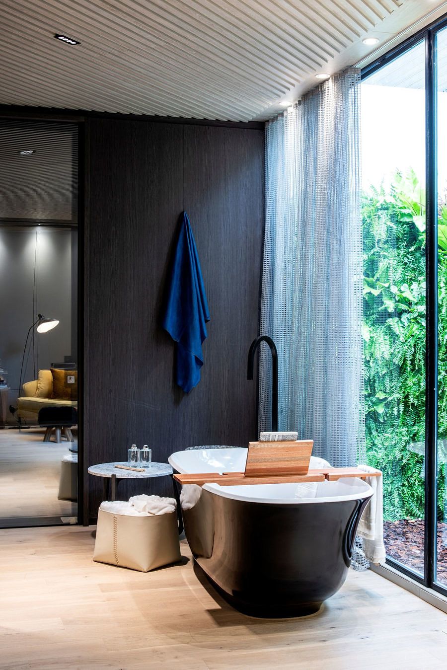 A sustentabilidade é um dos focos do ambiente, e um dos três pilares do tema Planeta Casa, por isso o porcelanato de 6 mm de espessura foi fixado em estrutura metálica com colagem de cimento cola, evitando a construção com perdas enormes de energia e material.