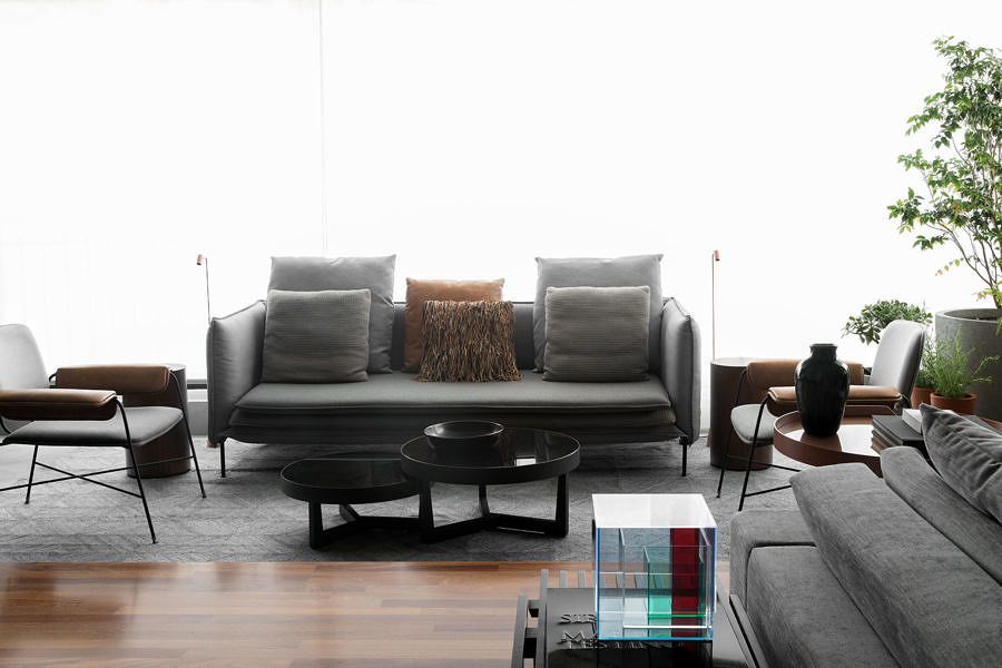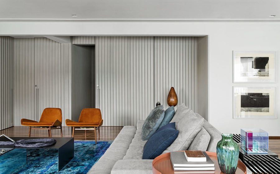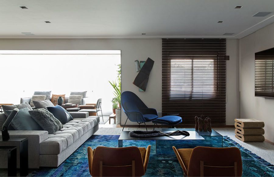 Os móveis pontuam doses generosas de cores fortes como o laranja e o azul, cores complementares. A partir do azul do mobiliário, as outras partes do projeto decorativo tomaram a mesma vertente, como a sobreposição dos tapetes. Sobre o projeto decorativo em si, foram escolhidas peças chave de designers brasileiros e internacionais para enfatizar as modulações de layout.
