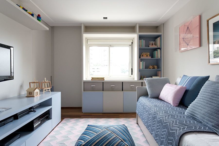 A paleta de tons, com o cinza claro como principal, foi pensada de modo a elaborar um pano de fundo aconchegante, visto que se trata do lar de uma família ainda jovem, com criança.