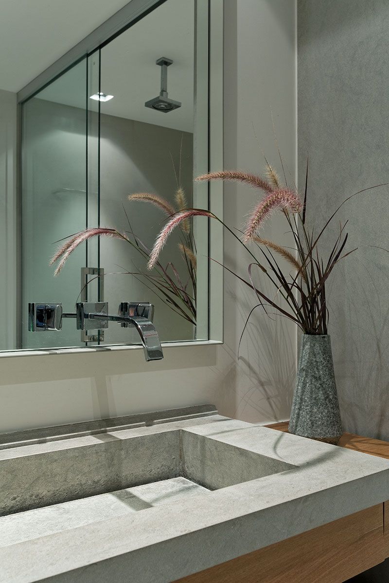 A varanda foi criada como um ponto de relaxamento dentro da casa. O ambiente reflete a enorme quantidade de verde presente na vizinhança. O paisagismo do terraço integrado à sala cria uma ambientação convidativa ao convívio cotidiano, de onde se pode aproveitar para relaxar a partir dos mesmos tons usados no living, o cinza adotado como ponto de partida.