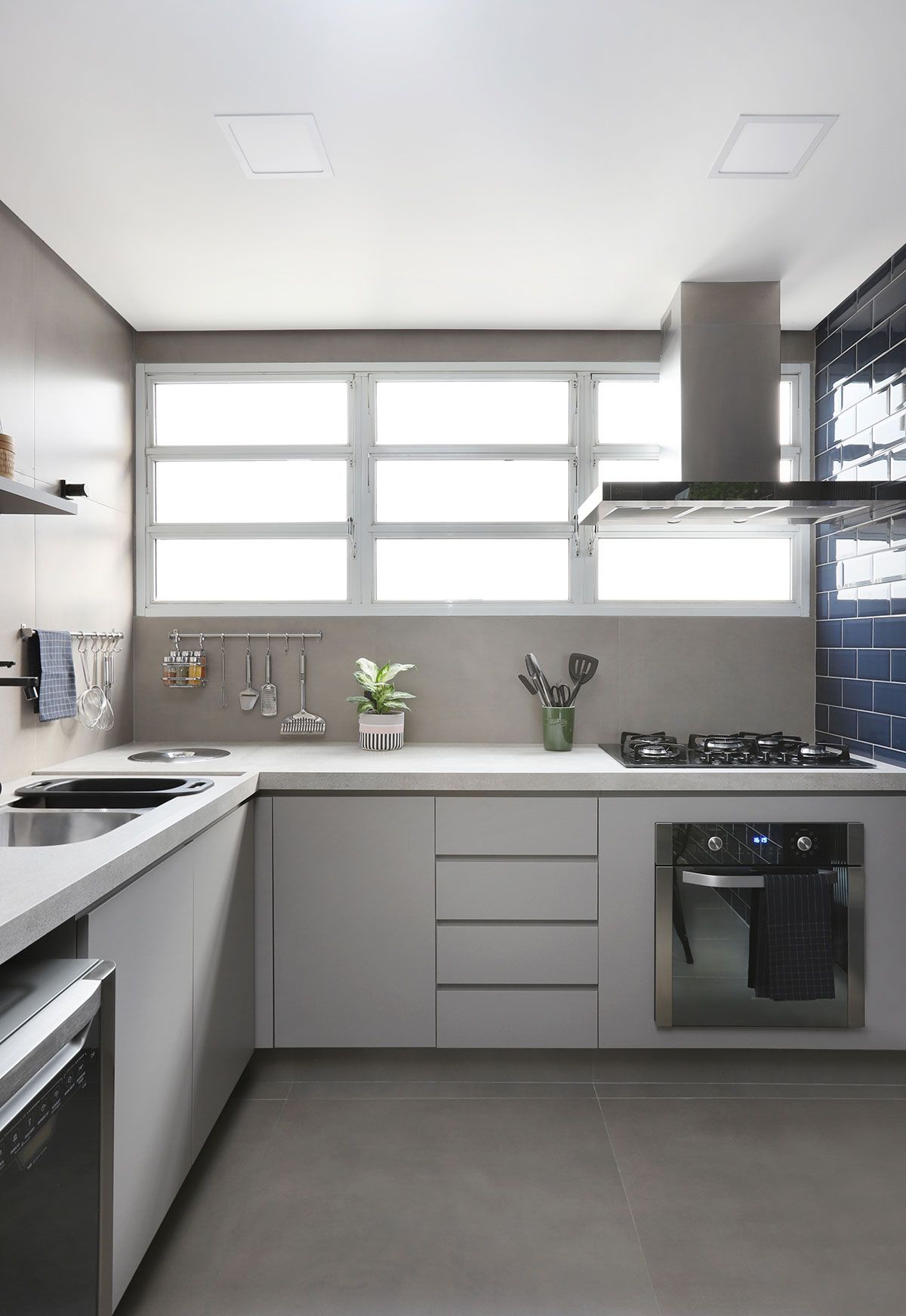 Cozinha ampla, sem excessos, com uma bancada, um bom apoio para cozinhar e uma mesinha para café da manhã e almoços rápidos – esse foi o pedido dos clientes do Estúdio Maré.