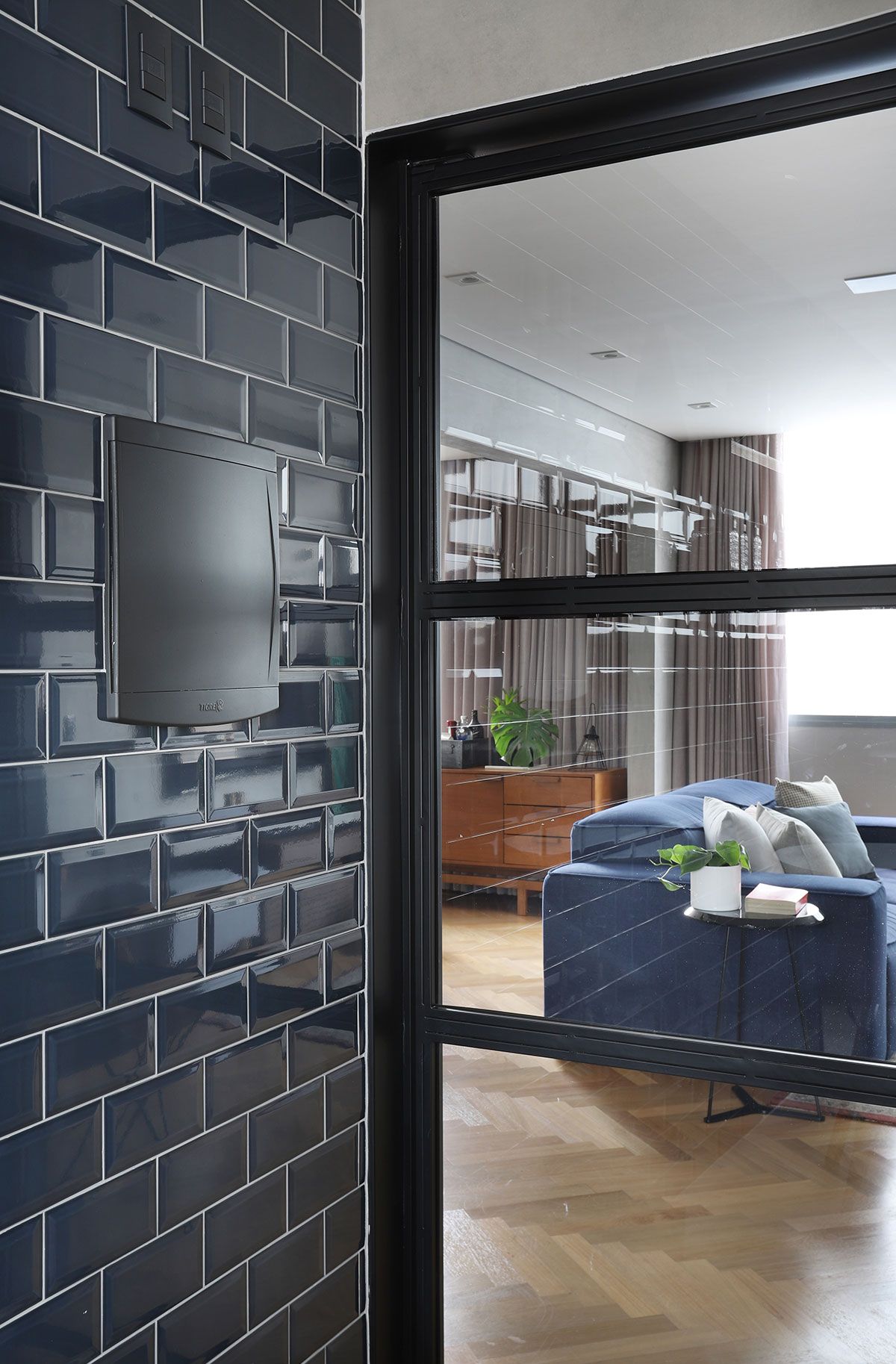 Para solucionar, o escritório ampliou o vão da porta e colocou uma porta de vidro para integrar os espaços. Foram escolhidos acabamentos na maioria em tons de cinza para trazer a ideia minimalista e os metais e serralheria pretos para dar ênfase para a parede de tijolinho azul marinho.