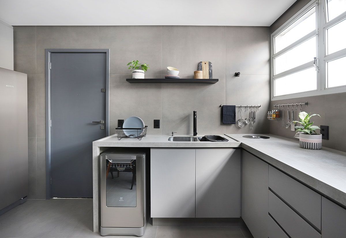 Cozinha ampla, sem excessos, com uma bancada, um bom apoio para cozinhar e uma mesinha para café da manhã e almoços rápidos – esse foi o pedido dos clientes do Estúdio Maré.