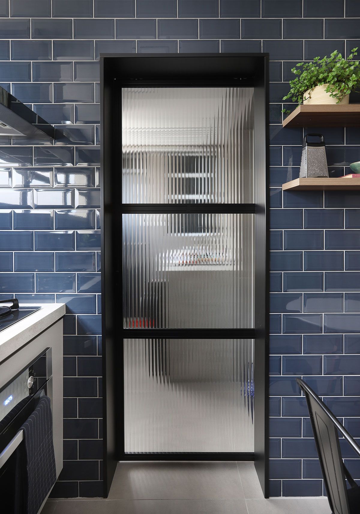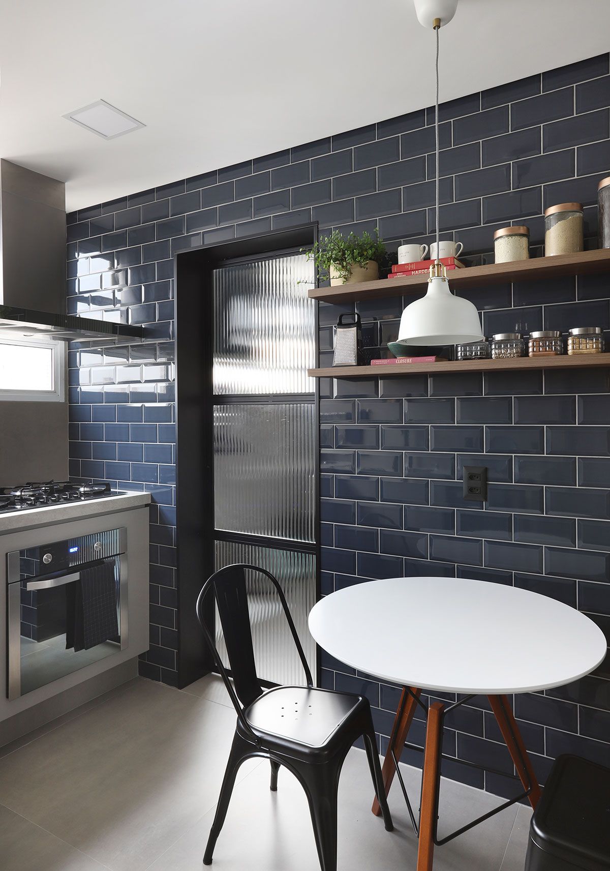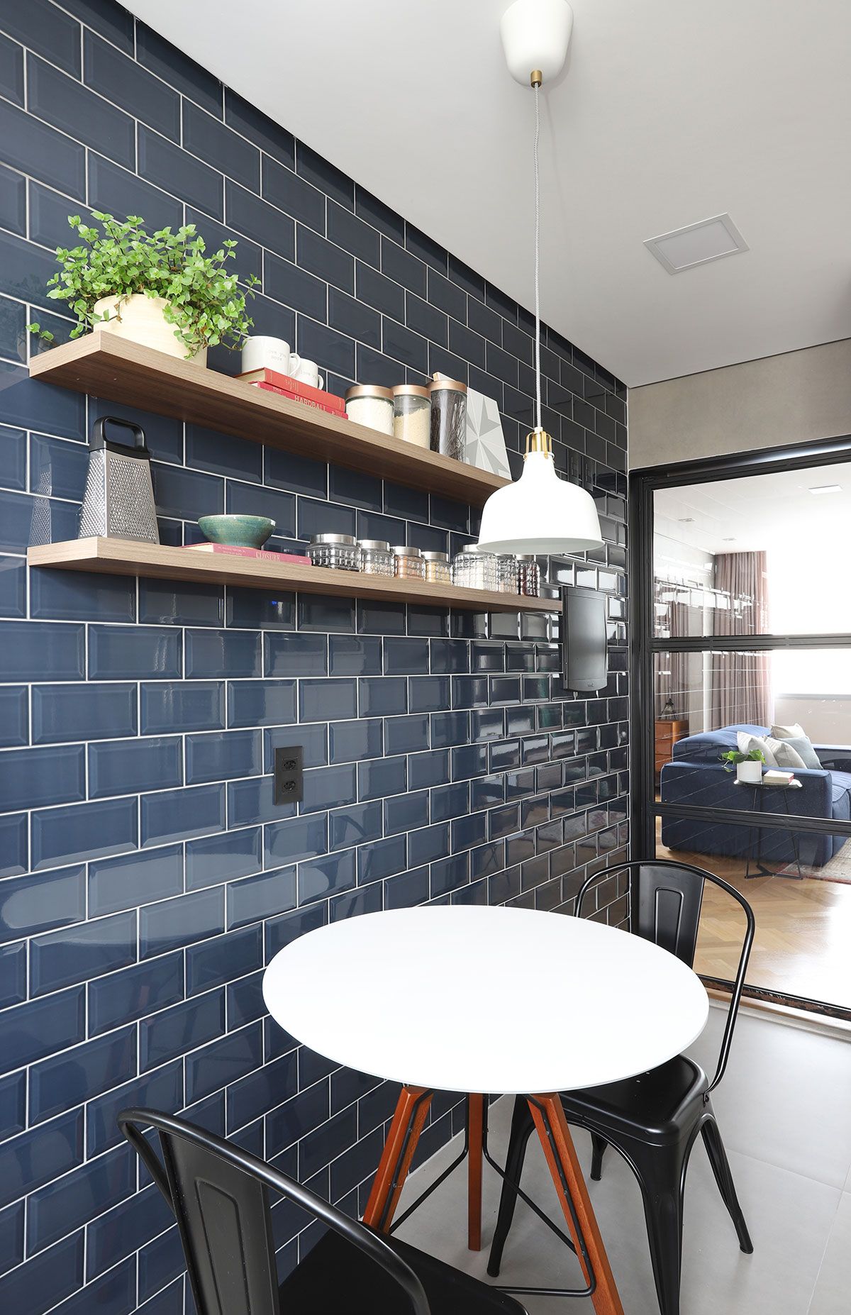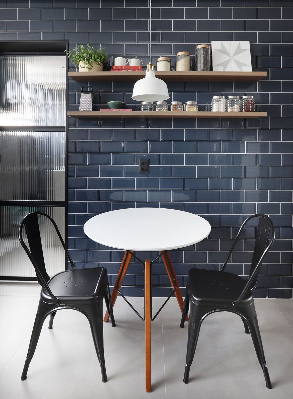 Para solucionar, o escritório ampliou o vão da porta e colocou uma porta de vidro para integrar os espaços. Foram escolhidos acabamentos na maioria em tons de cinza para trazer a ideia minimalista e os metais e serralheria pretos para dar ênfase para a parede de tijolinho azul marinho.
