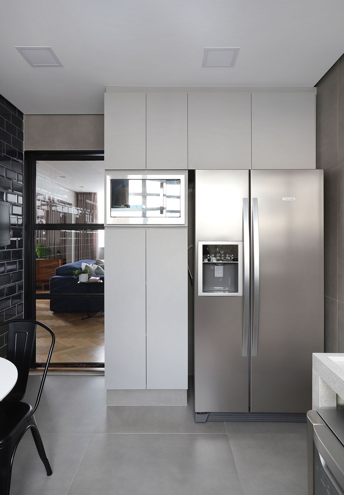 Como o apartamento é bem antigo não conseguimos a planta estrutural com o prédio, a ideia inicial era abrir a cozinha para a sala para receberem os amigos e cozinhar, mas no início da obra descobrimos que havia um pilar na parede entre a cozinha e sala.