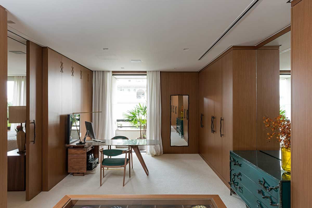 Na suíte predomina a madeira, carpetes e o espaçoso banheiro de mármore. O escritório Jean de Just Design de Interiores conta que gosta de tratar os ambientes em que o cliente mais ficará como uma “sala”.