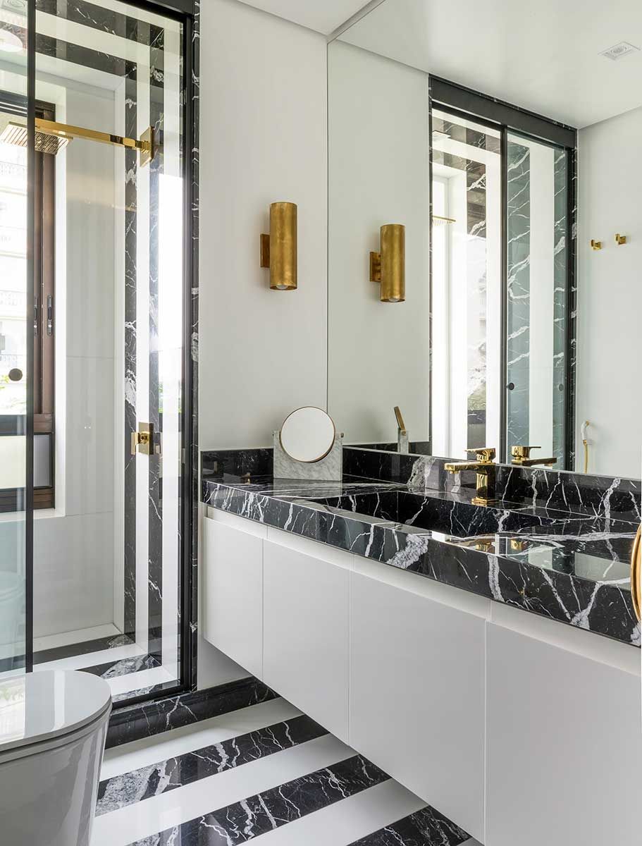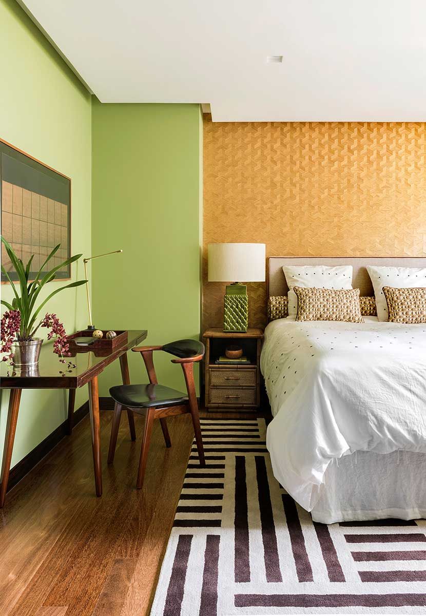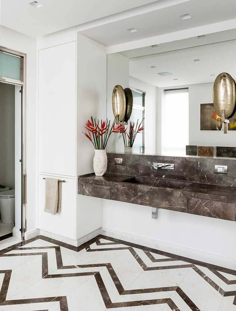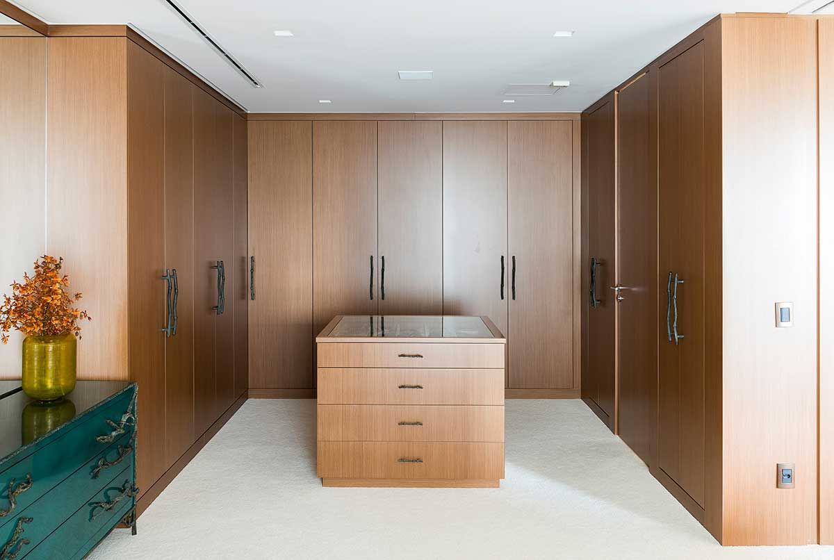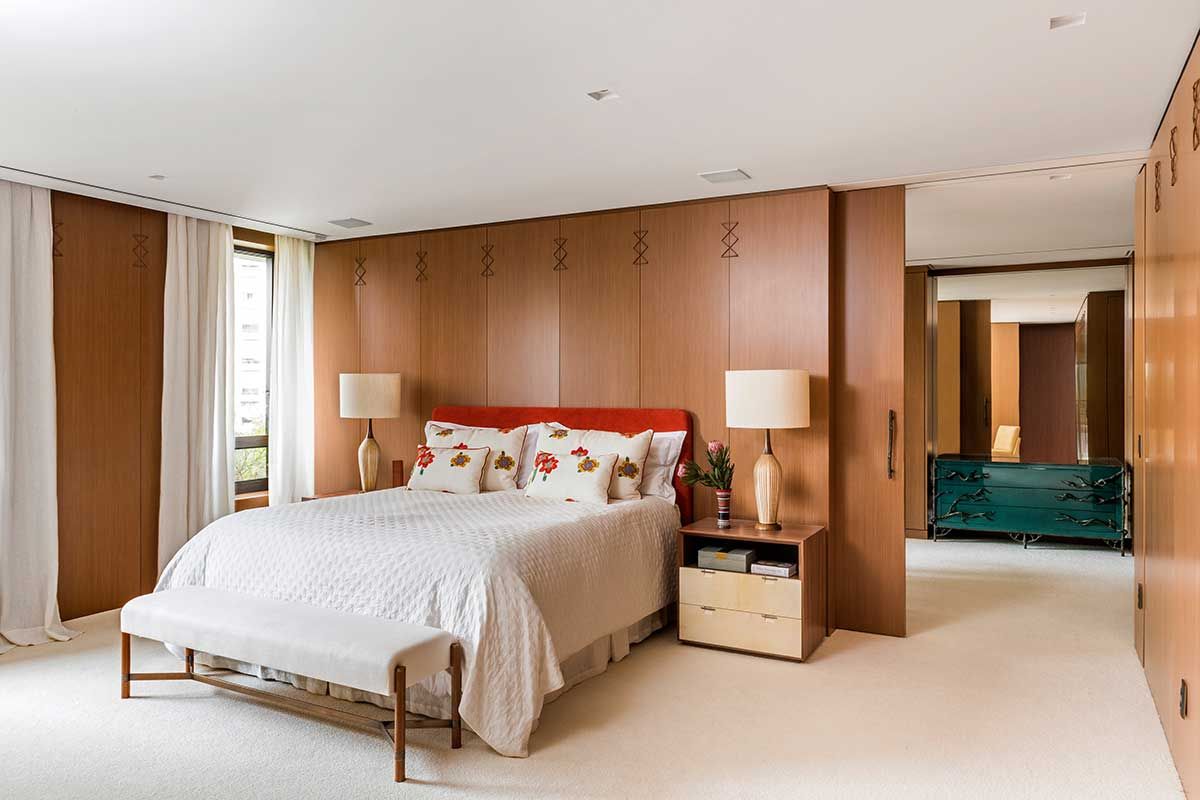Na suíte predomina a madeira, carpetes e o espaçoso banheiro de mármore. O escritório Jean de Just Design de Interiores conta que gosta de tratar os ambientes em que o cliente mais ficará como uma “sala”.