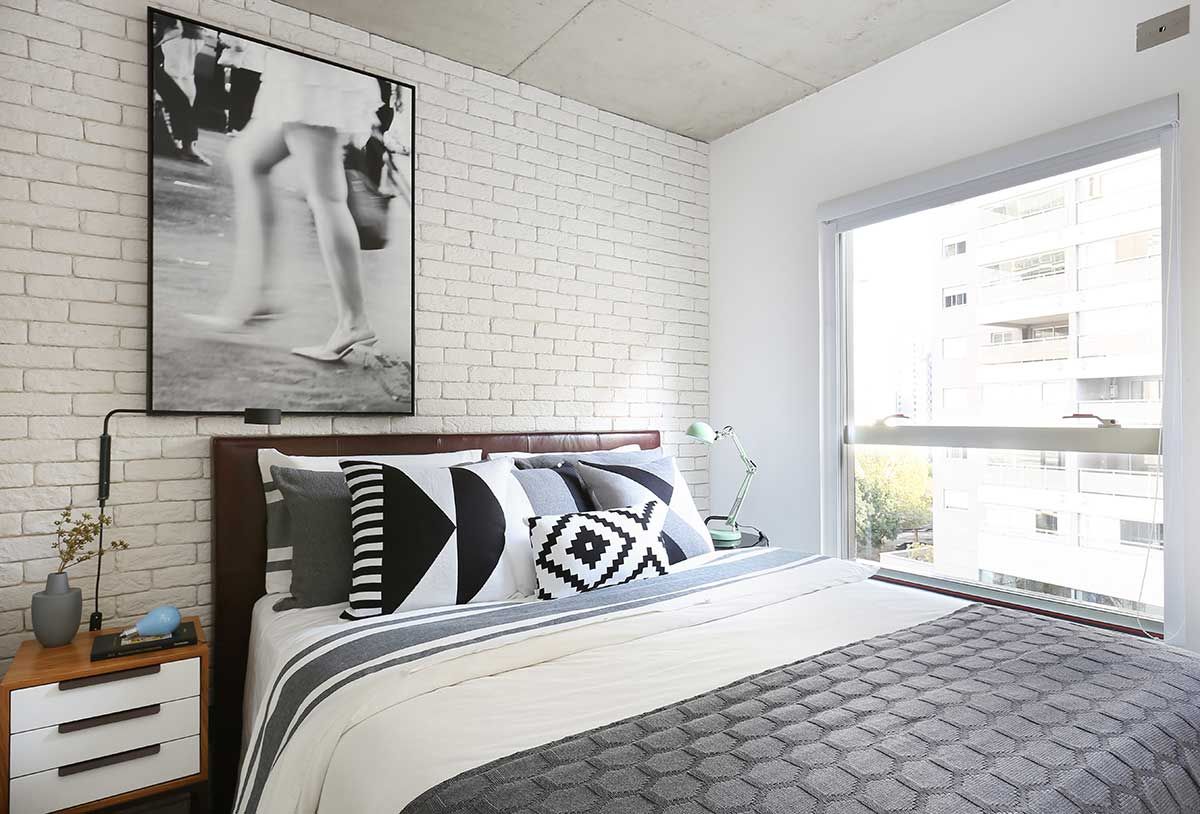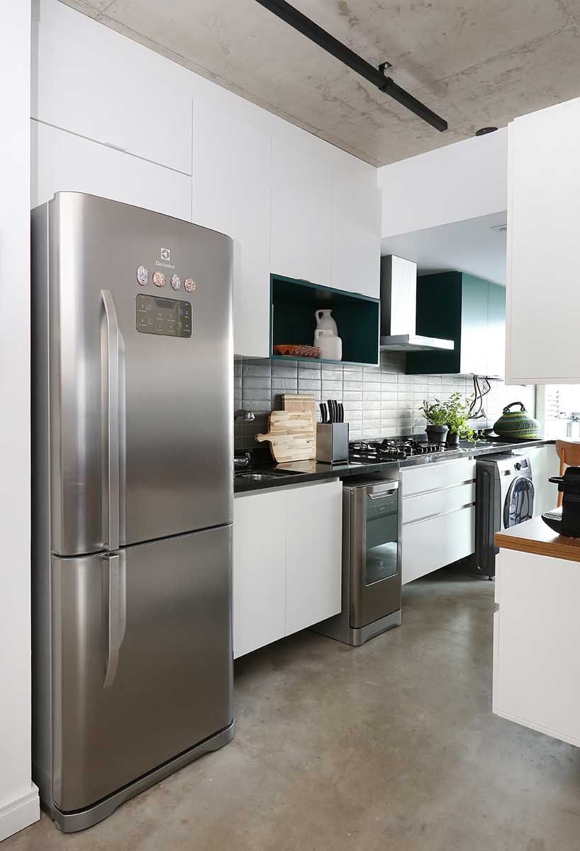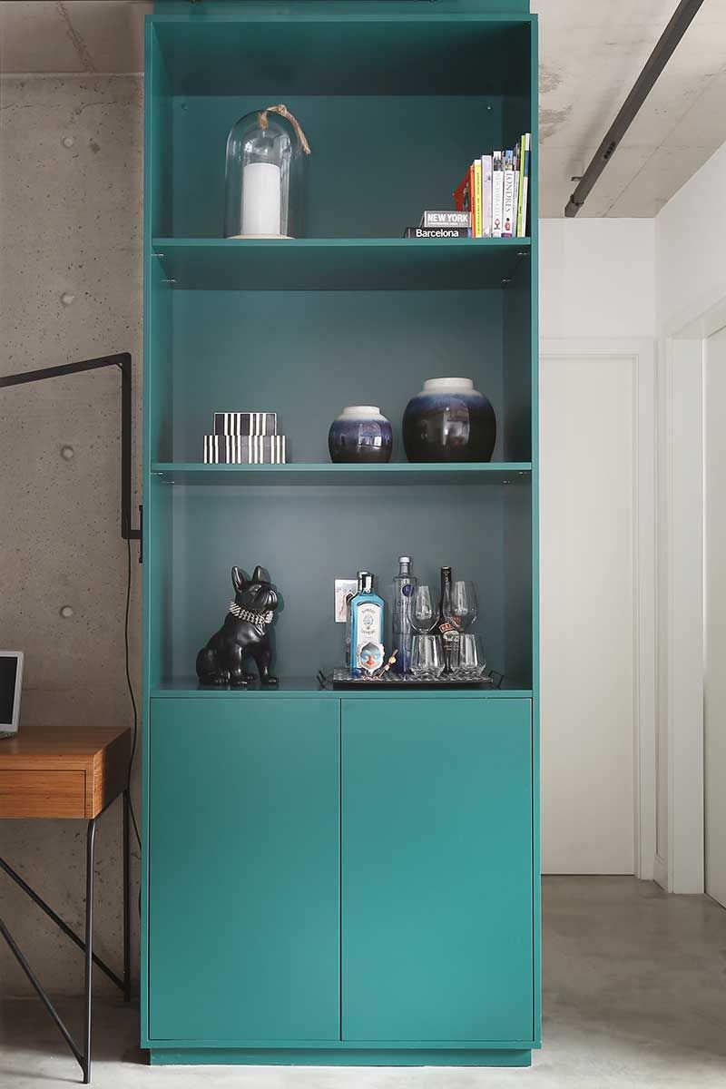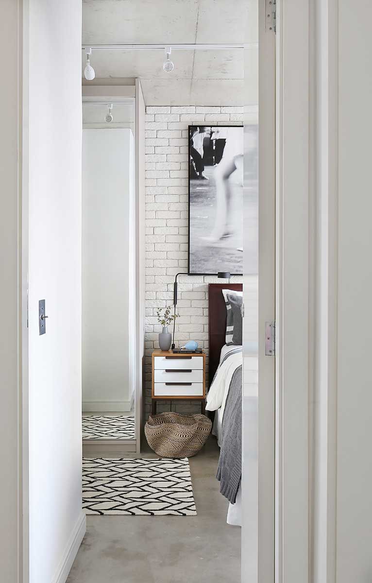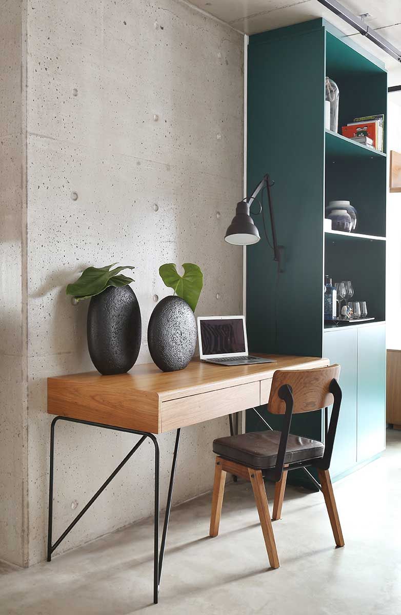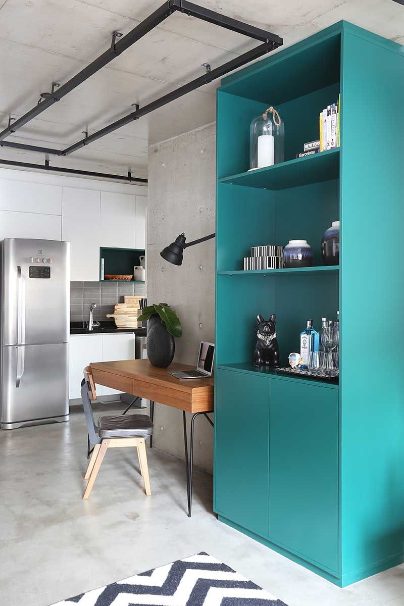 Ele é da Bahia e solicitou aos profissionais que a decoração incluíssem detalhes que remetessem ao seu local de origem unindo uma pitada do industrial. O piso de cimento, iluminação com eletrocalha, tijolinho branco aparente no quarto, foram elementos que contribuíram para essa atmosfera.