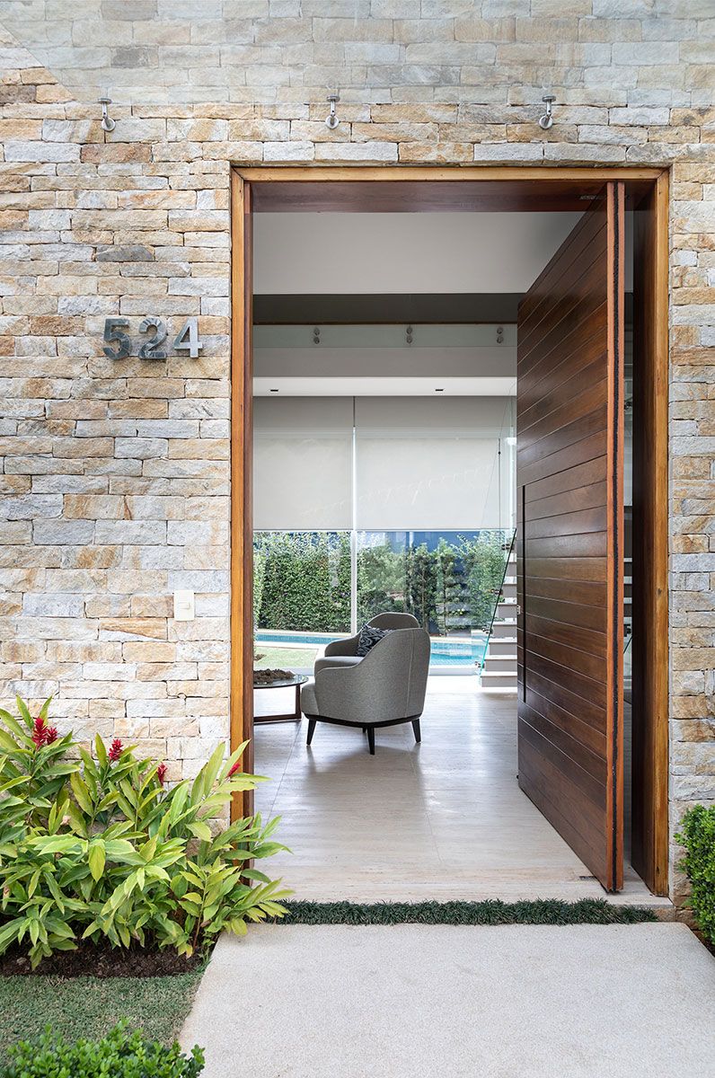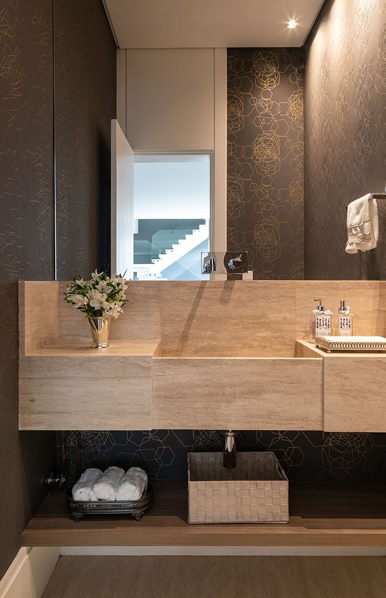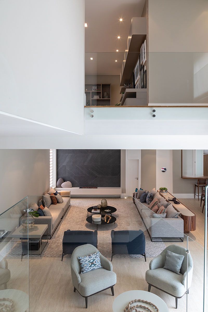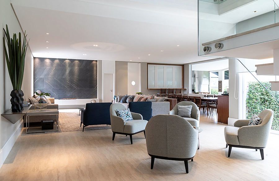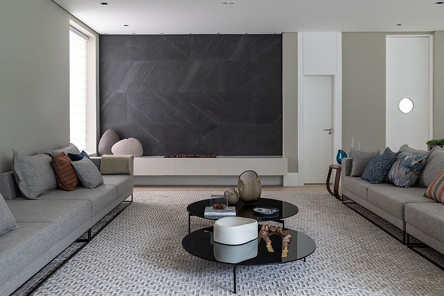 No térreo, o living é integrado com o jantar, lounge e varanda gourmet trazendo ainda mais amplitude ao imóvel. Foi escolhida uma paleta com cores sóbrias e texturas, madeira e revestimentos diferenciados. Na área social, o ponto de destaque da sala é a parede da lareira com revestimento em lamina de pedra na cor preta.