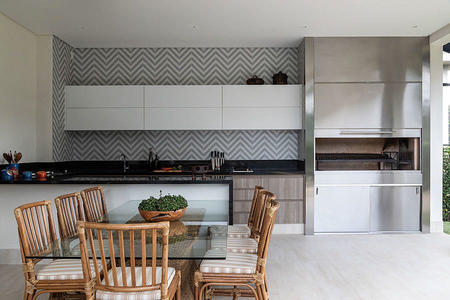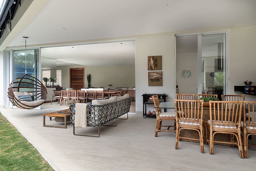 Na área externa, esta que já é privilegiada com uma vista cheia de verde, a área gourmet foi um dos ambientes mais importantes da casa. Para este espaço o escritório escolheu uma mistura de texturas, tecidos e aço inox na churrasqueira. Mas o destaque é o balanço em couro, que deixou o espaço mais relaxante.