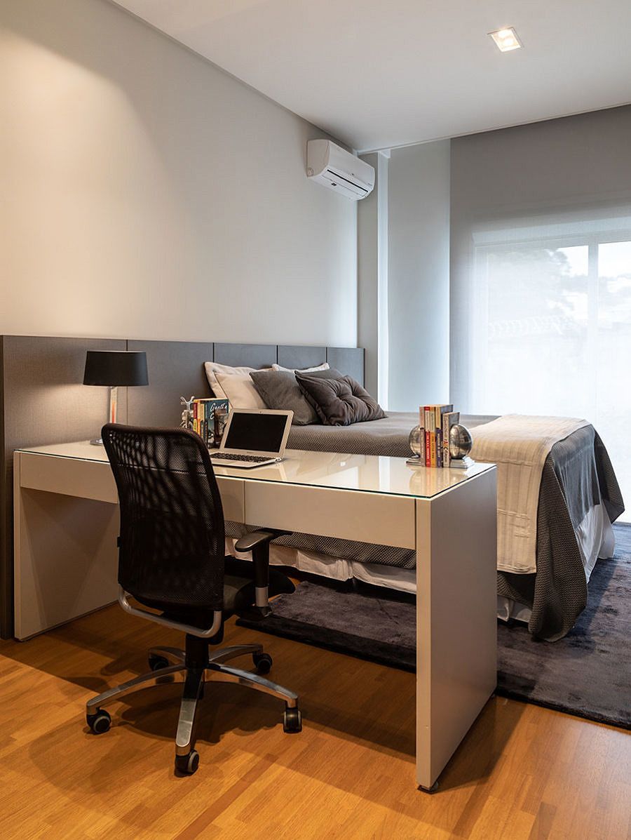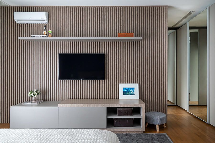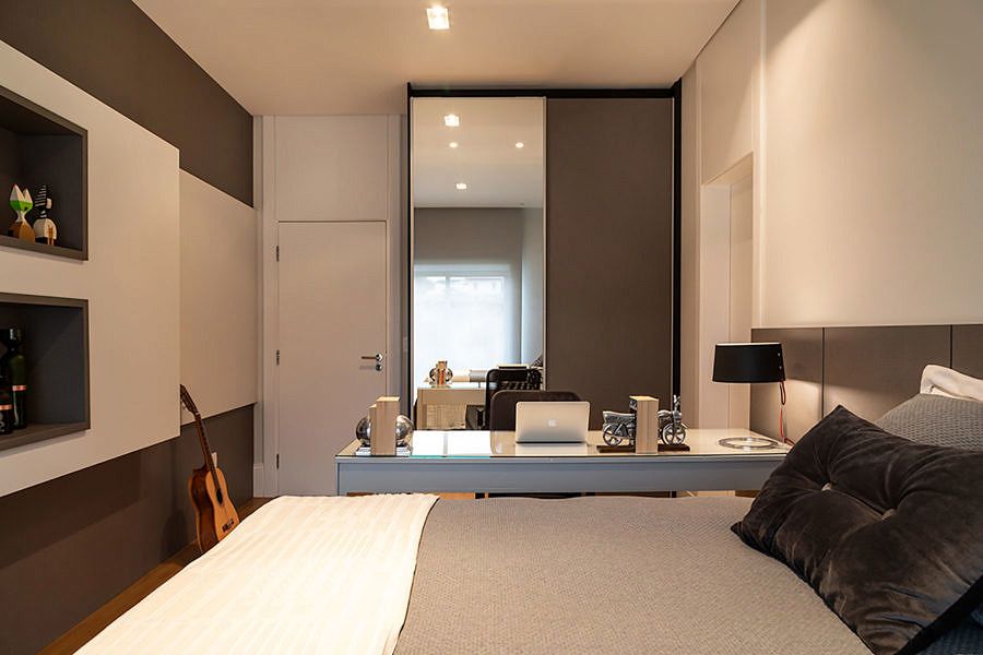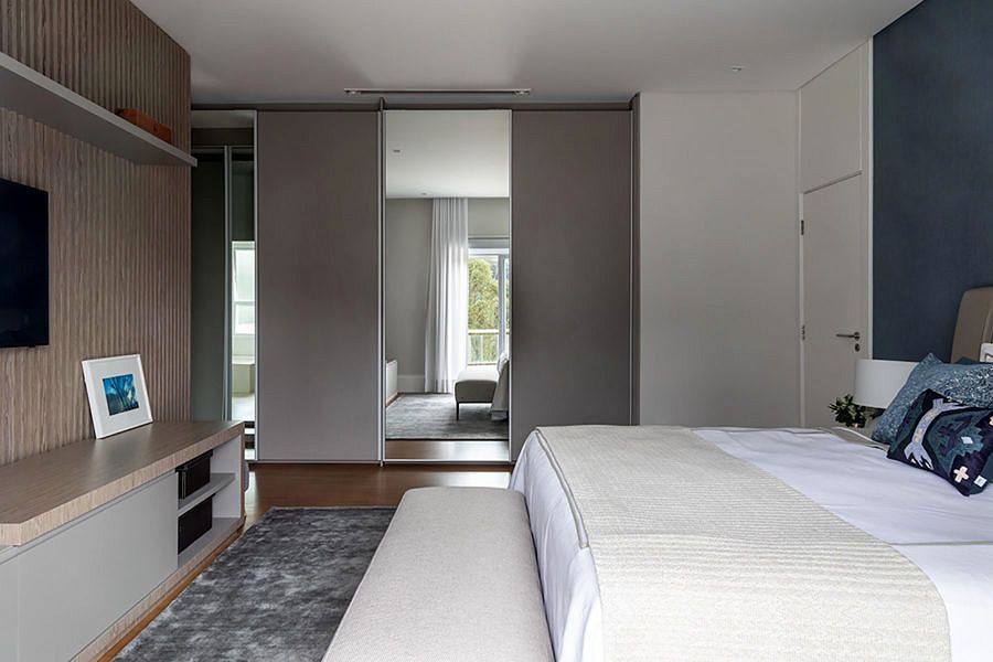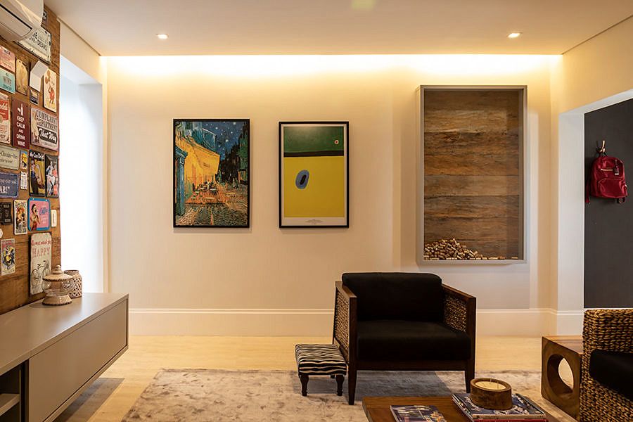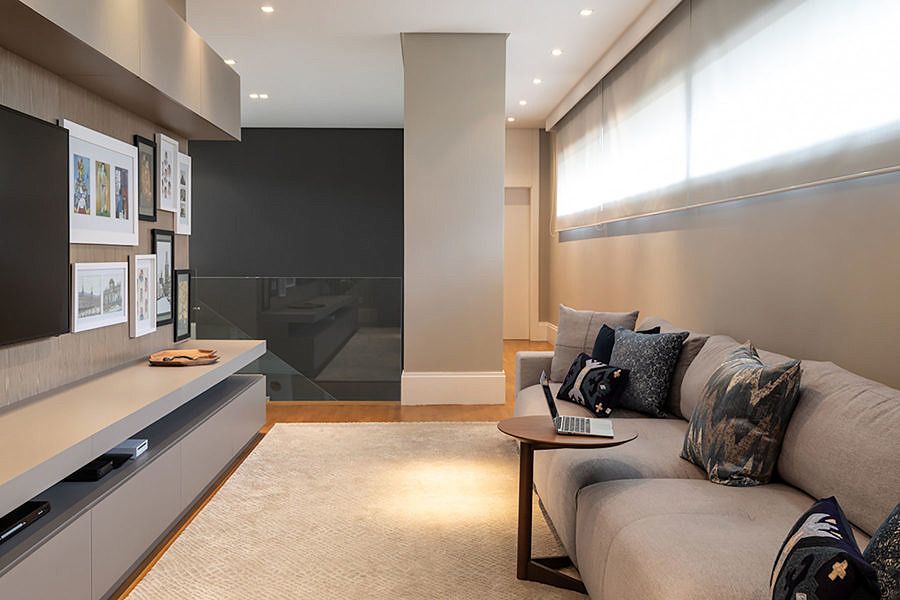 Ao subir as escadas para o pavimento dos quartos, a sala íntima é ponto de reunião da família no dia a dia. O aconchego desse ambiente e dos quartos pode ser percebido pelos tons quentes da marcenaria e o uso da madeira. Para os banheiros, a marcenaria foi o ponto chave e no da filha tem um espaço especial para os momentos de maquiagem.