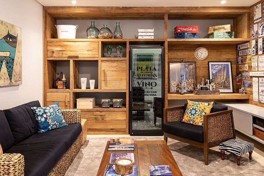 O pavimento de acesso da garagem conta com uma linguagem mais descontraída e bastante aconchegante para a adega, ambiente este que os clientes não abriam mão. A estante e o painel em madeira de demolição remetem aos barris de vinho e trazem um ar rústico para o espaço. O painel em marcenaria foi uma tela em branco para os clientes deixarem sua marca com as placas decorativas de diferentes lugares do mundo.