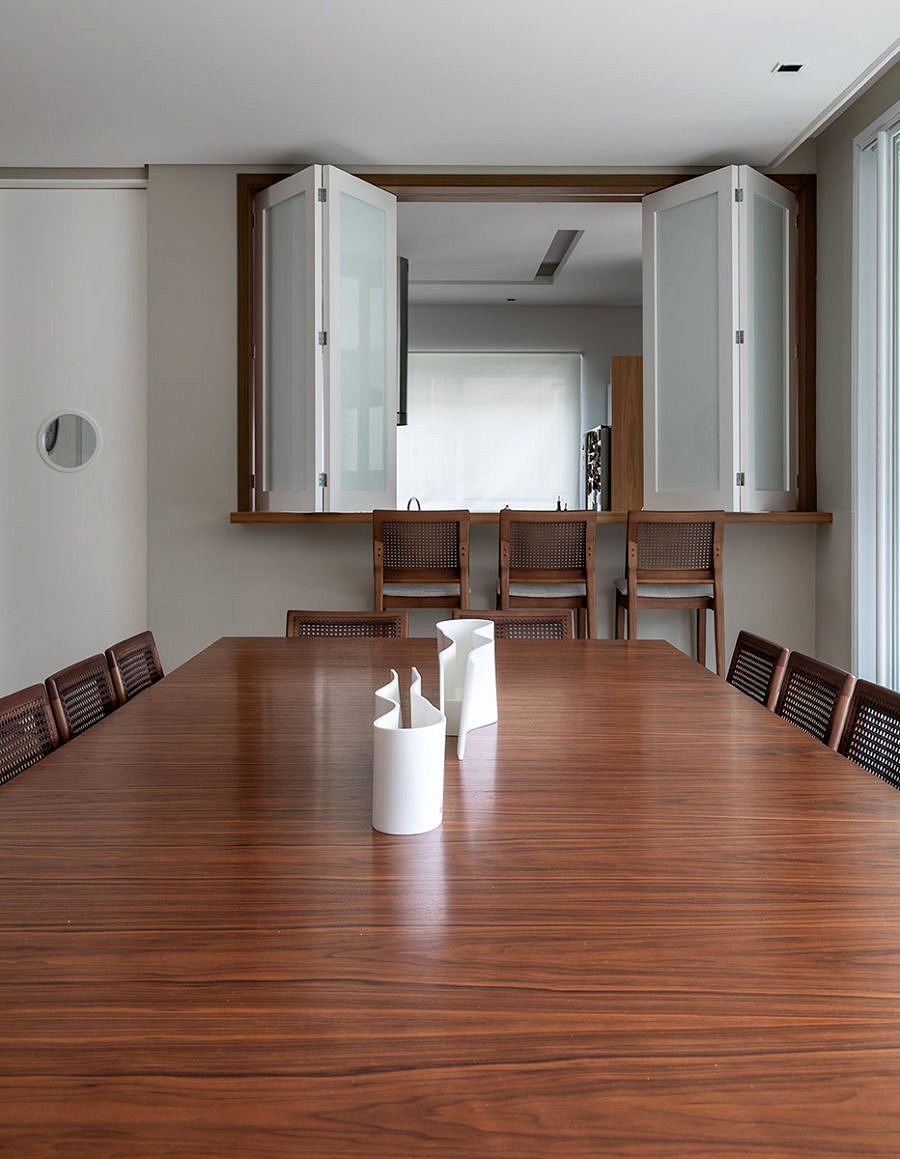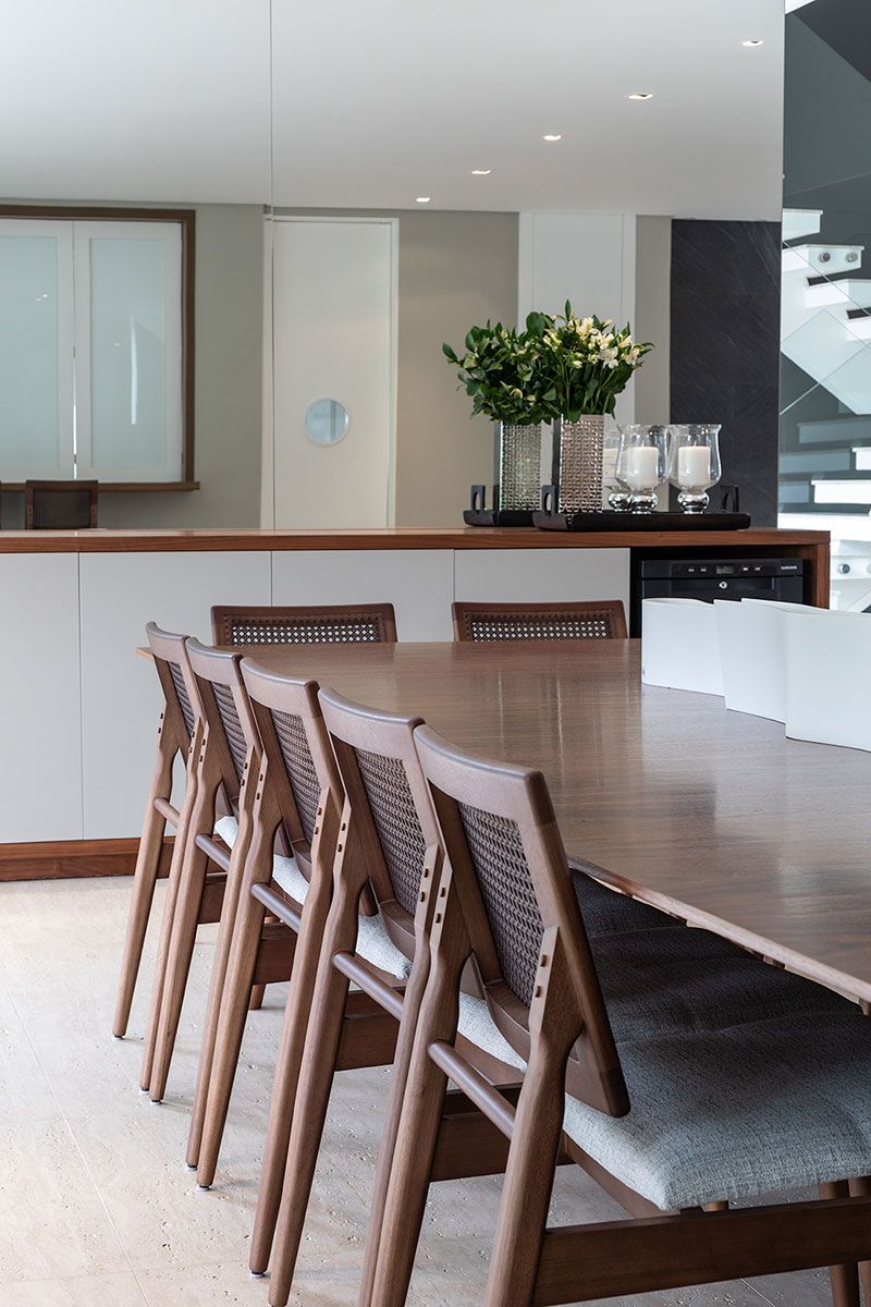A sala de jantar aloca até 14 pessoas, o ambiente foi pensado para as ocasiões de comemorações e reuniões com os amigos. Este espaço também pode contar com as banquetas dispostas na bancada que faz divisão e integração com a cozinha. A sensação de amplitude da área social, com o pé direito alto e grandes aberturas existentes, foi intensificada com o uso de um grande espelho na parede da sala de jantar.