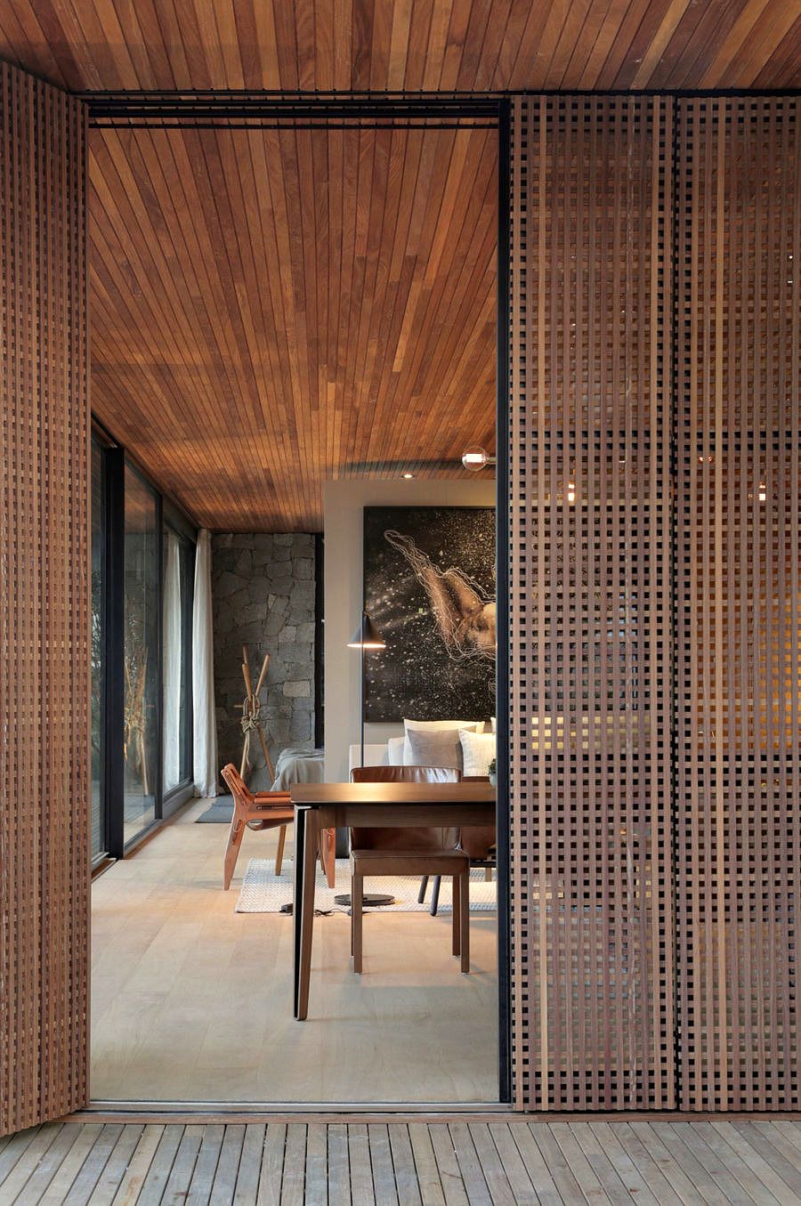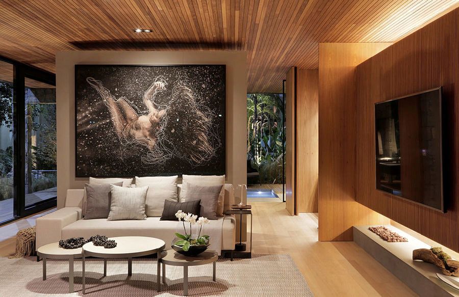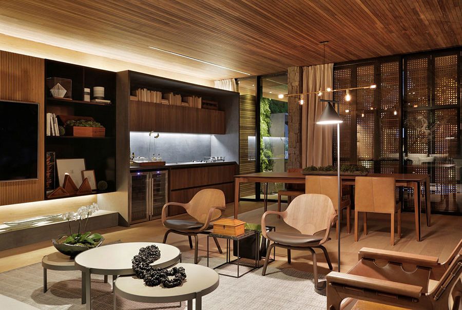 Sem barreiras, a casa é perfeita para o convívio e para receber amigos e familiares. Os pisos são revestidos com carvalho e o forro é de madeira, um revestimento único que une todos os espaços e reafirma a ideia de integração e amplitude. Os móveis em tons neutros, passeando pelos claros e madeirados, compondo um lar rústico.