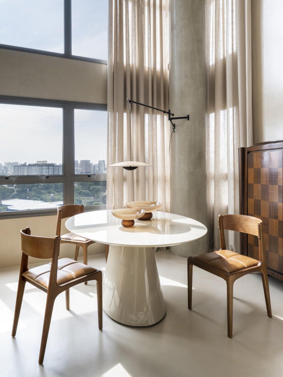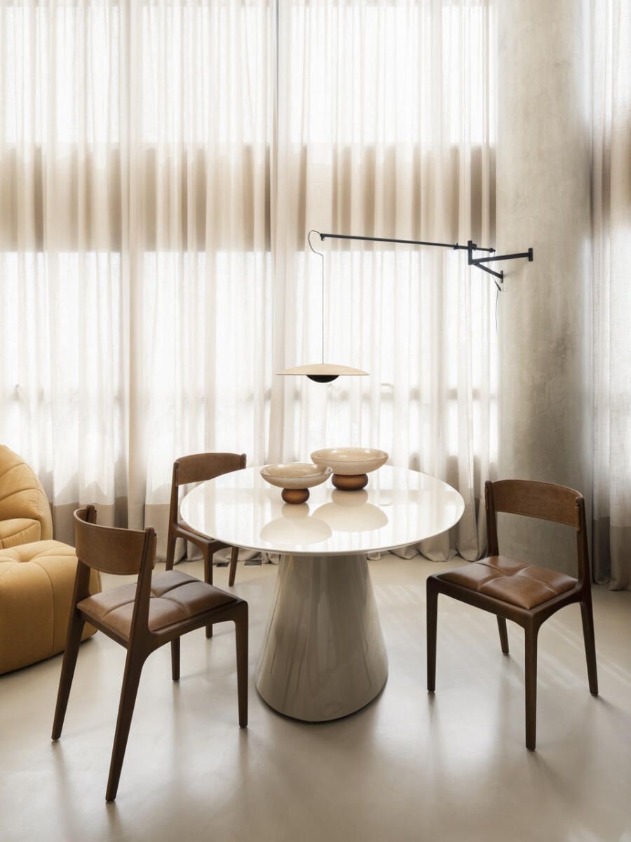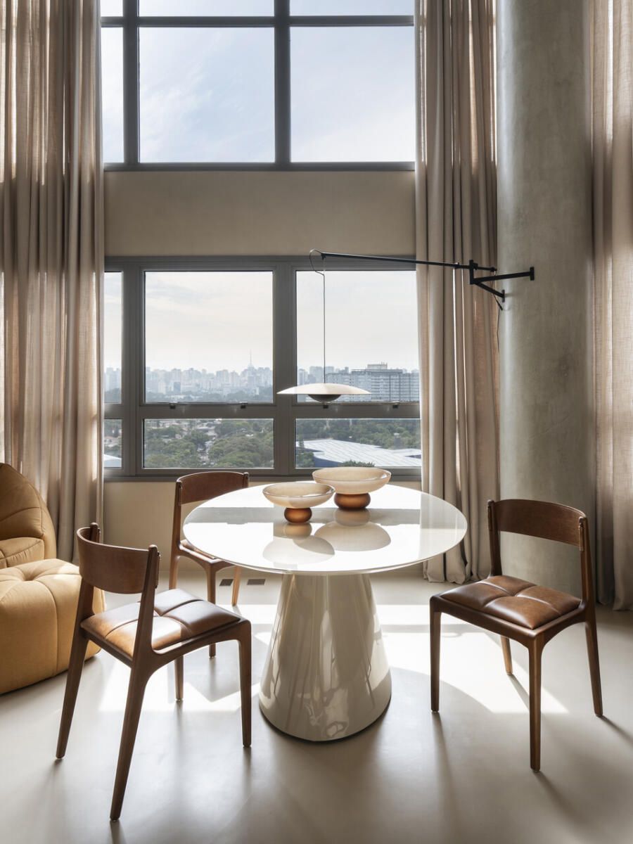O ambiente do jantar, com pé-direito duplo e vista aberta, acabou se tornando o mais representativo do projeto. O uso do mesmo revestimento no piso, paredes e teto reforça sua imponência, enquanto o brilho da mesa de jantar em resina reflete o entorno quase como um espelho. Sustentável em sua concepção, o projeto prioriza materiais de baixo impacto ambiental, iluminação de baixo consumo e preservação da ventilação natural, reduzindo a necessidade de climatização artificial e minimizando a geração de entulho.