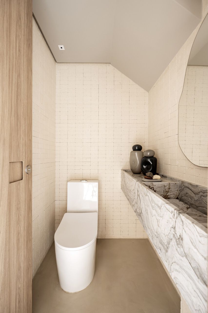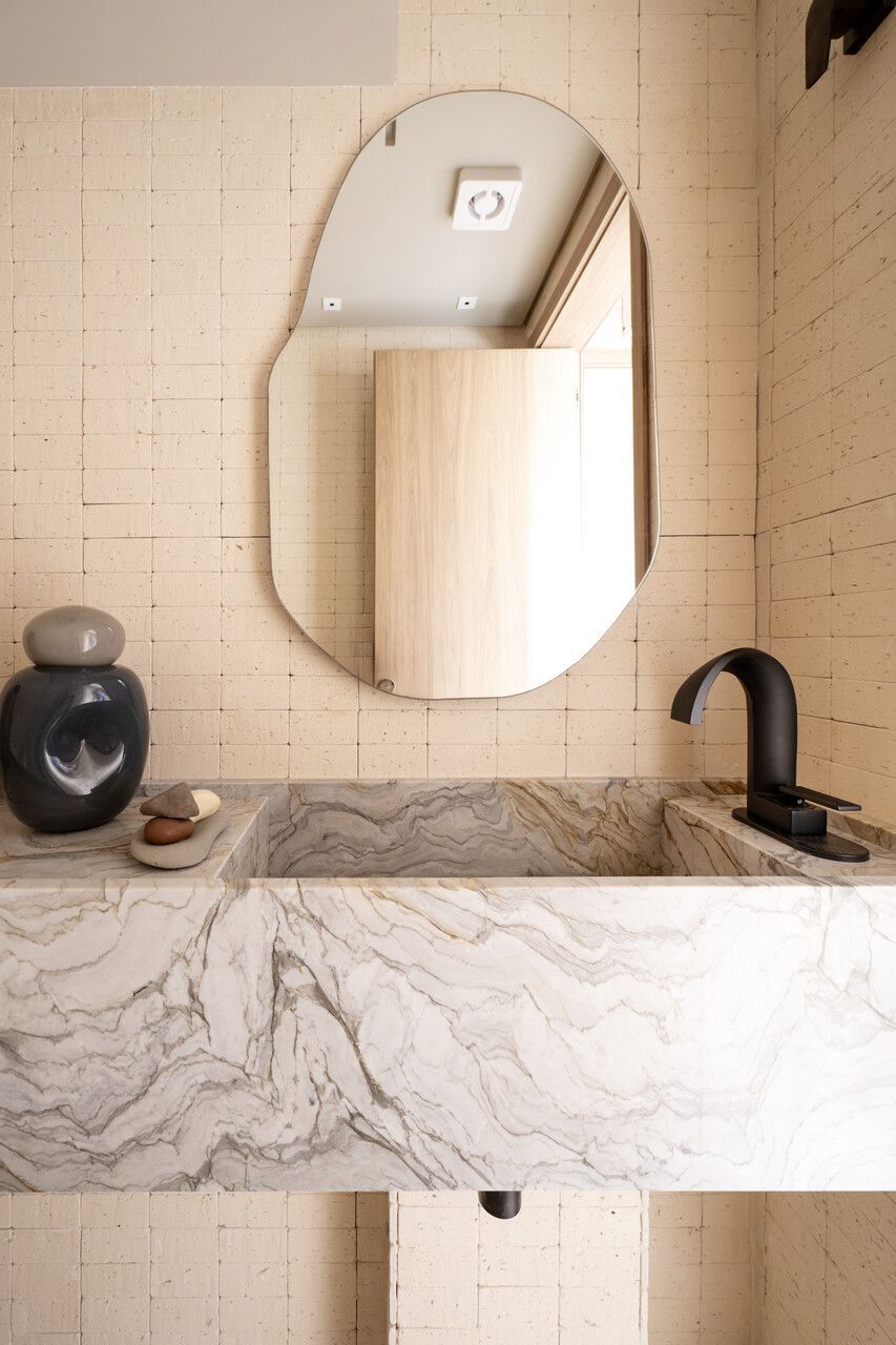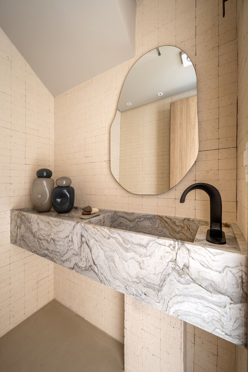 O ambiente do jantar, com pé-direito duplo e vista aberta, acabou se tornando o mais representativo do projeto. O uso do mesmo revestimento no piso, paredes e teto reforça sua imponência, enquanto o brilho da mesa de jantar em resina reflete o entorno quase como um espelho. Sustentável em sua concepção, o projeto prioriza materiais de baixo impacto ambiental, iluminação de baixo consumo e preservação da ventilação natural, reduzindo a necessidade de climatização artificial e minimizando a geração de entulho.
