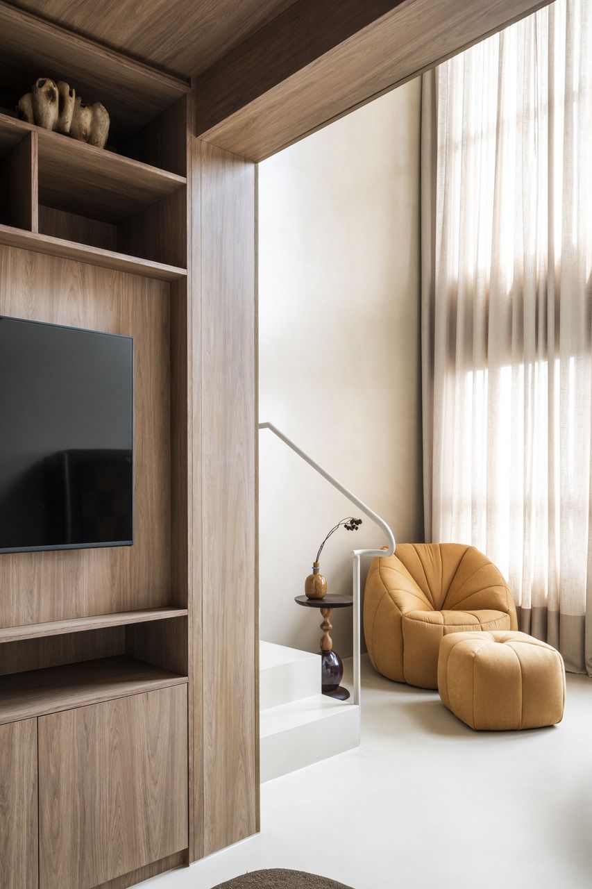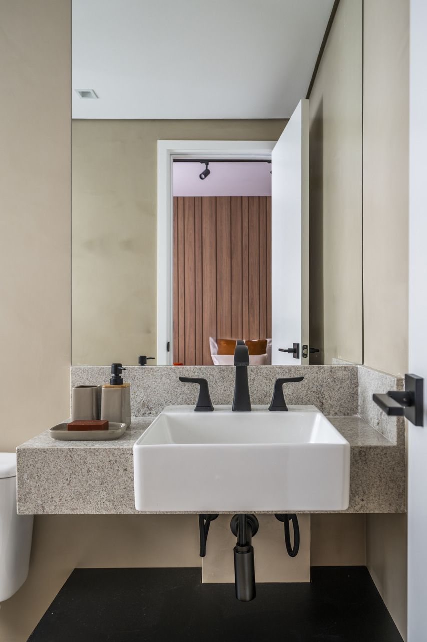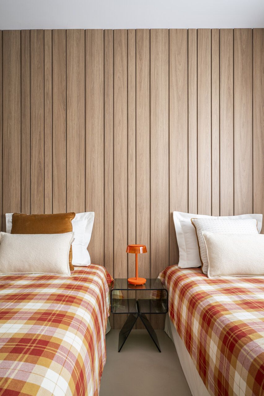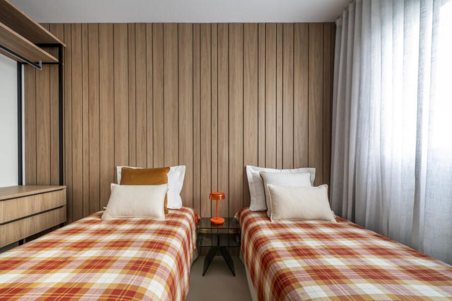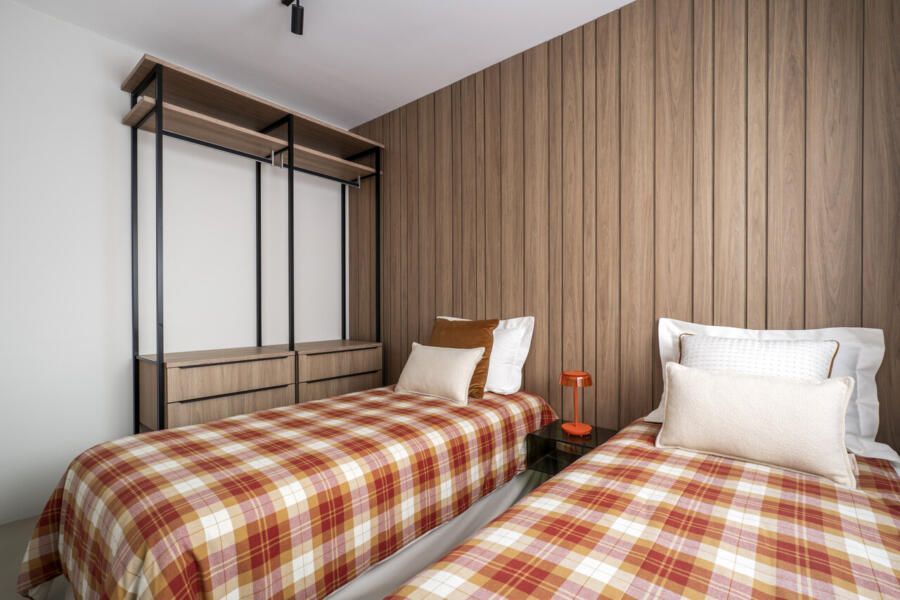 No piso térreo, estar, jantar e cozinha se integram de forma fluida, acompanhados por lavabo e lavanderia. O estar é marcado por um volume todo revestido em madeira, criando uma sensação de caixa acolhedora que abraça o mobiliário e dá boas-vindas a quem chega. No jantar, posicionado onde antes ficaria o estar, a mesa ocupa o centro do espaço para que a vista possa ser apreciada por todos. Ali, um cantinho de leitura, um bar em madeira maciça do acervo dos moradores e a arandela articulada de Joan Gaspar, instalada em um pilar de mais de cinco metros, se tornam protagonistas. A cozinha integrada aposta em materiais leves, prateleiras para livros e um painel que camufla o quadro de energia. Lavabo, lavanderia e dormitórios seguem a mesma lógica de funcionalidade e cuidado, com destaque para as cabeceiras desenhadas sob medida e o uso do revestimento monolítico também nos banheiros.