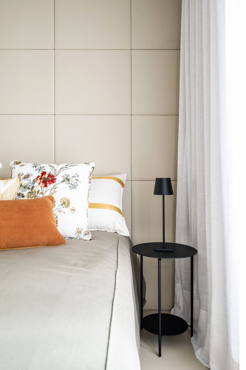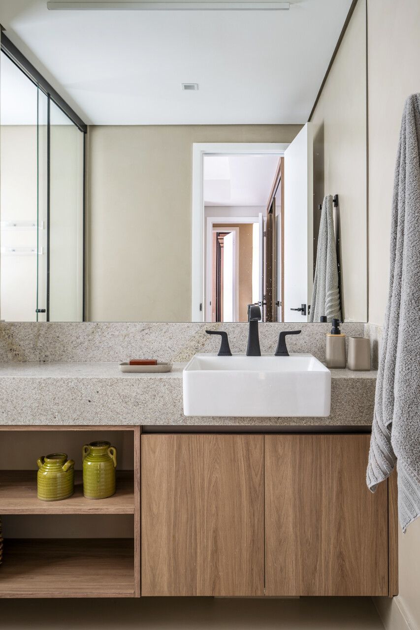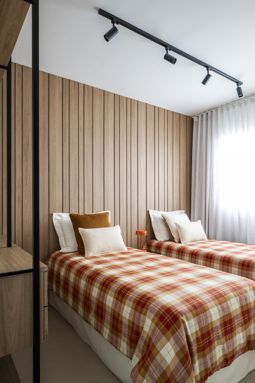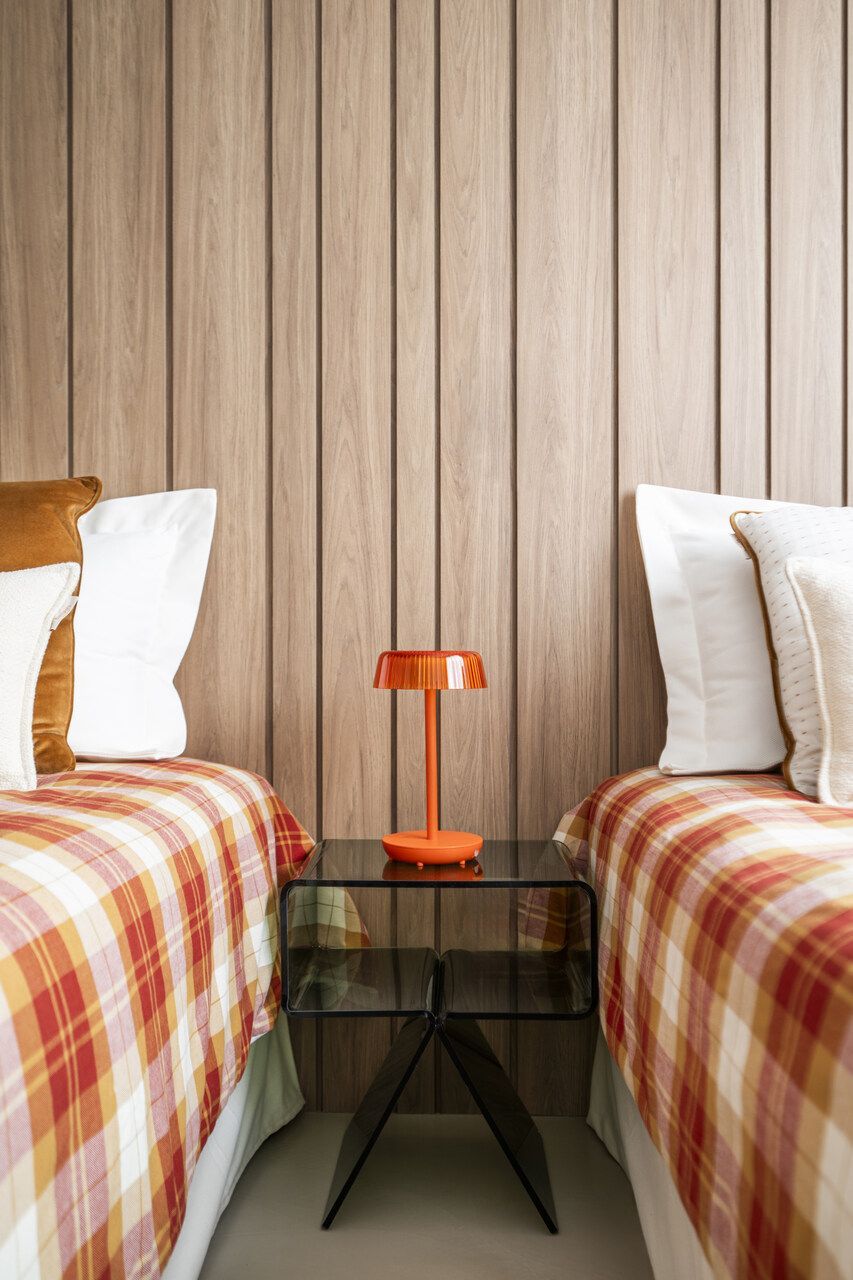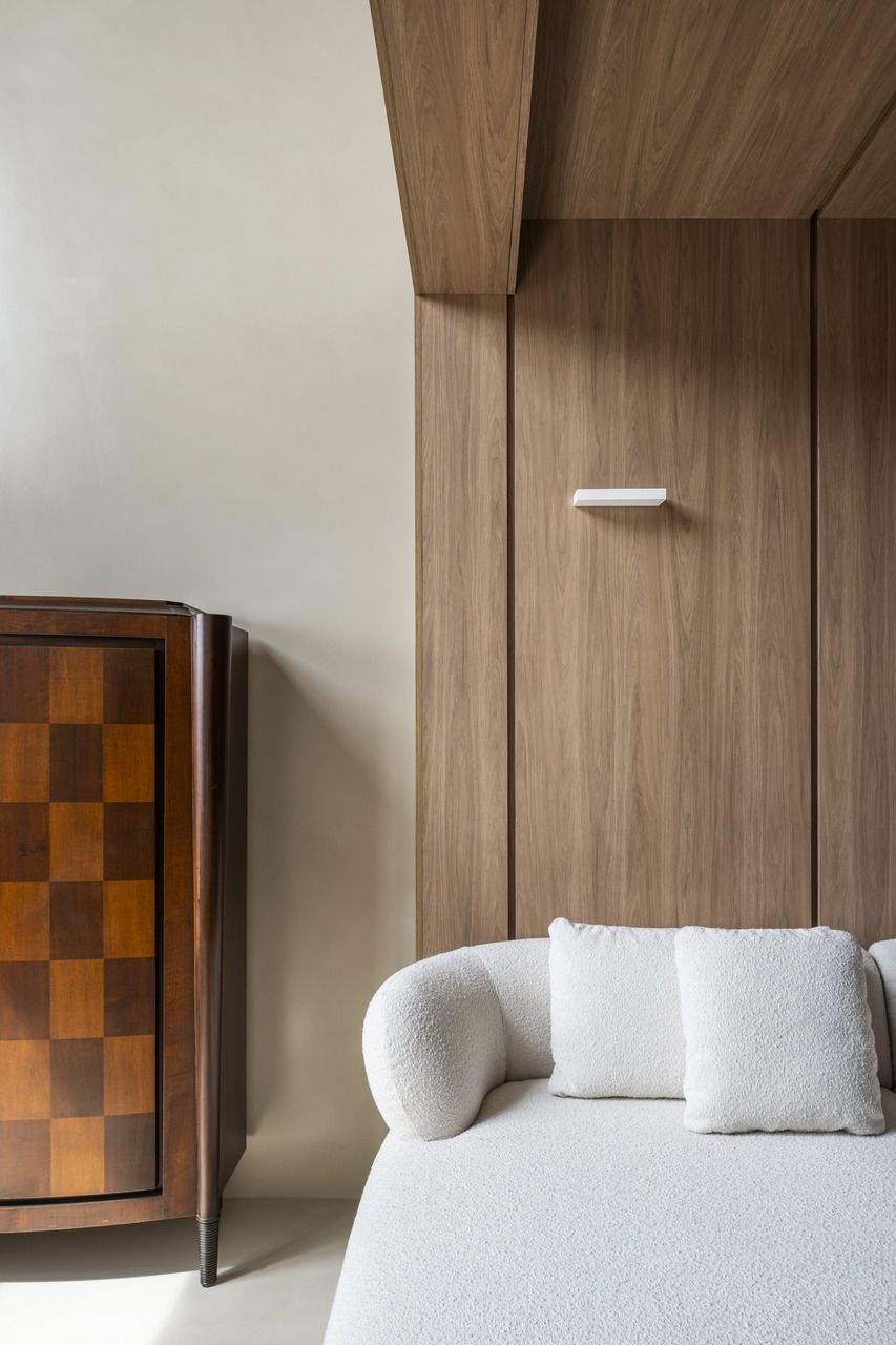 No piso térreo, estar, jantar e cozinha se integram de forma fluida, acompanhados por lavabo e lavanderia. O estar é marcado por um volume todo revestido em madeira, criando uma sensação de caixa acolhedora que abraça o mobiliário e dá boas-vindas a quem chega. No jantar, posicionado onde antes ficaria o estar, a mesa ocupa o centro do espaço para que a vista possa ser apreciada por todos. Ali, um cantinho de leitura, um bar em madeira maciça do acervo dos moradores e a arandela articulada de Joan Gaspar, instalada em um pilar de mais de cinco metros, se tornam protagonistas. A cozinha integrada aposta em materiais leves, prateleiras para livros e um painel que camufla o quadro de energia. Lavabo, lavanderia e dormitórios seguem a mesma lógica de funcionalidade e cuidado, com destaque para as cabeceiras desenhadas sob medida e o uso do revestimento monolítico também nos banheiros.