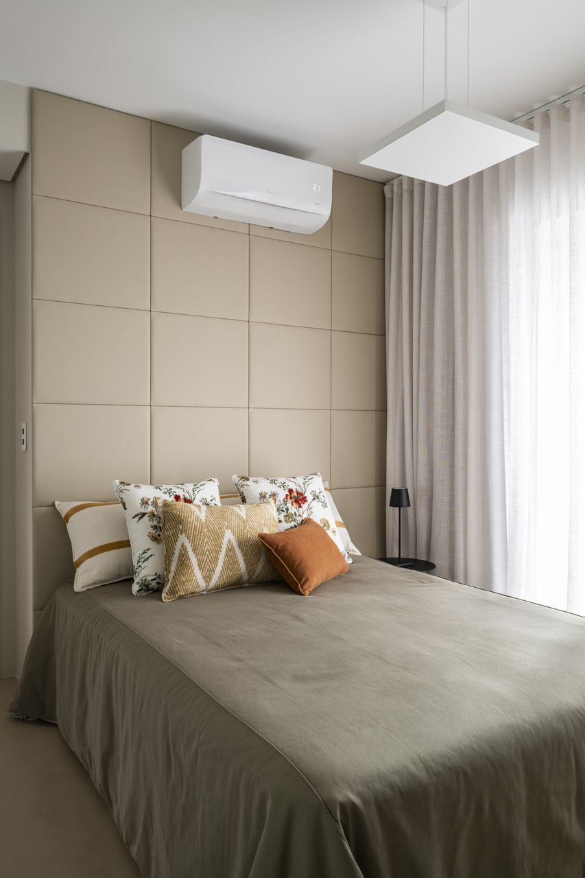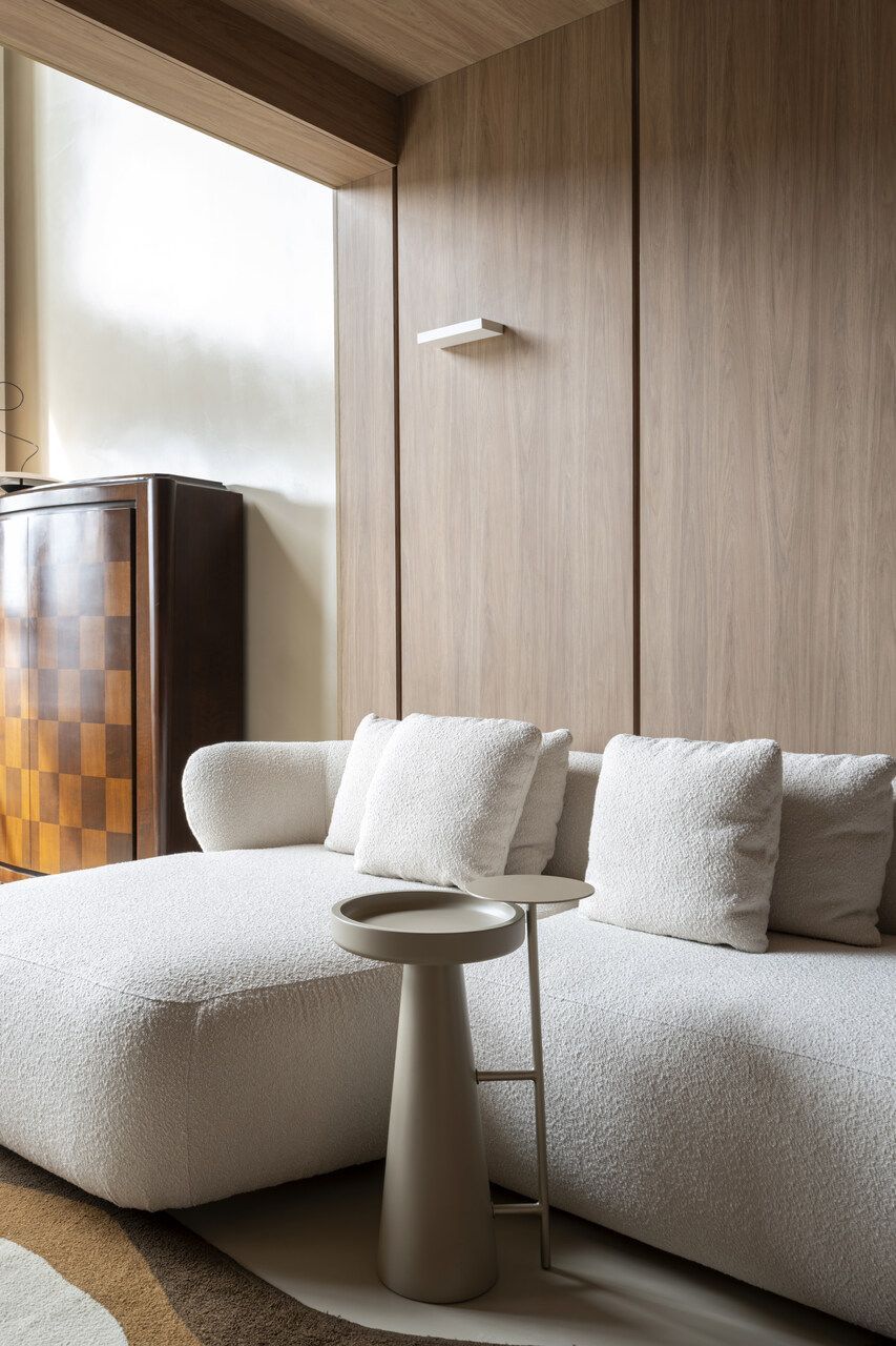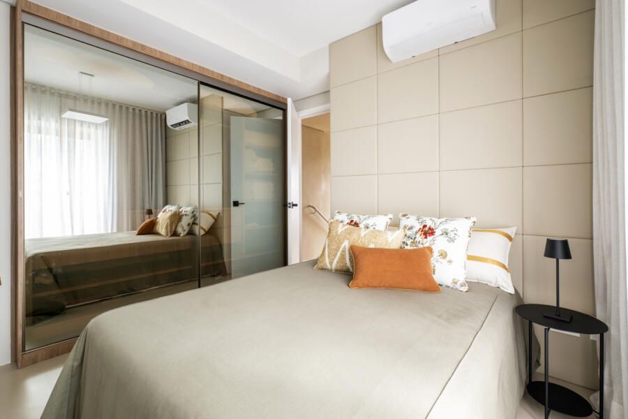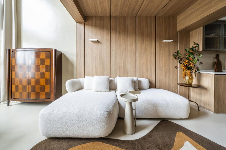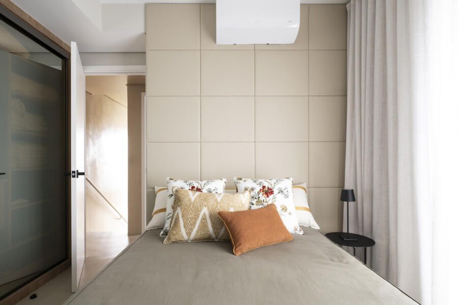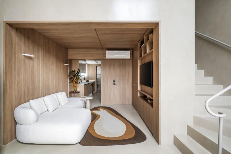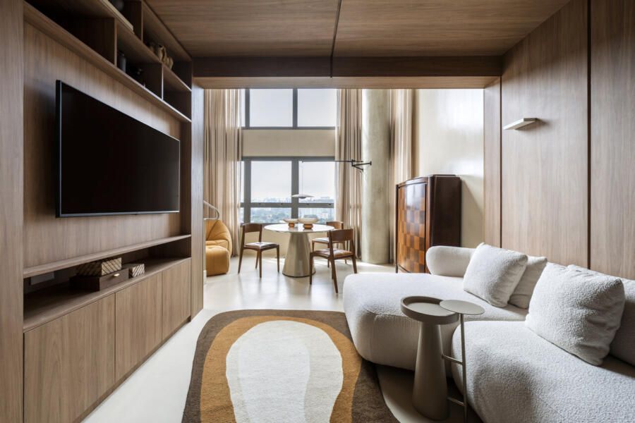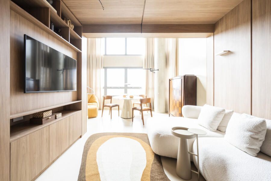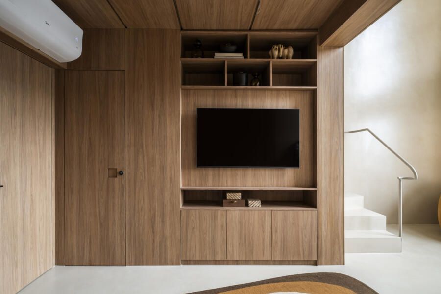 Entre os desafios, destacaram-se a busca por um revestimento resistente, contínuo e sem juntas para pisos e áreas molhadas, além do controle da incidência solar e do projeto de iluminação em um imóvel com pé-direito duplo. A solução veio com a aplicação de um revestimento monolítico em praticamente todo o apartamento, aliado a uma marcenaria minuciosamente planejada, capaz de organizar e armazenar os pertences dos moradores sem comprometer a leveza visual.