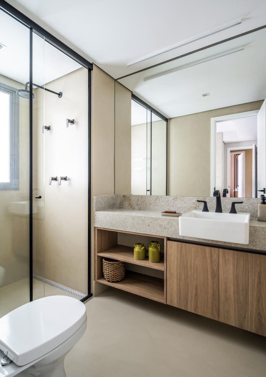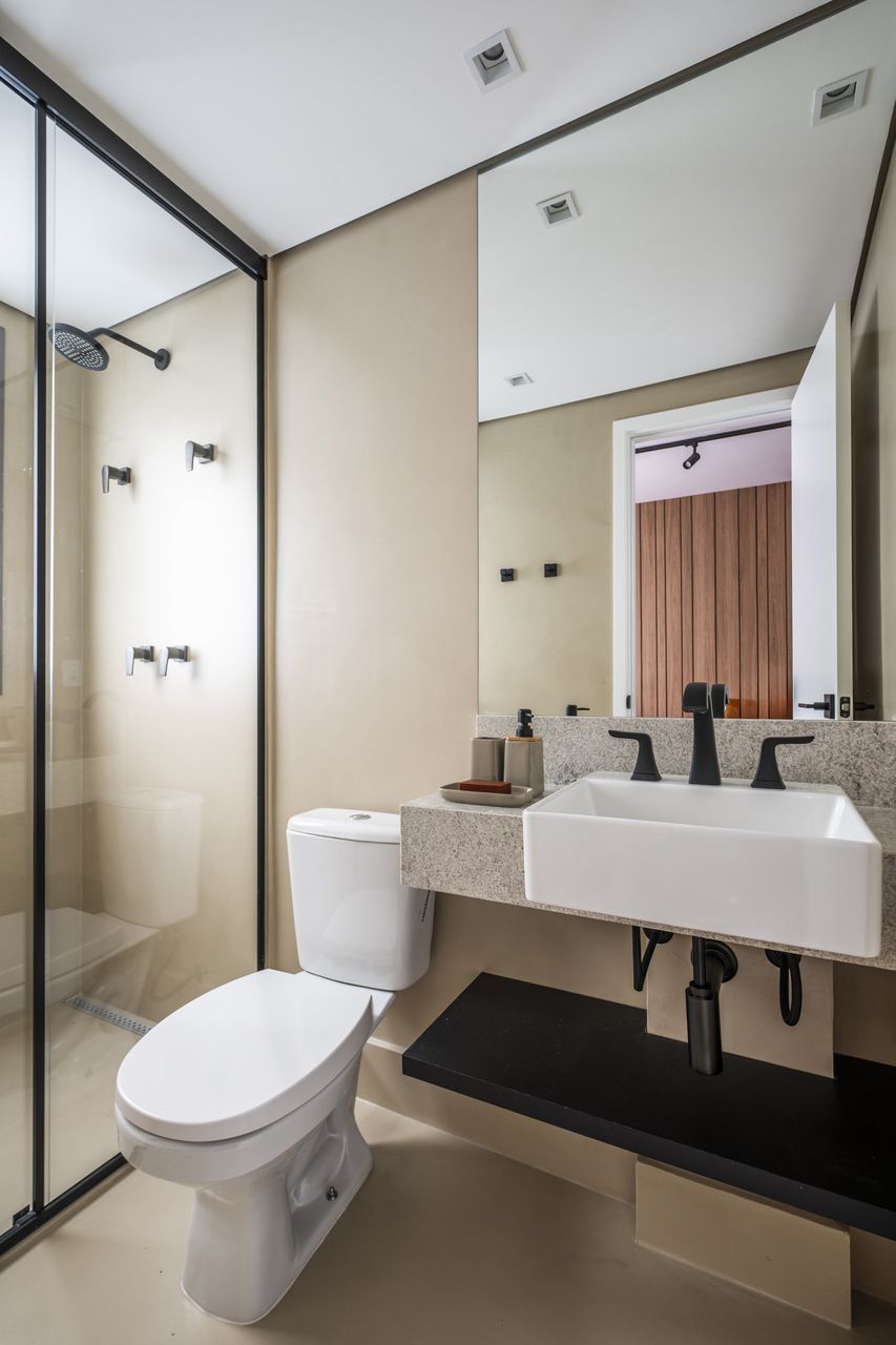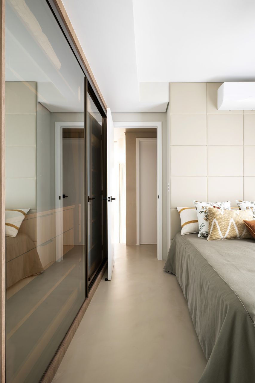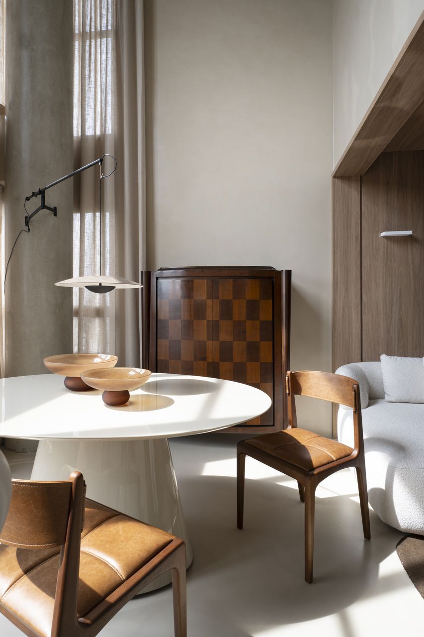 “Adoramos a unicidade que conseguimos realizar através do uso do revestimento monolítico no piso, paredes e teto de quase todo o apartamento. Com isso tivemos uma base neutra onde trabalhamos com bastante liberdade o conceito do projeto.”