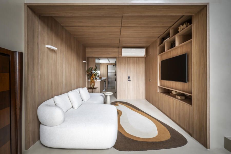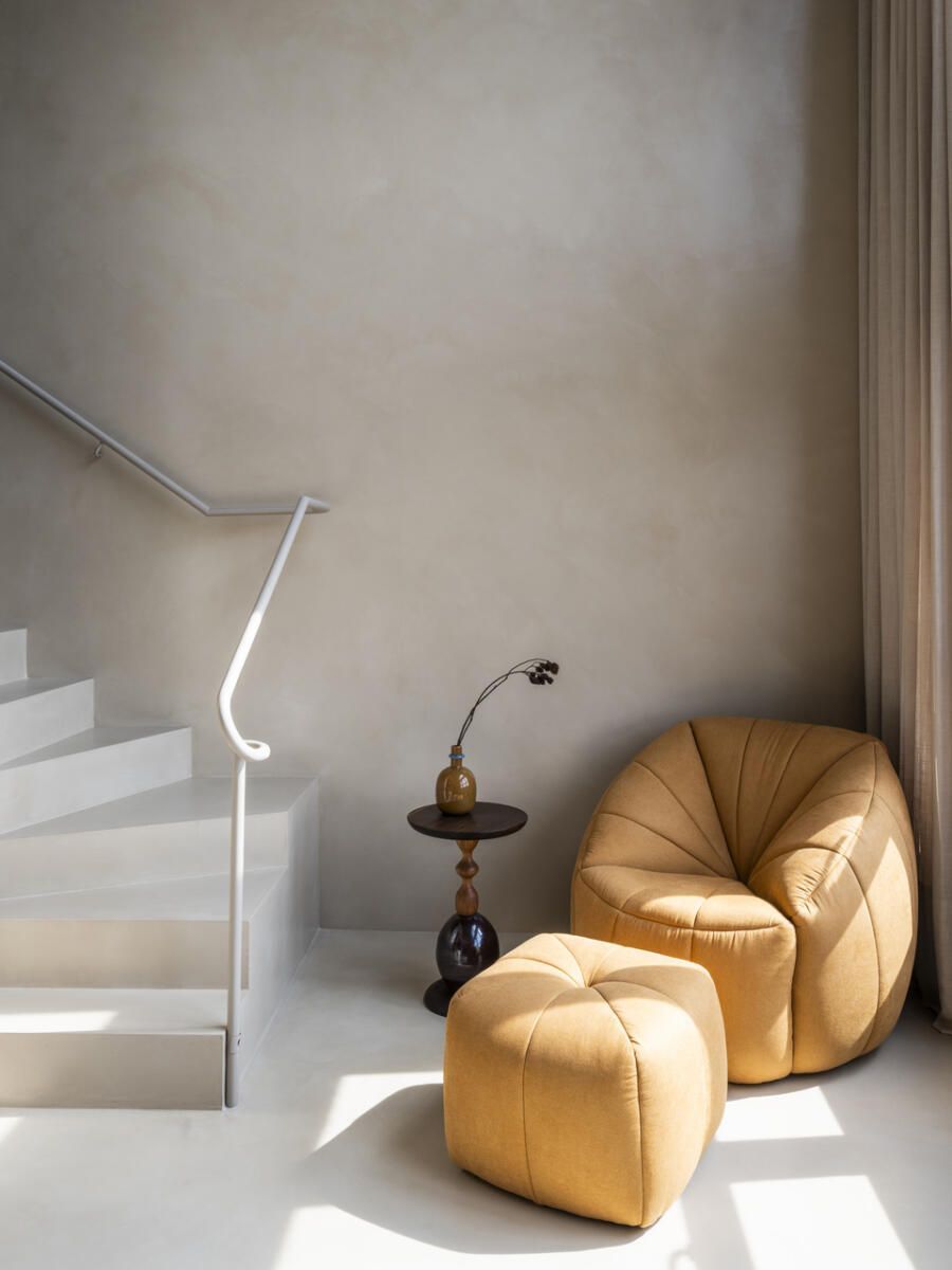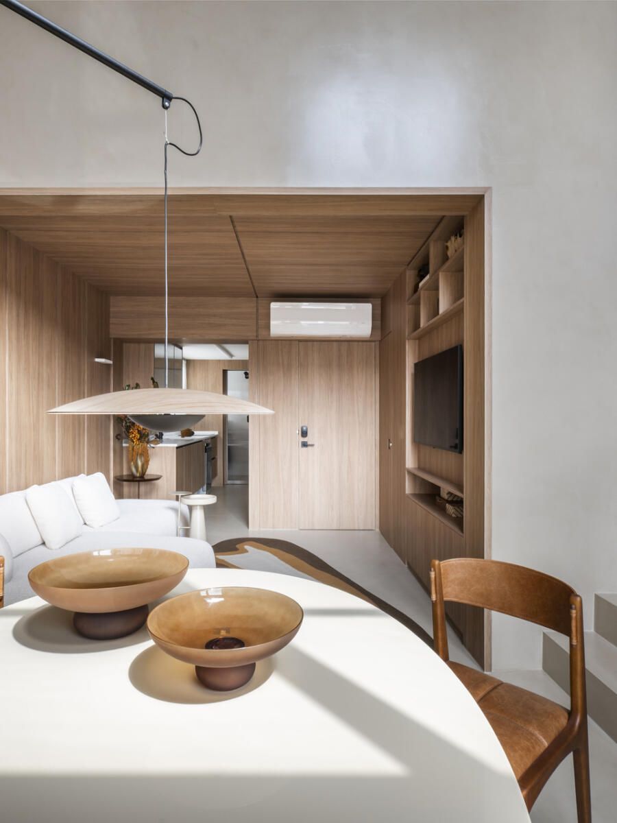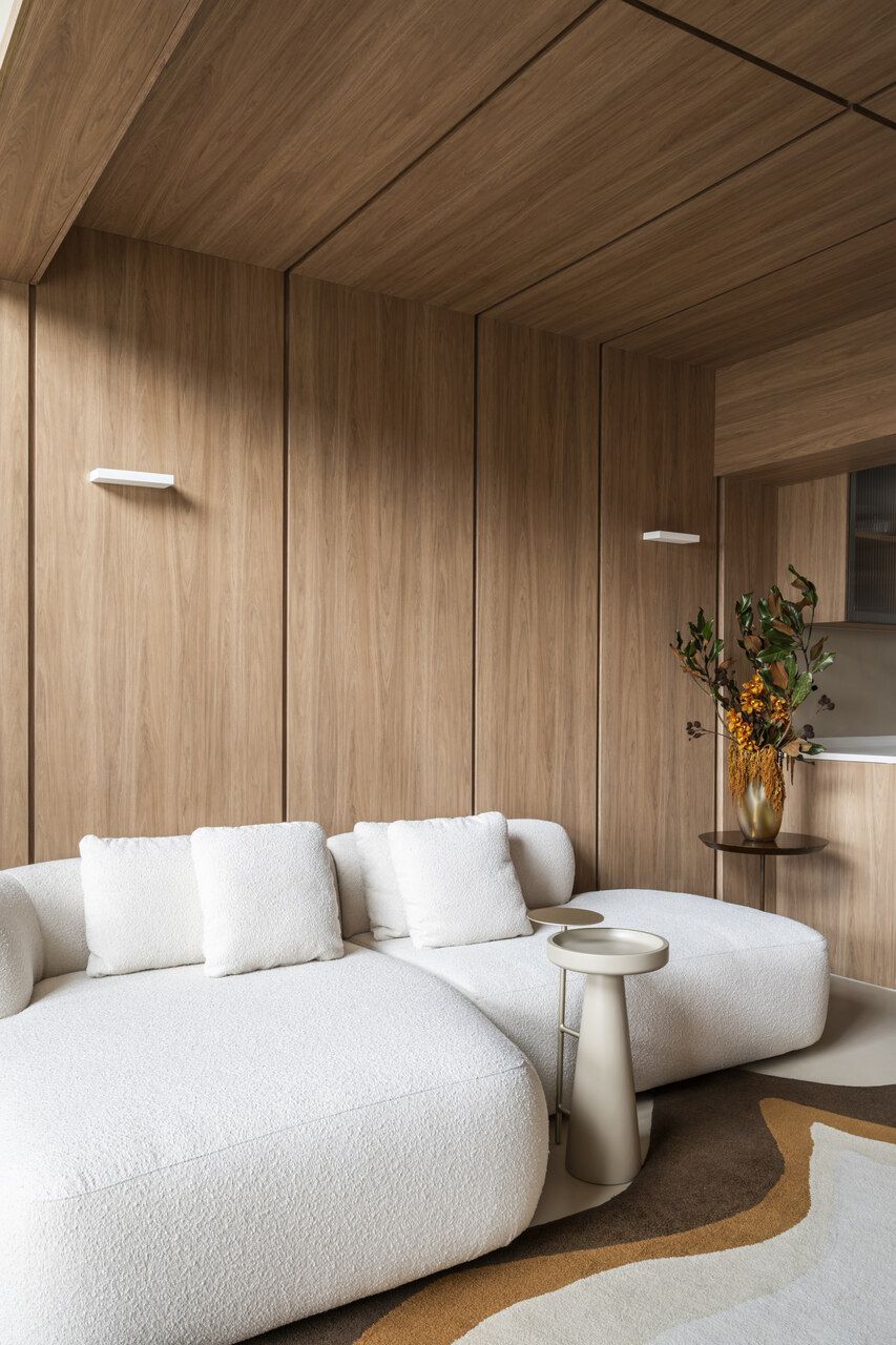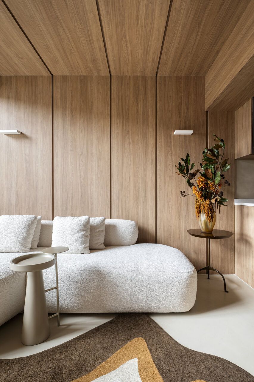 A paleta de cores aposta em tons de bege, com detalhes em caramelo, marrom e mostarda presentes no mobiliário, criando uma base neutra e elegante. O revestimento monolítico percorre piso, paredes e até teto, enquanto a lâmina de MDF no tom moscato aparece em todos os móveis planejados, reforçando a unidade do projeto. O estilo minimalista ganha contornos orgânicos e esculturais, resultando em ambientes claros, contínuos e visualmente amplos.