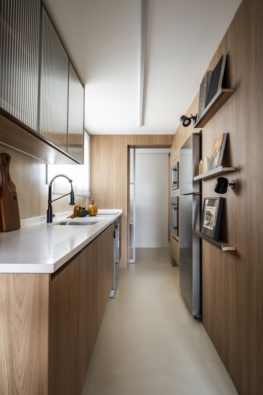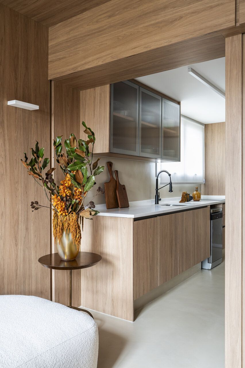 Quando o pedido chegou ao escritório, a principal demanda era clara: criar uma cozinha funcional e integrada ao estar. A cliente mantém uma relação afetiva profunda com a culinária, e cada preparo carrega histórias, memórias e sensações. Essa conexão guiou as decisões do projeto, que tratou os ambientes como uma composição cuidadosa e onde tudo foi pensado de forma precisa.