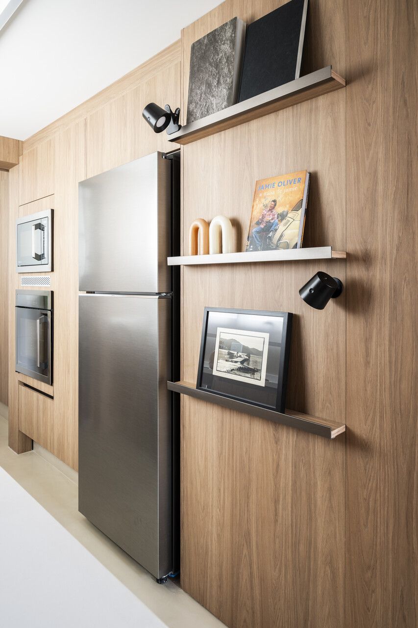 O contexto também favoreceu a fluidez do processo: o Estúdio AMADAS já havia assinado outro projeto para os mesmos clientes, o que garantiu sintonia e confiança desde o início. Por se tratar de uma reforma, algumas mudanças estruturais foram decisivas, como a ampliação da integração entre estar e cozinha, antes separados por uma passagem estreita, e o fechamento lateral da escada, que permitiu a criação de um móvel sob medida, ampliando a funcionalidade do espaço.