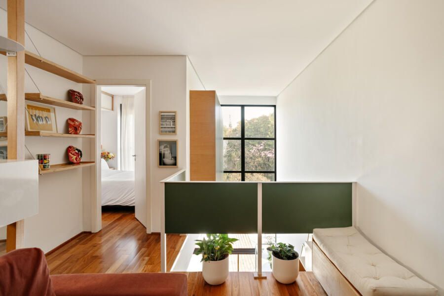 Na suíte compacta, o desenho foi ainda mais estratégico. Não havia espaço para uma cama de casal e um guarda-roupa convencional sem comprometer a circulação. A resposta do Studio Papaya foi deslocar o armário principal para a abertura voltada ao pé-direito duplo, criando um guarda-roupa suspenso que funciona como volume escultórico para o estar e, ao mesmo tempo, libera a área da cama no pavimento superior. Uma solução que soma leveza visual e eficiência espacial.