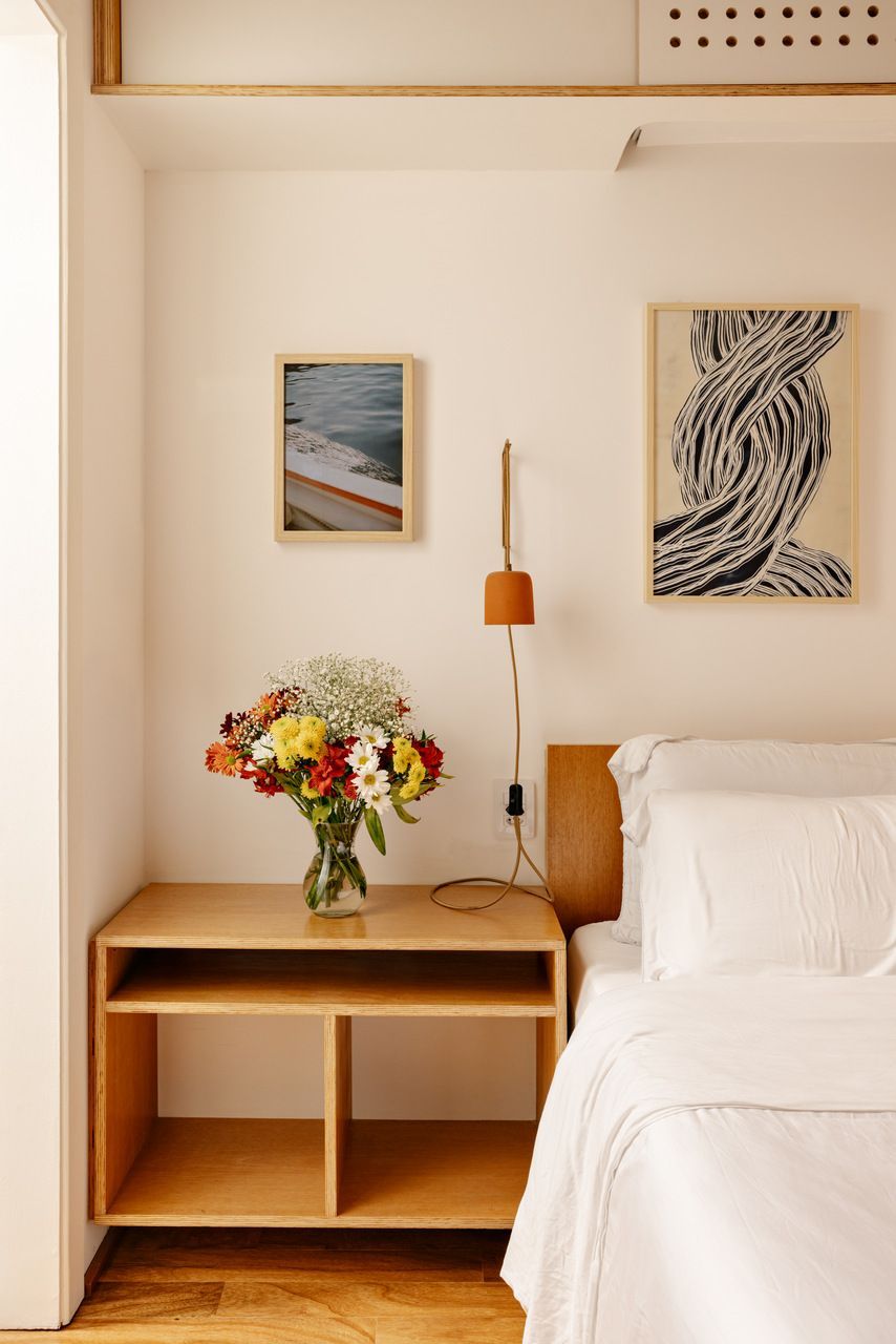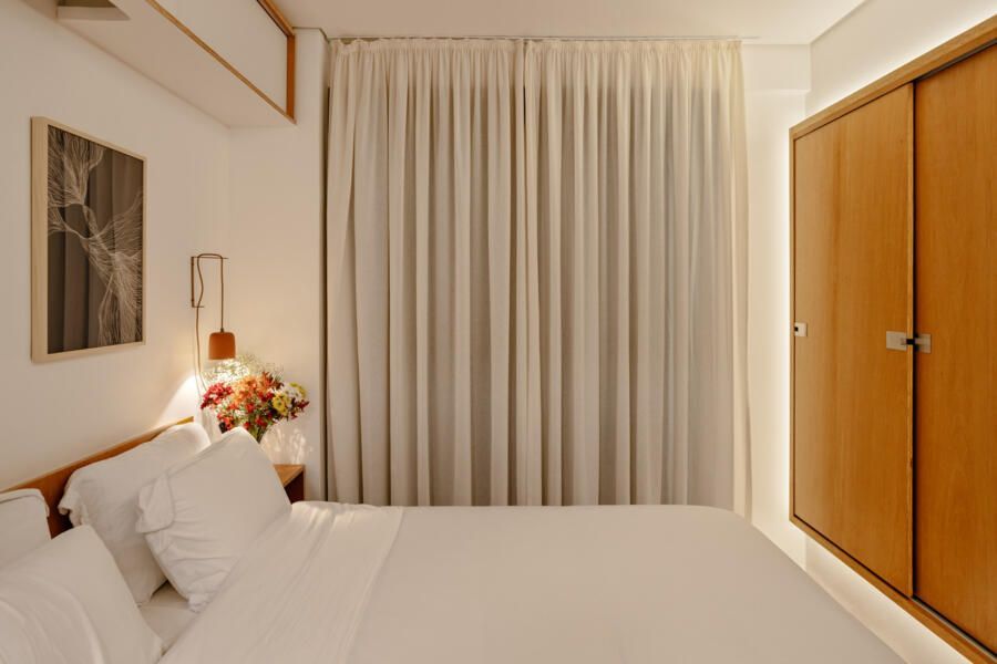 Na suíte compacta, o desenho foi ainda mais estratégico. Não havia espaço para uma cama de casal e um guarda-roupa convencional sem comprometer a circulação. A resposta do Studio Papaya foi deslocar o armário principal para a abertura voltada ao pé-direito duplo, criando um guarda-roupa suspenso que funciona como volume escultórico para o estar e, ao mesmo tempo, libera a área da cama no pavimento superior. Uma solução que soma leveza visual e eficiência espacial.