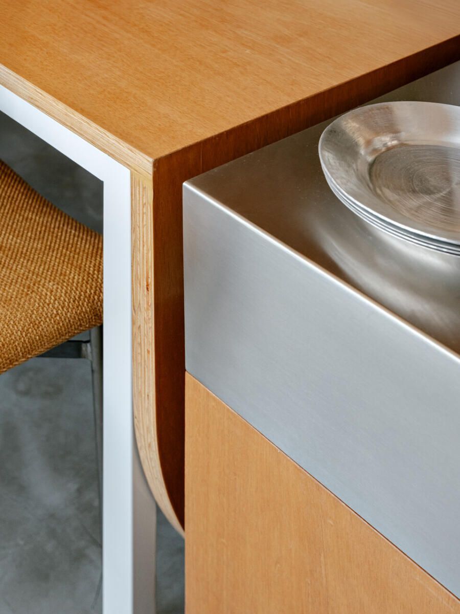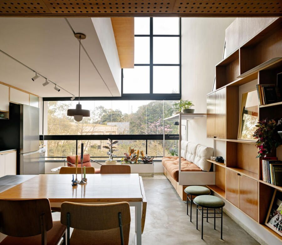 No pavimento inferior, o pedido era claro: integrar para ampliar. Cozinhar, trabalhar, receber, jantar e relaxar precisavam coexistir com fluidez. A solução veio por meio de mobiliário autoral e inteligente: mesa dobrável, aparador com módulo deslizante, sofá com baús sobre rodízios e estantes moduladas, todos desenhados para permitir rápidas transformações no uso do espaço sem conflitos no dia a dia. Cada elemento responde a uma função, mas também aceita outras, conforme a rotina pede.