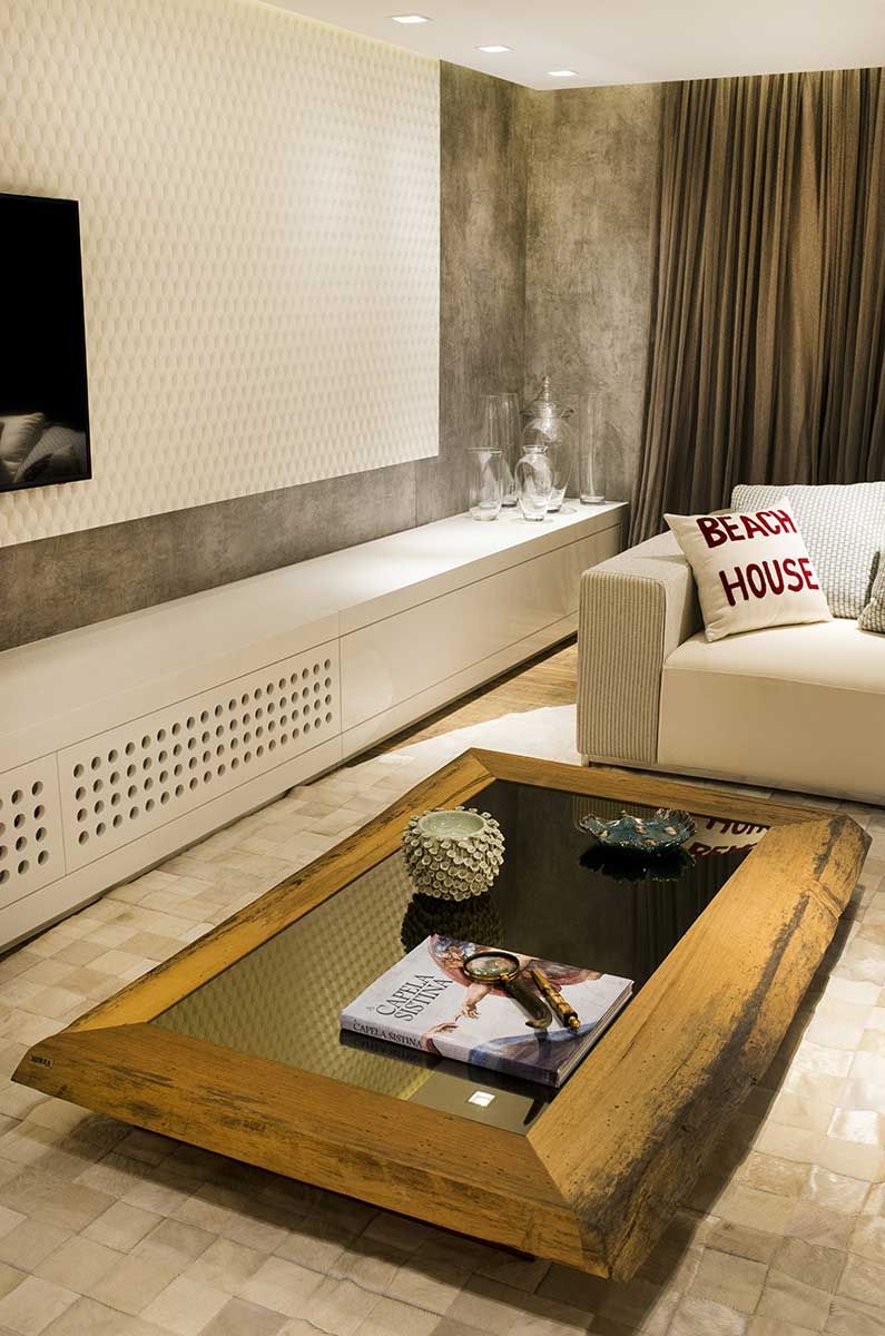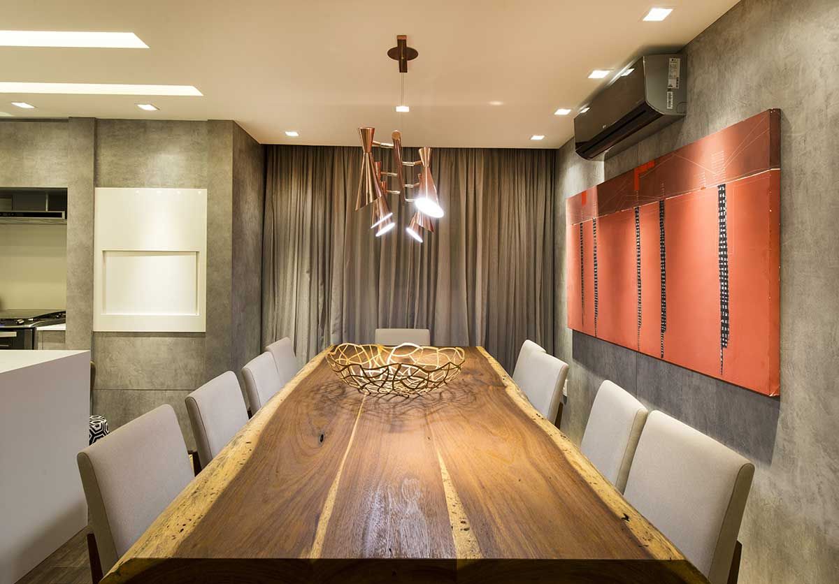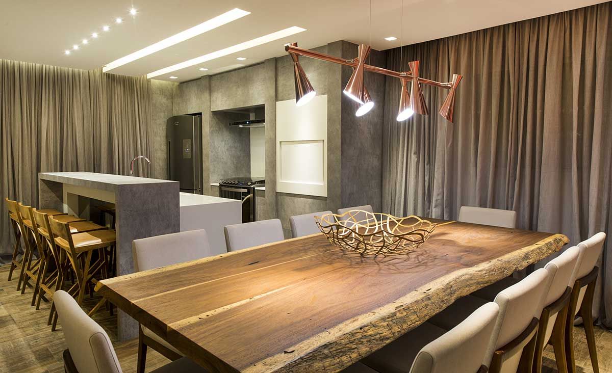 A cozinha com churrasqueira fica ao centro do living, separada apenas por um buffet e servindo também ao terraço. Ao fundo da sala, um armário para louças com portas de espelho bronze abriga também uma floreira. A sala de jantar possui uma mesa rústica de madeira natural com pé de vidro Sierra e cadeiras em linho cru. Acima, um pendente em cobre da Estação da Luz.