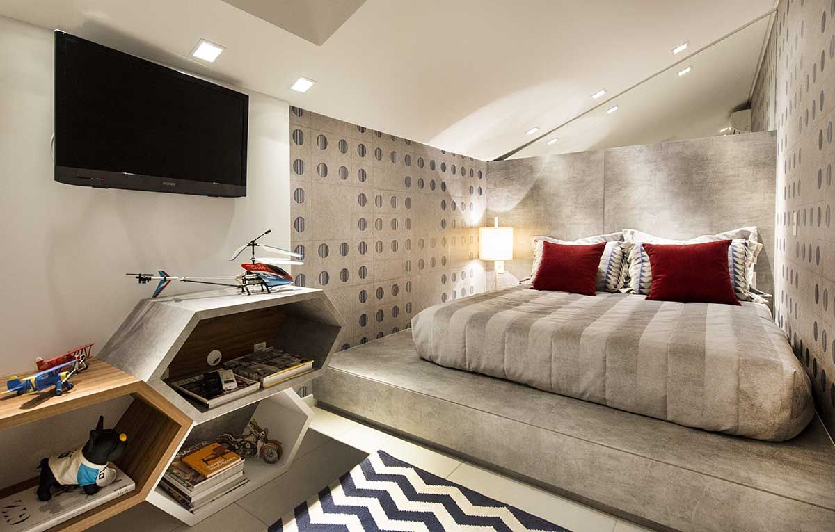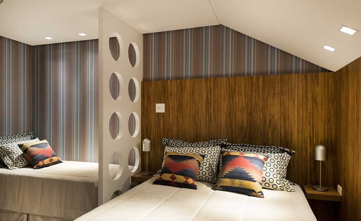 O quarto do casal foi dividido com um painel vazado de bolas em laca alto brilho, dividido em duas camas, uma de solteiro, para a criança. Já o quarto do rapaz, por ser no sótão, tem o pé direito baixo. Para contornar a altura do ambiente, valorizando-o, os arquitetos criaram um tablado em concreto onde fica o colchão.